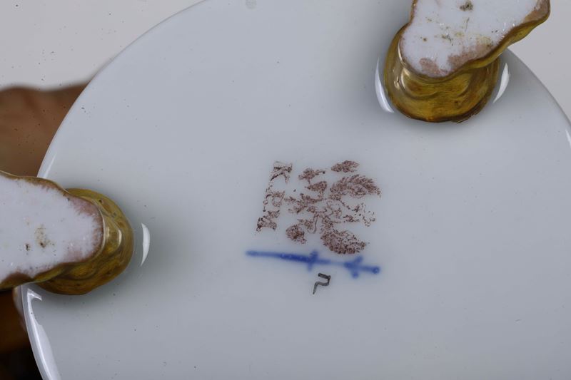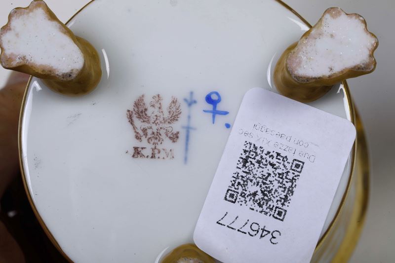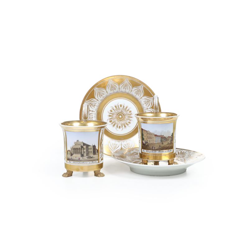 Porcellana. Marca: scettro in blu, aquila con “K.P.M” in bruno. Dimensioni: altezza tazza cm 13,5; diametro piattino cm 18,2. Conservazione: buona; parte del piedino di una tazza mancante; insignificanti usure all’oro dei piattini.