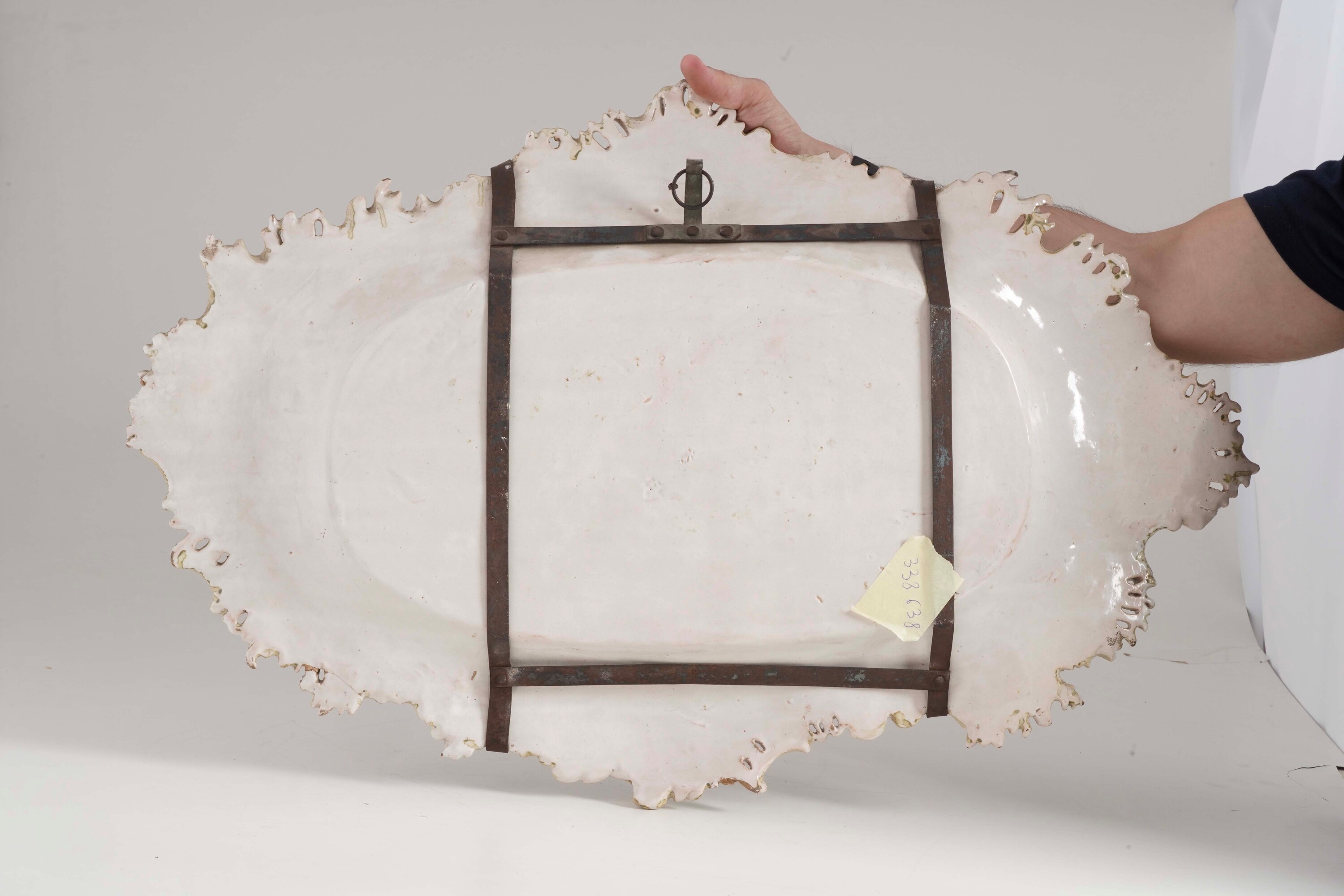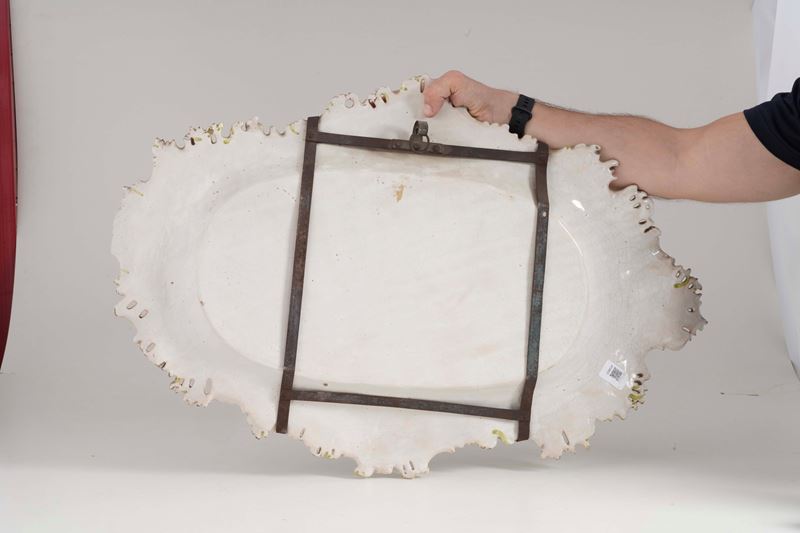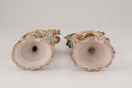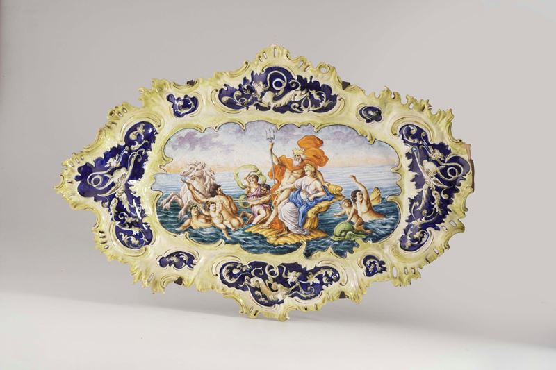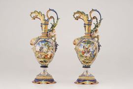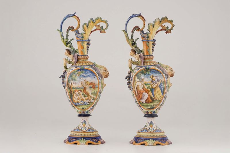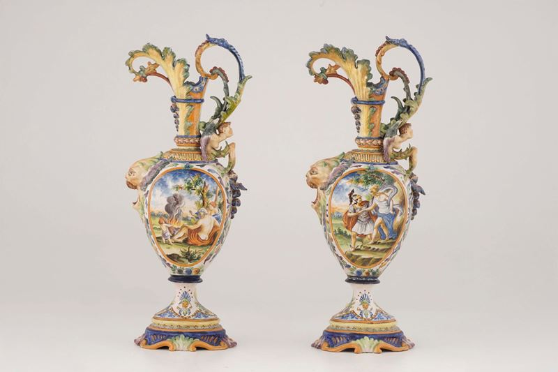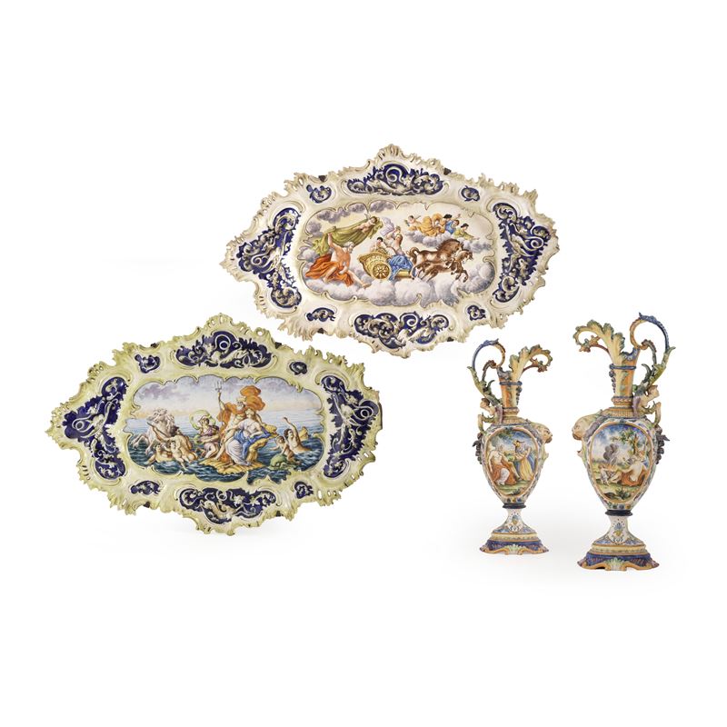 Maiolica policroma con scene mitologiche. Marca: assente. Dimensioni: vassoi cm 80 x 52; altezza versatoi cm 57,5 circa. Conservazione: buona; ogni vassoio con una rocaille al bordo incollata o mancante; mancanze minori; vasi con restauro all’attacco tra corpo e base, restauri e mancanze minori.
