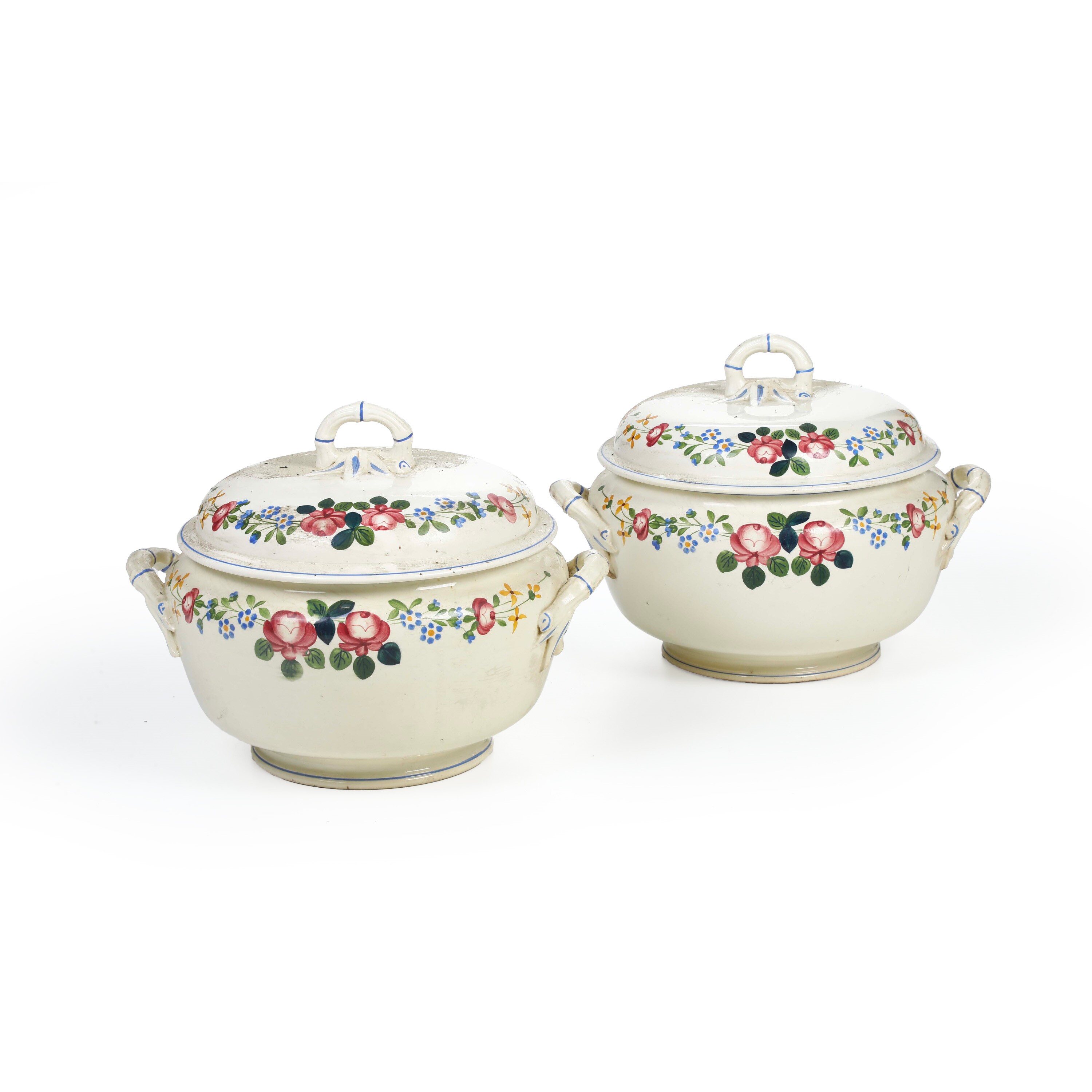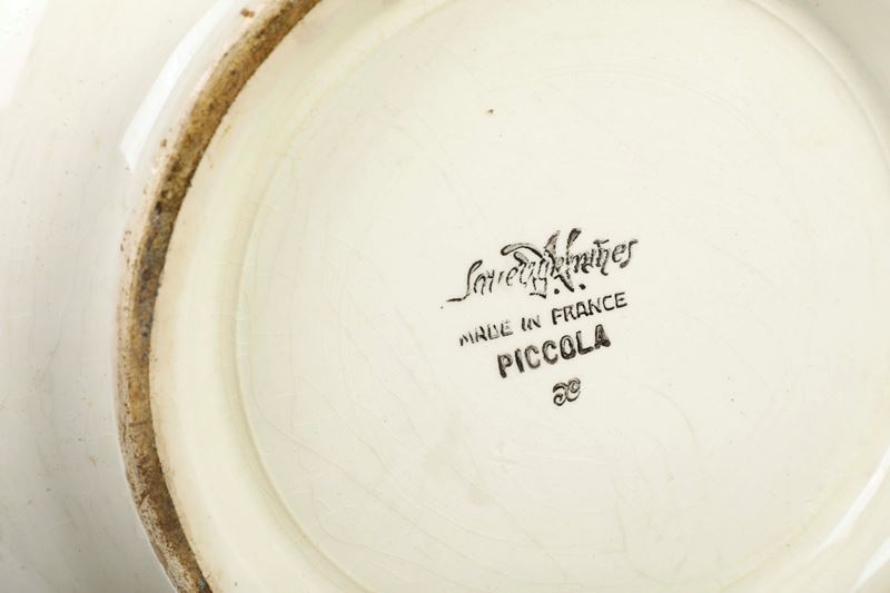 Terraglia. Marca: “Sarreguemines”. Altezza cm 23. Conservazione: le due zuppiere con sbeccatura al bordo superiore