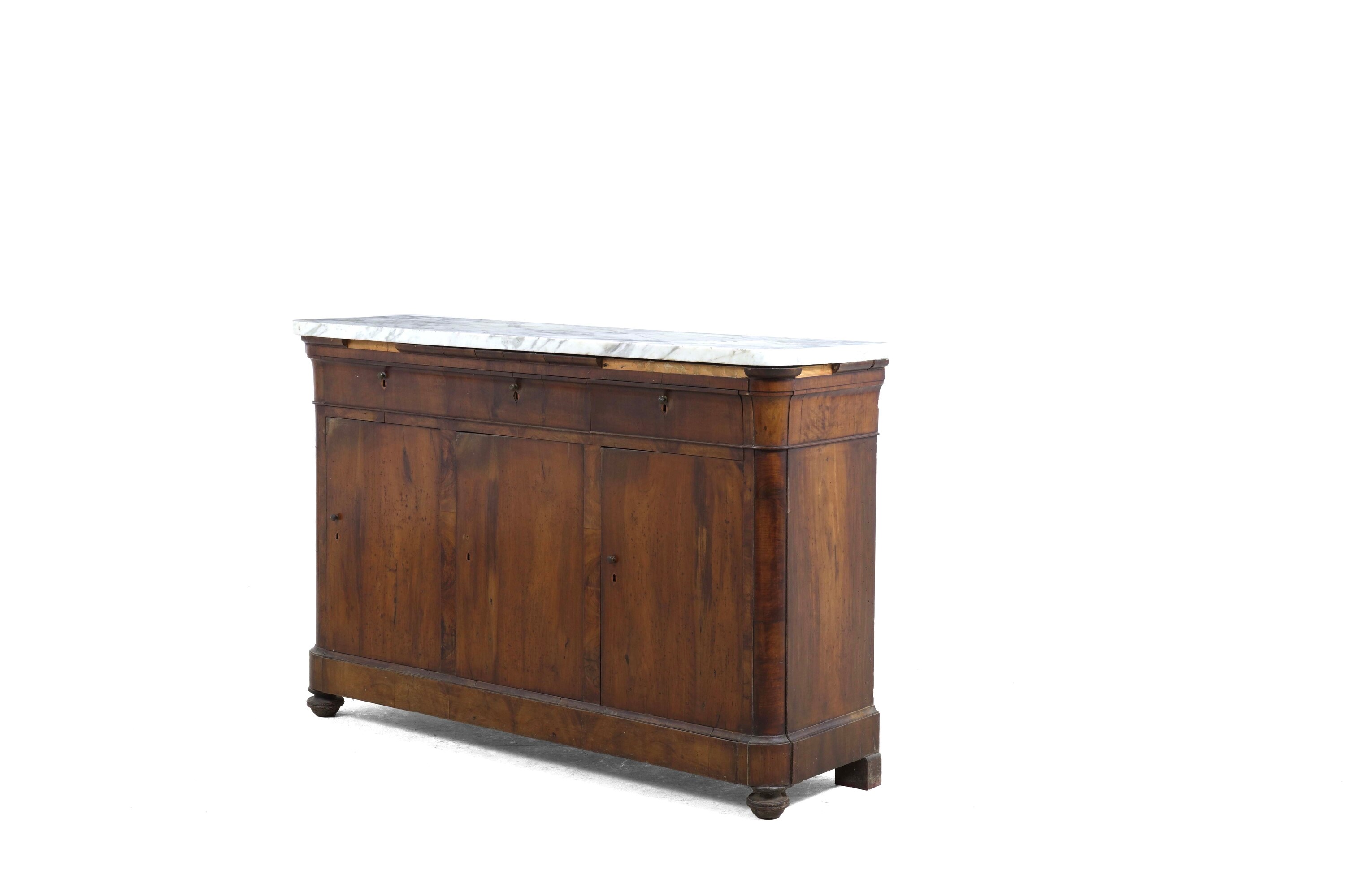 Lastronata in piuma di noce. Fronte a tre ante sormontate da cassettini, angoli smussati, piano in marmo