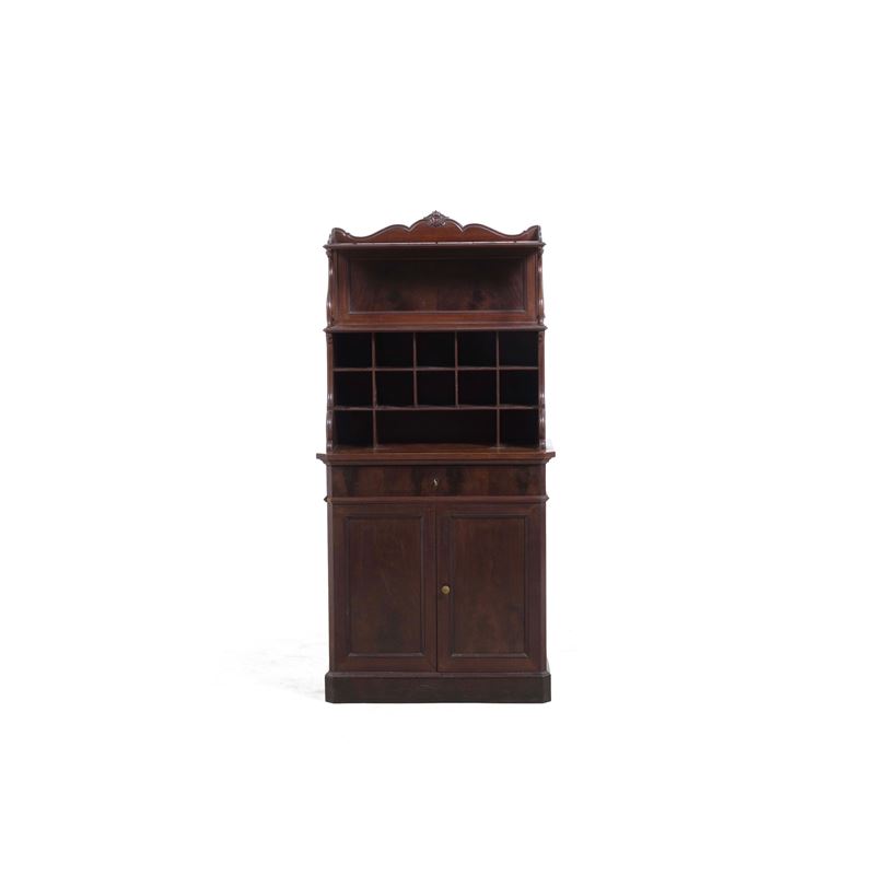Legno intagliato. Fronte a due ante e cassetto. Alzata a etagere con montanti a volute e scaffalatura portalettere nel primo ripiano