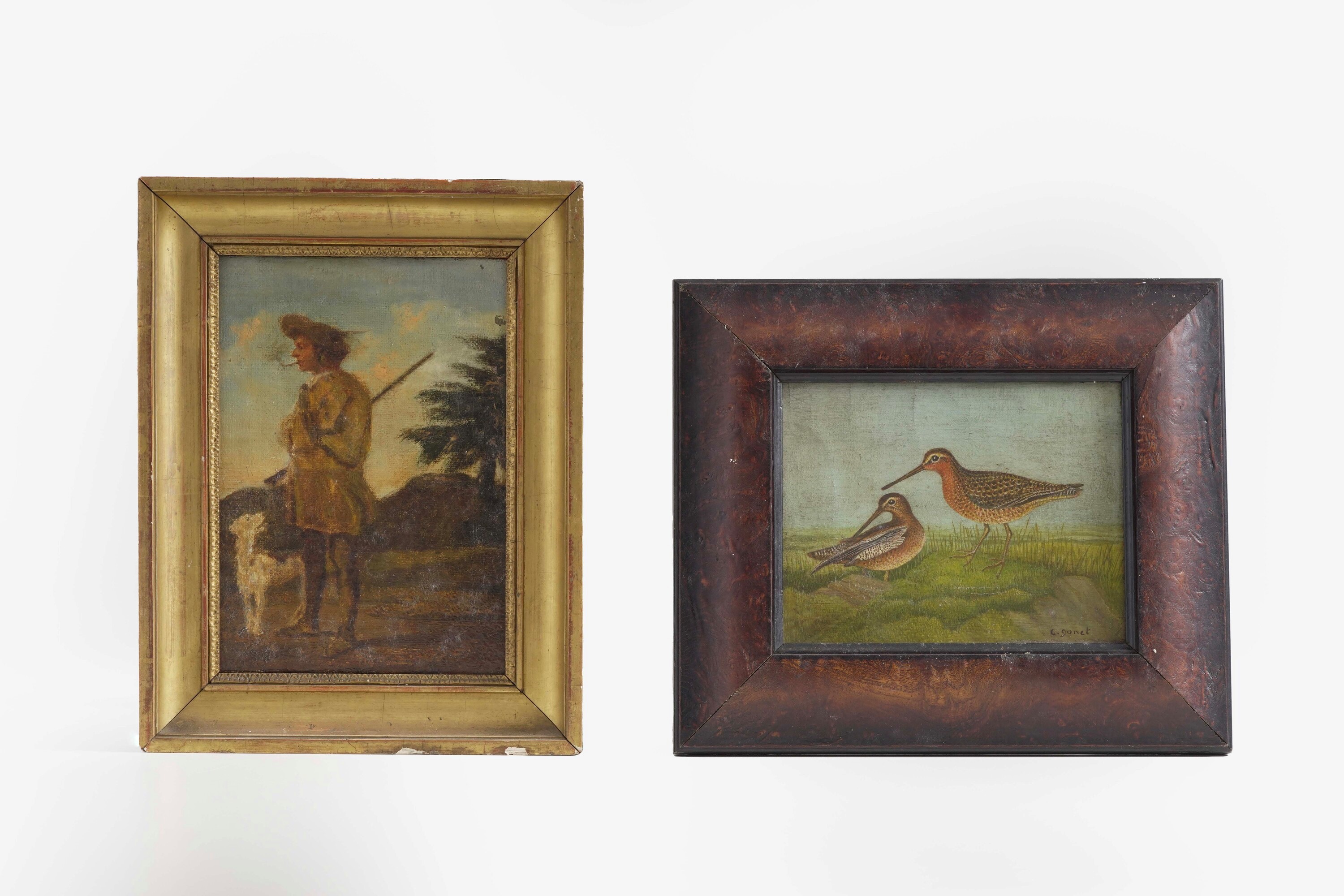 Due dipinti ad olio su tela. XIX-XX secolo Cacciatore con cane Beccacce