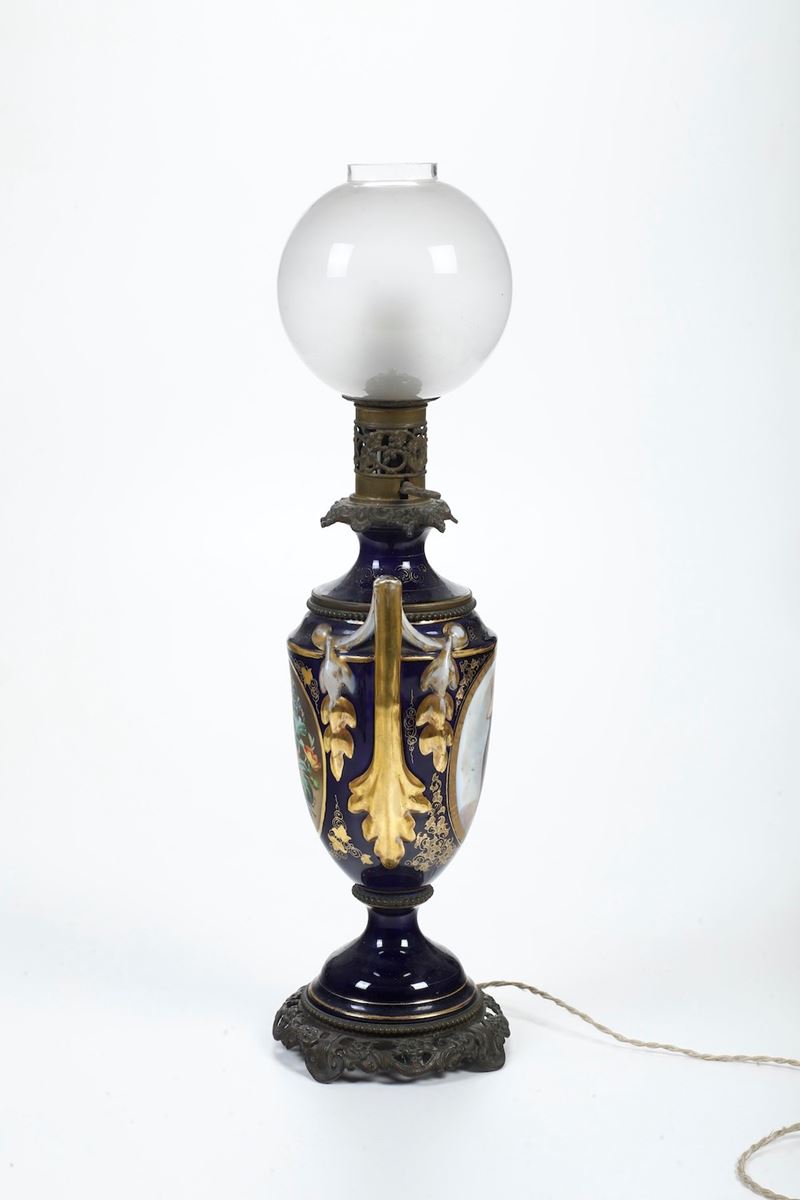 Porcellana, metallo e vetro. Altezza totale cm 67. Conservazione: qualche usura all’oro