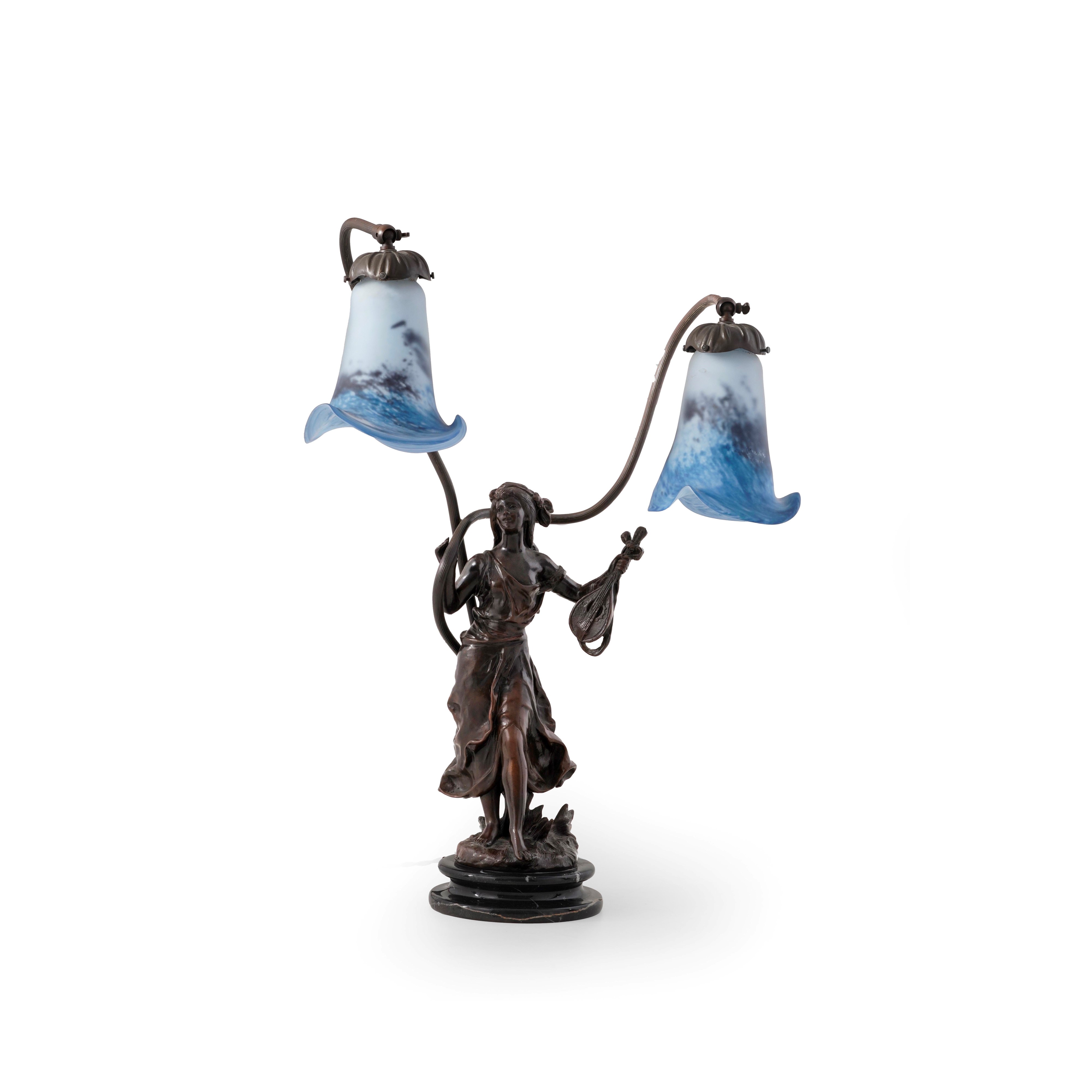 A due luci, fusto a foggia di donna che regge un liuto, base in marmo nero