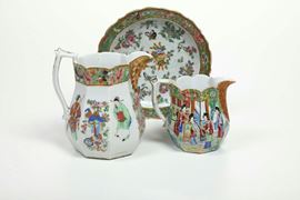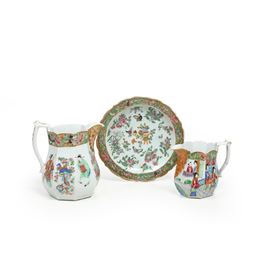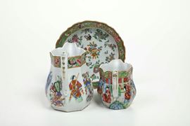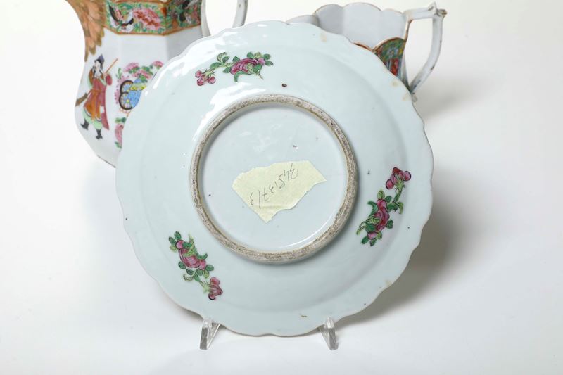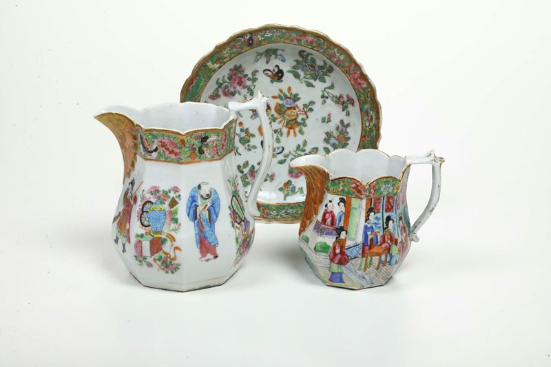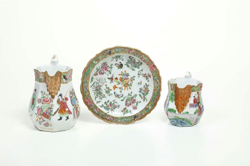 Lotto composto da tre oggetti in porcellana raffiguranti scena di corte con decori a motivi floreali, Canton, Cina, XX se [..]