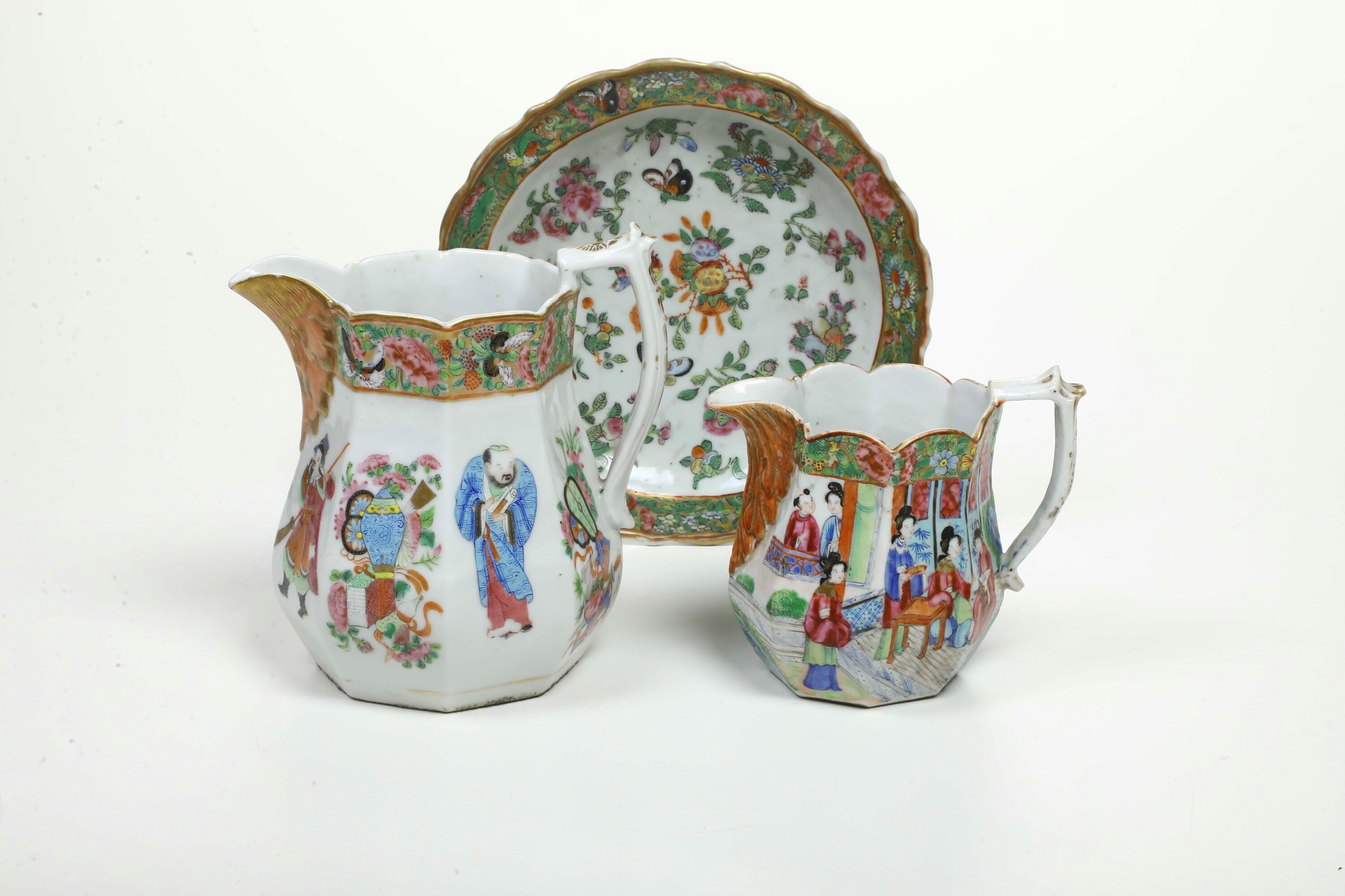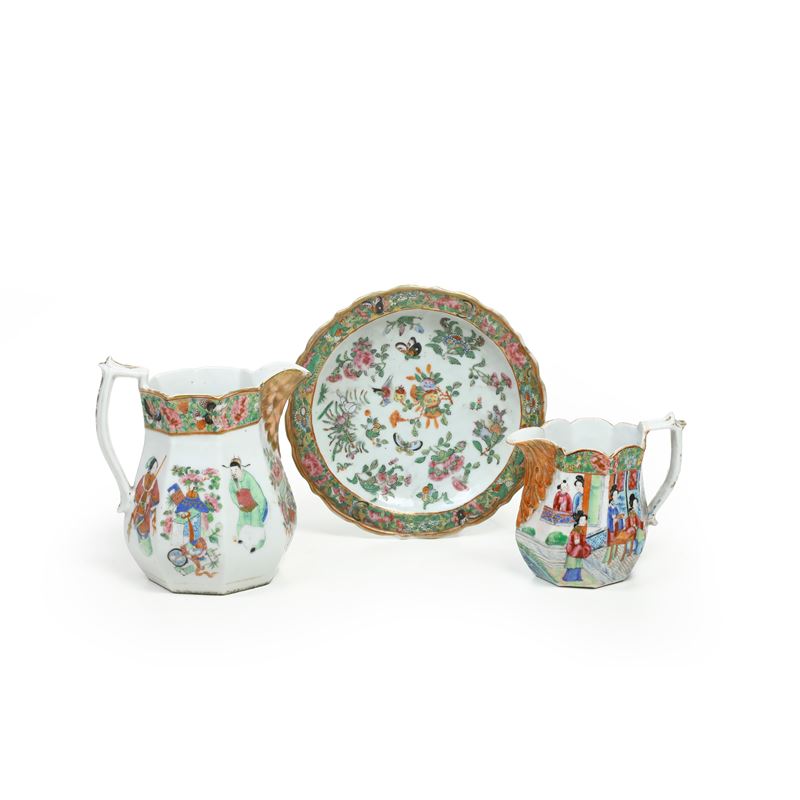 Lotto composto da tre oggetti in porcellana raffiguranti scena di corte con decori a motivi floreali, Canton, Cina, XX secolo