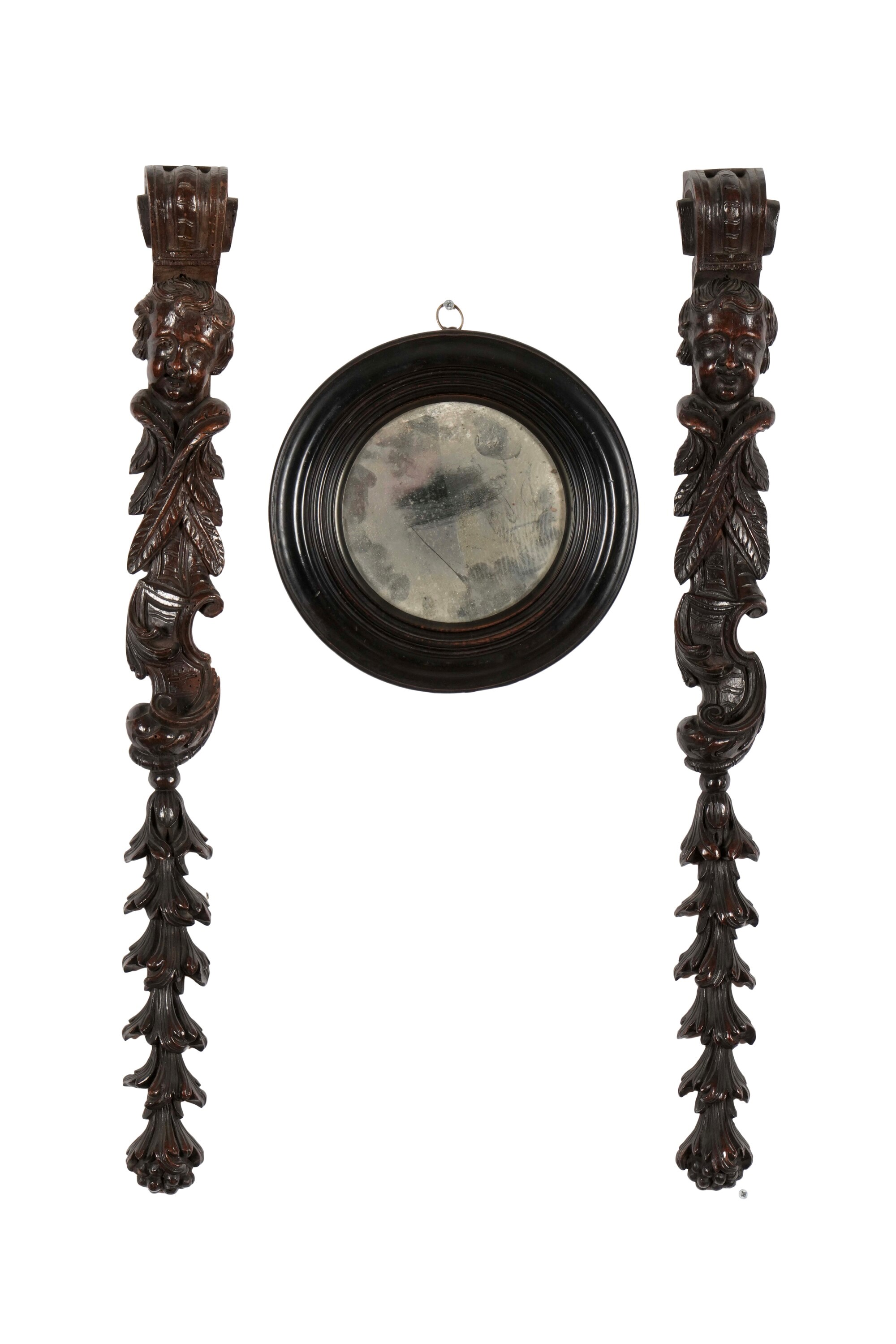 Lotto composto da una coppia di fregi e un piccolo specchio in legno. XVII-XVIII secolo