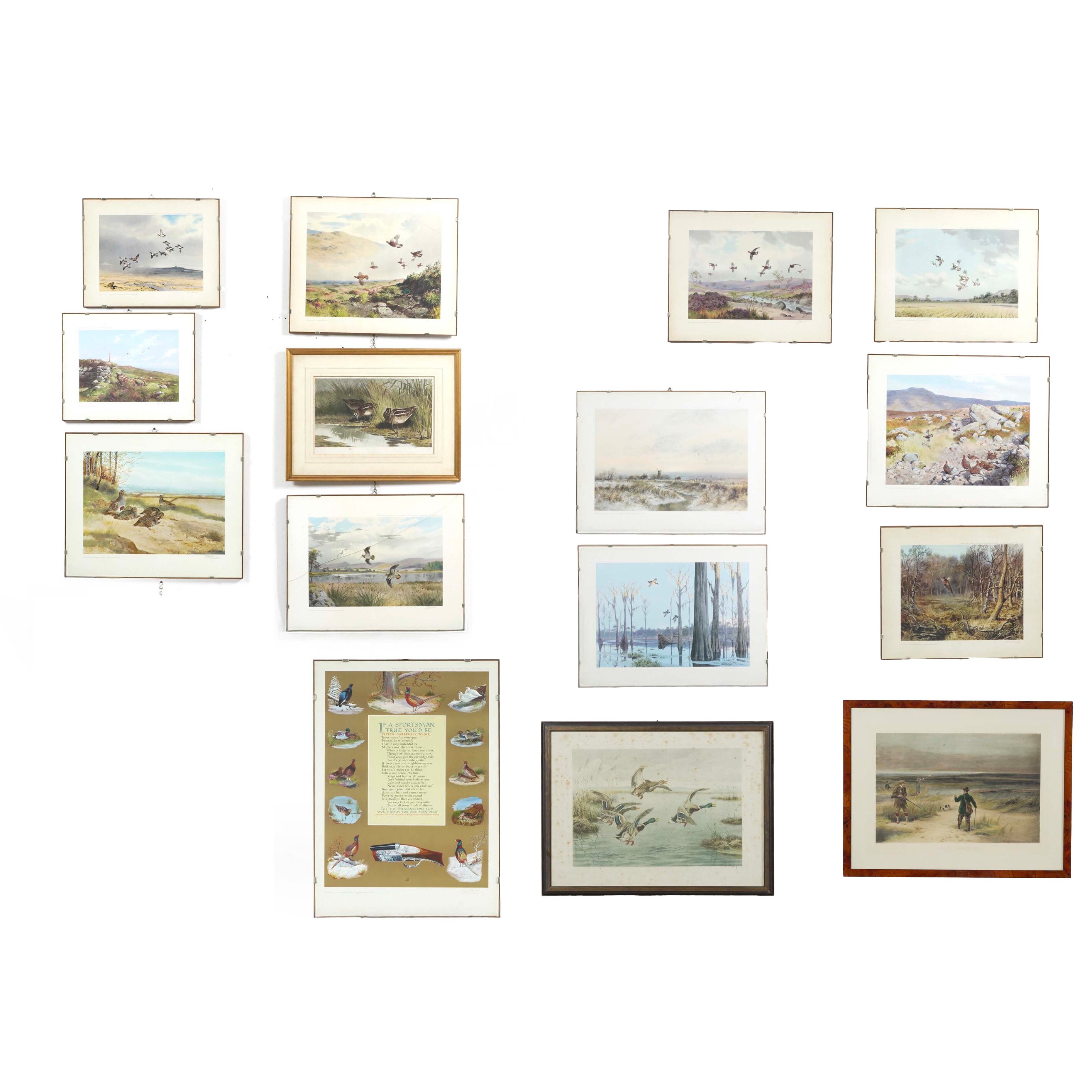 Lotto di 15 stampe con scene di caccia e cacciagione