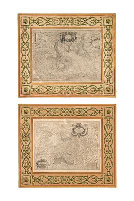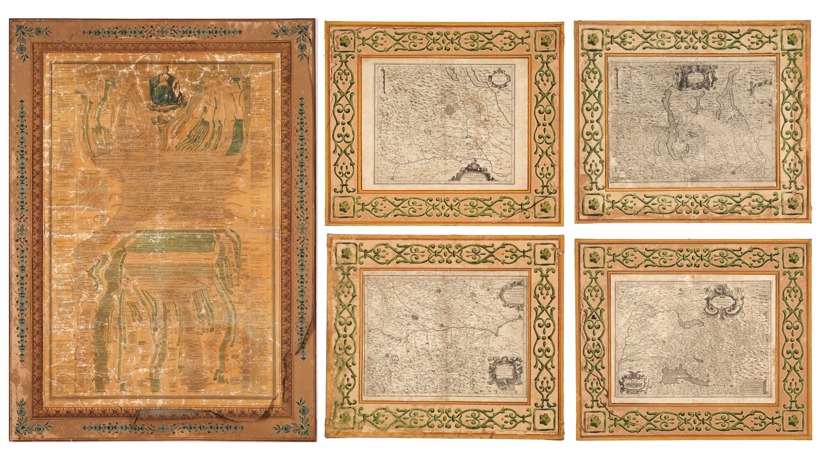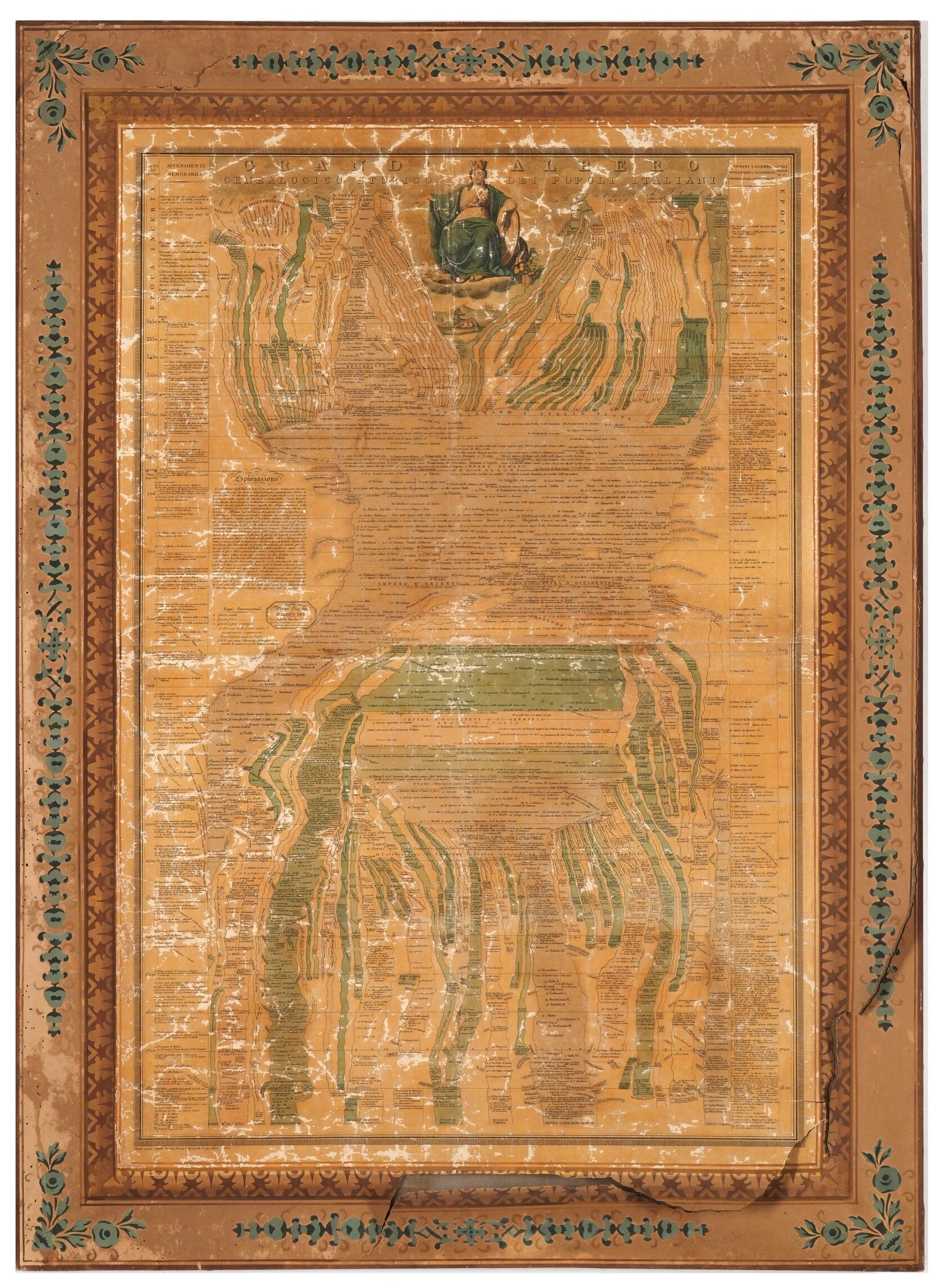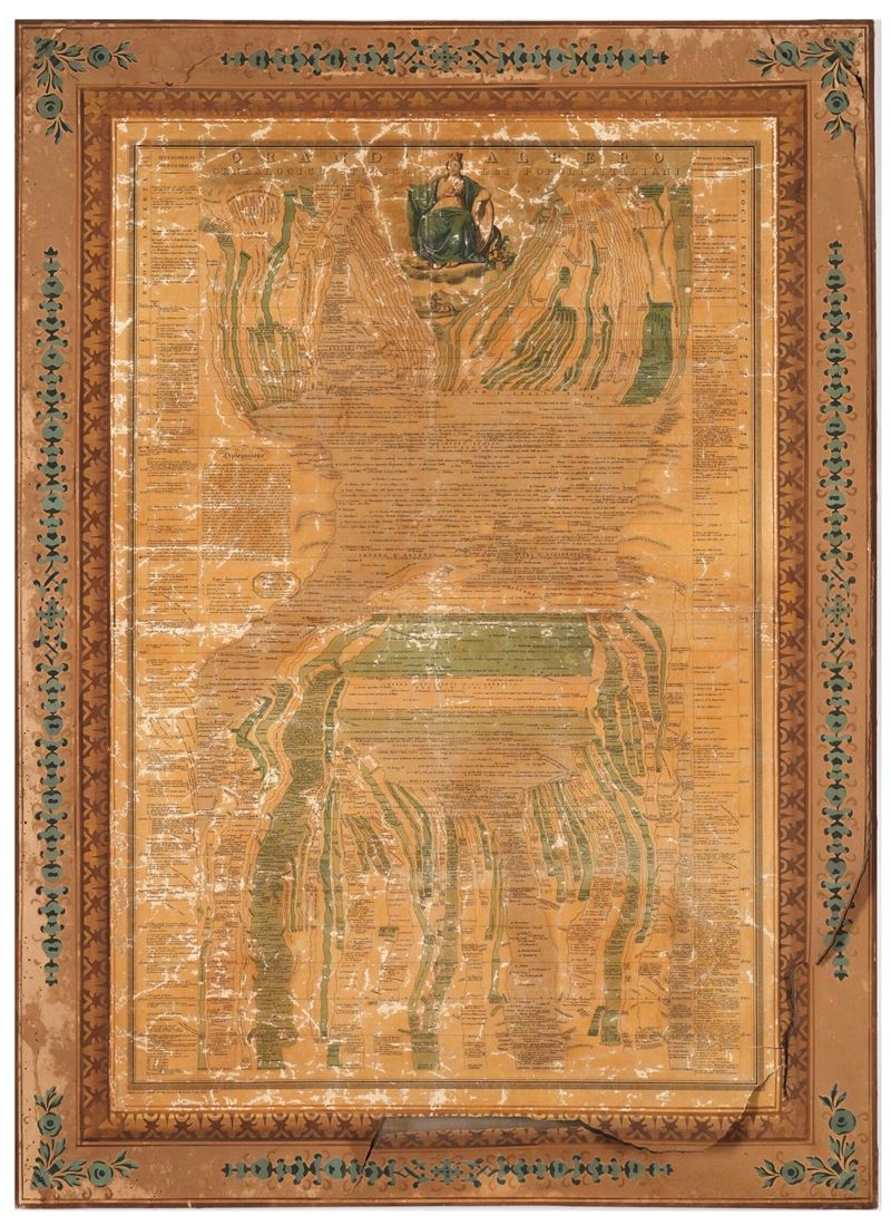 Si aggiunge nel lotto "Grande albero genealogico storico dei popoli italiani" edito Achille Stucchi (edizione del XIX-XX secolo), pure montata su tela ed entro antico passepartout. Alcune abrasioni e rotture alla carta e al passepartout.