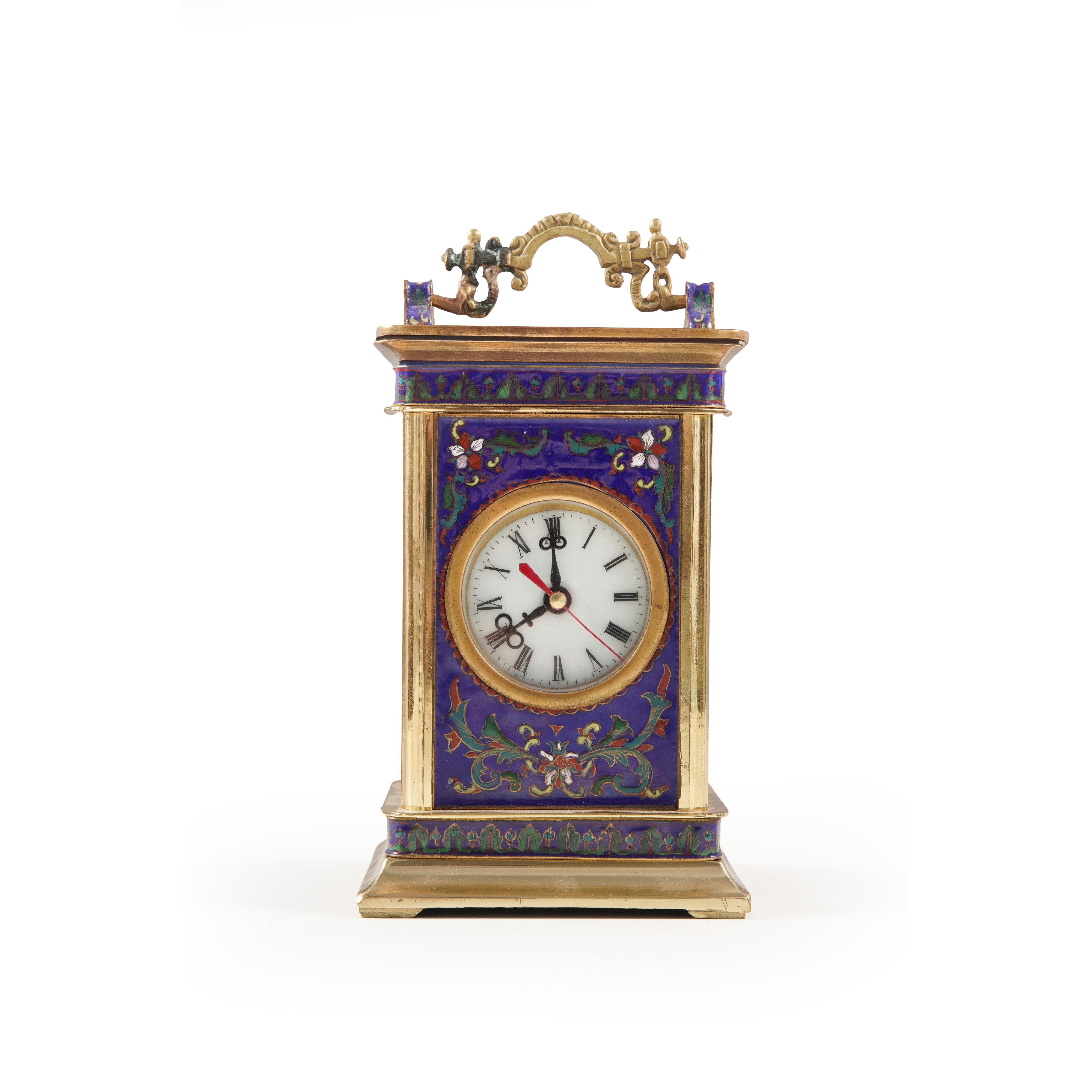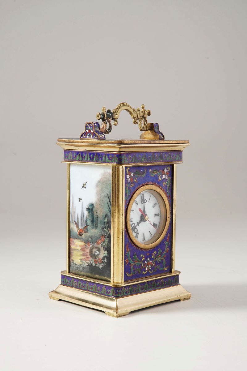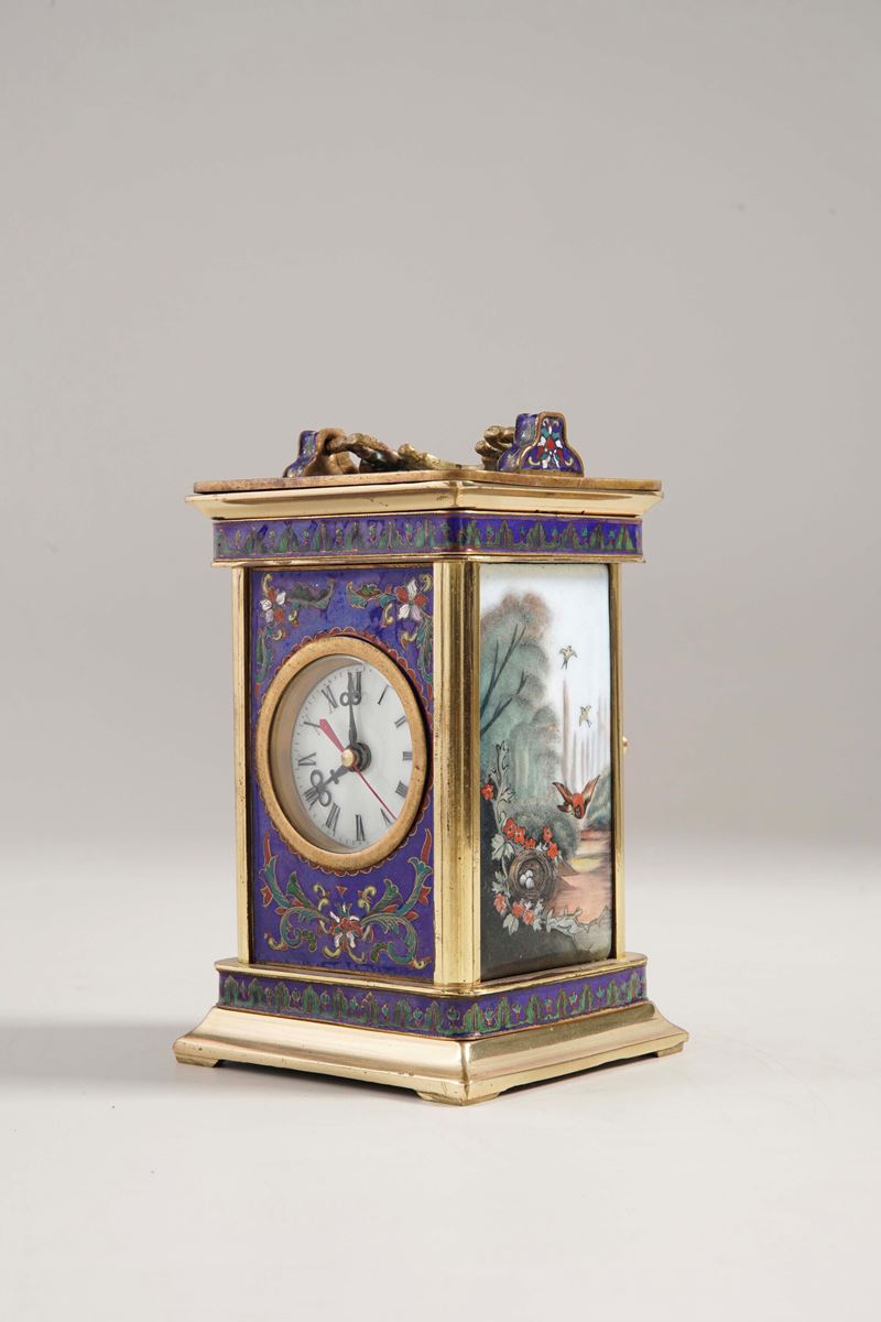 Bronzo dorato e smalti. Sul fronte decoro floreale su fondo blu, sui lati decoro a paesaggi, quadrante in smalto bianco con numeri romani