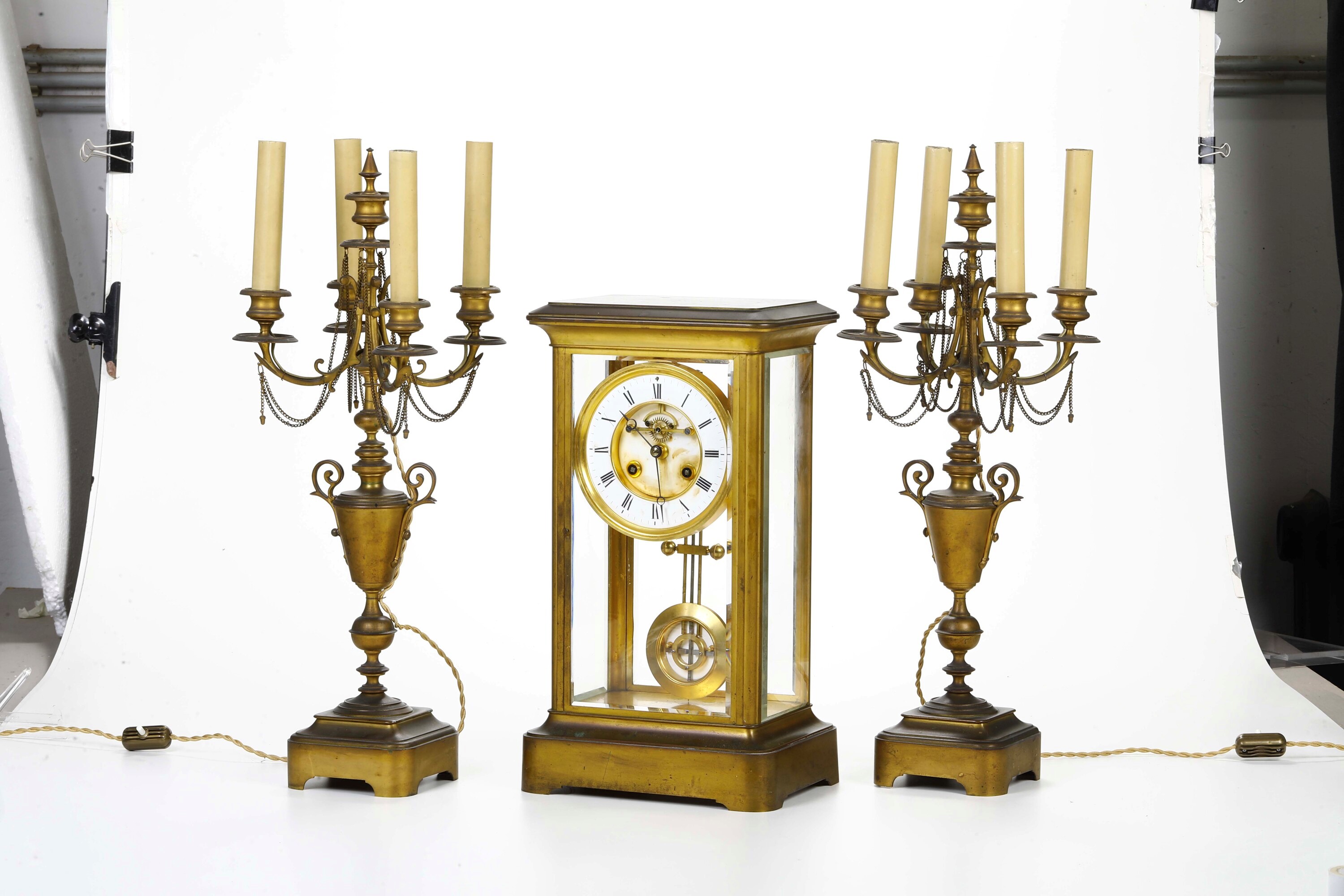 Orologio e coppia di candelabri. Francia, fine XIX secolo
