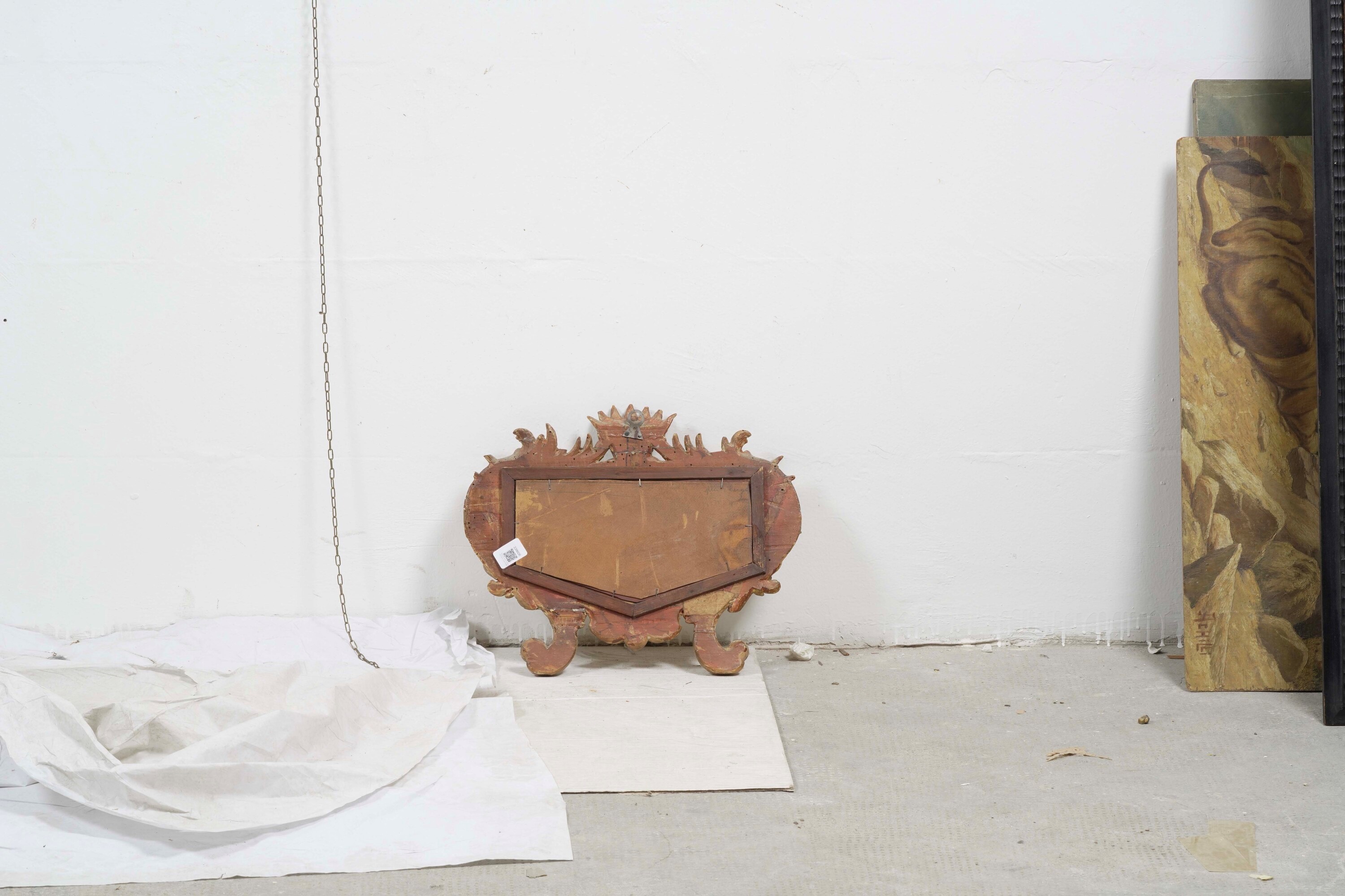 Legno intagliato e dorato (ridorata). Riserva sagomata, base a volute, fascia decorata a motivi fitomorfi, cimasa a corona, in basso cartiglio con data "1692"