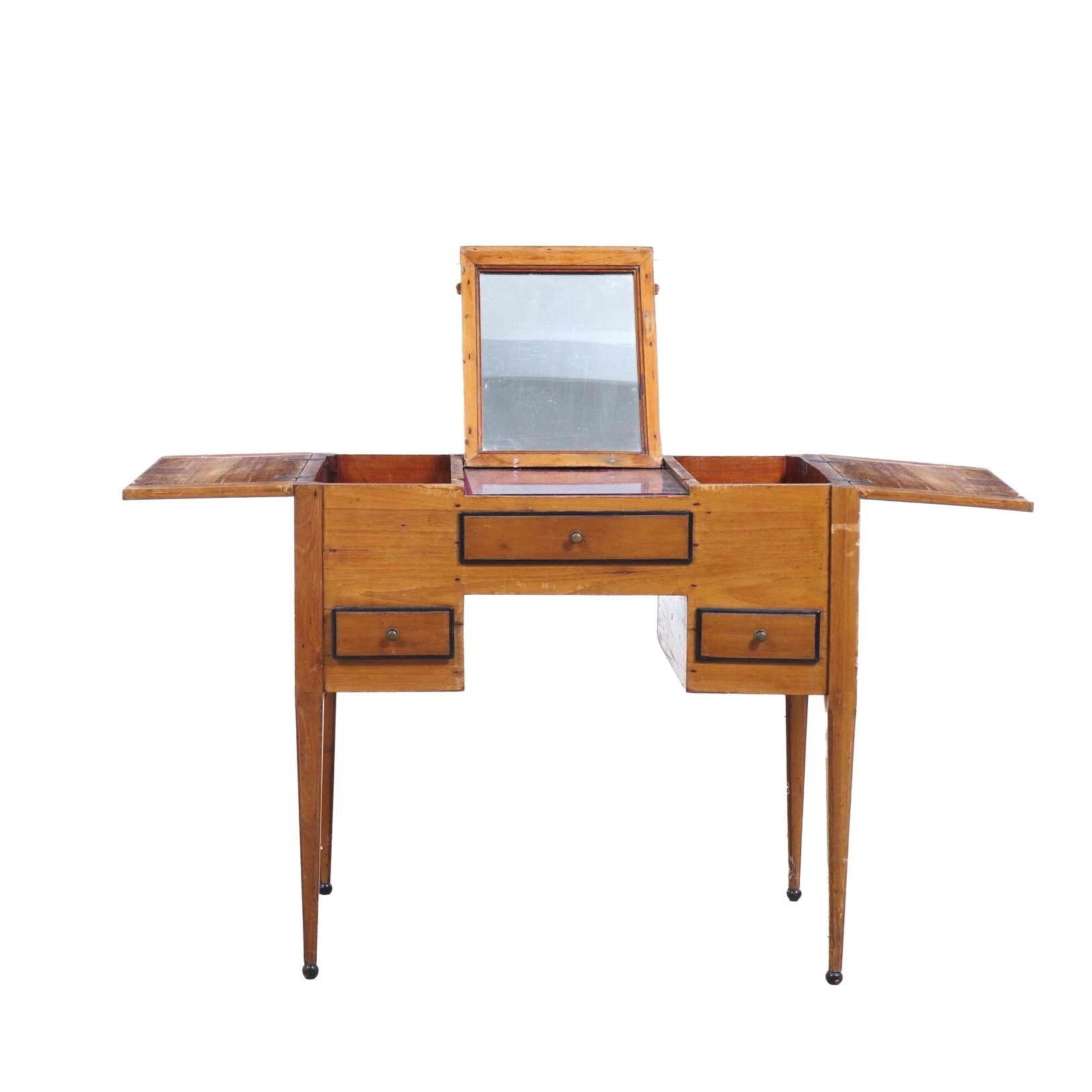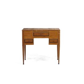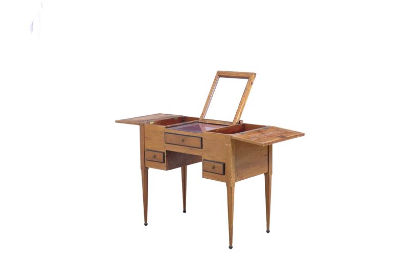 Fronte a tre cassettini, piano con scomparti apribili; uno cela una specchierina