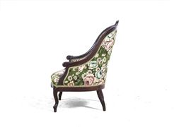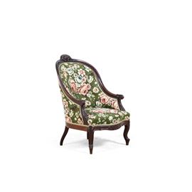 Schienale sagomato con braccioli a volute, imbottita, piedi torniti, cimasa intagliata a conchiglia