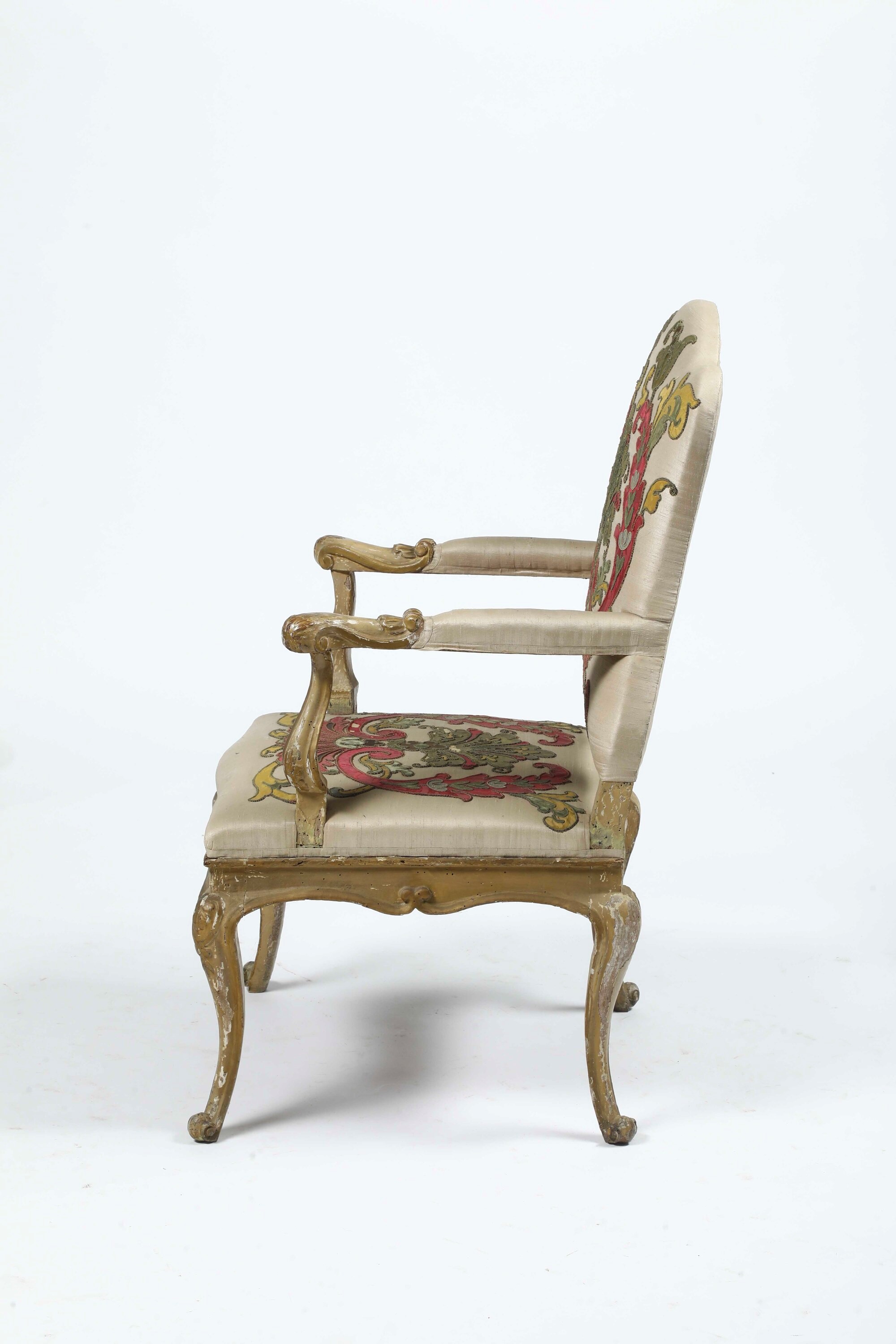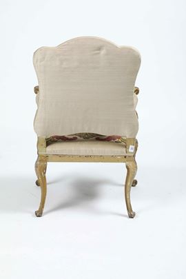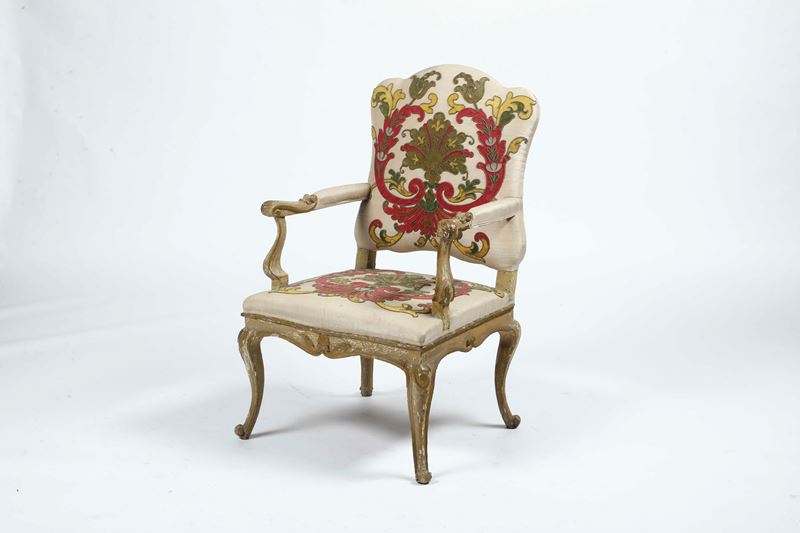 Legno intagliato, laccato e dorato. Gambe e braccioli mossi, schienale sagomato, imbottita (restauri, lacca di epoca posteriore)