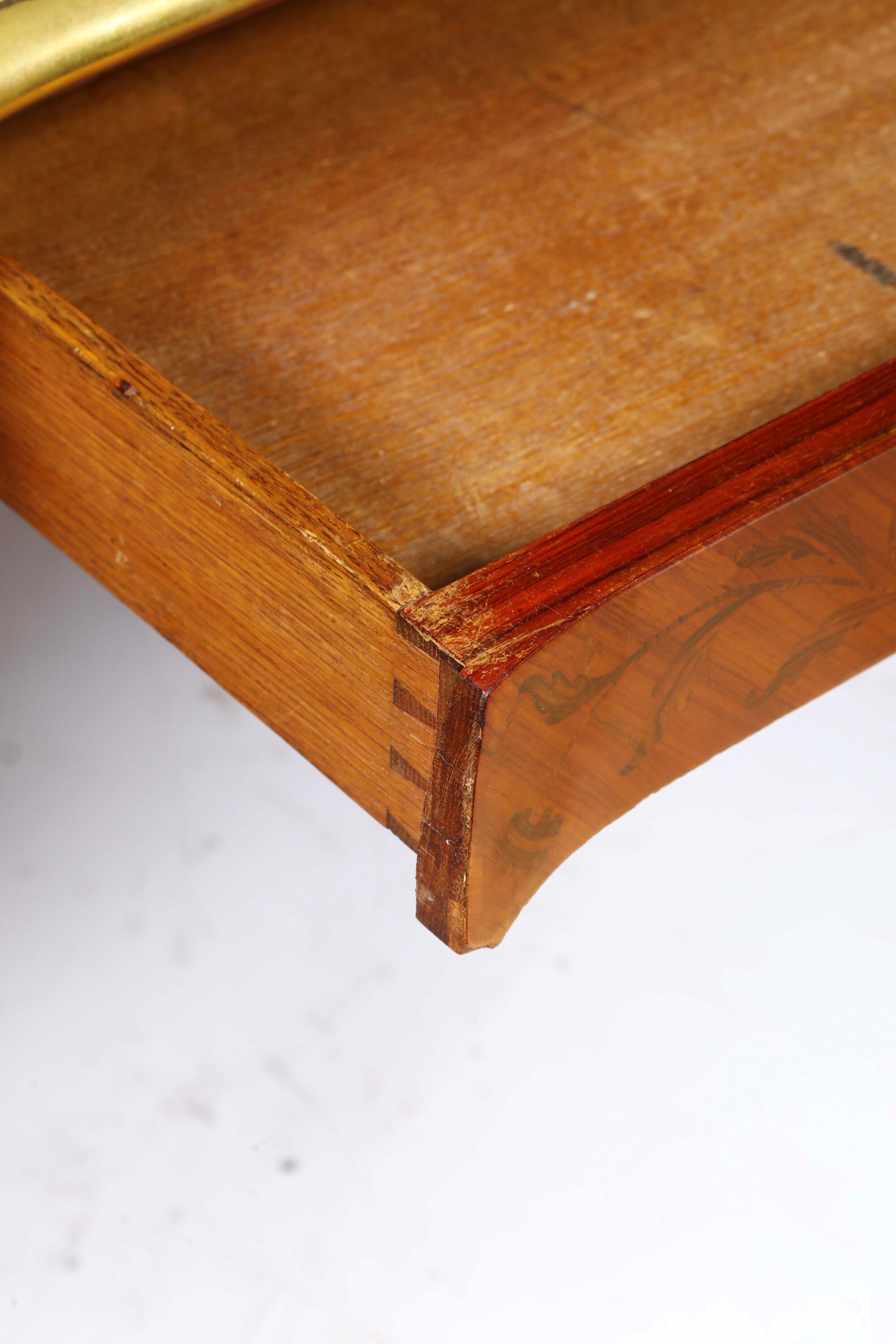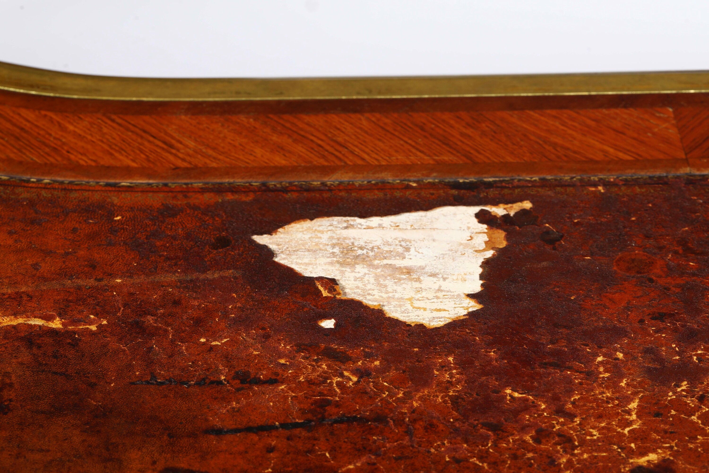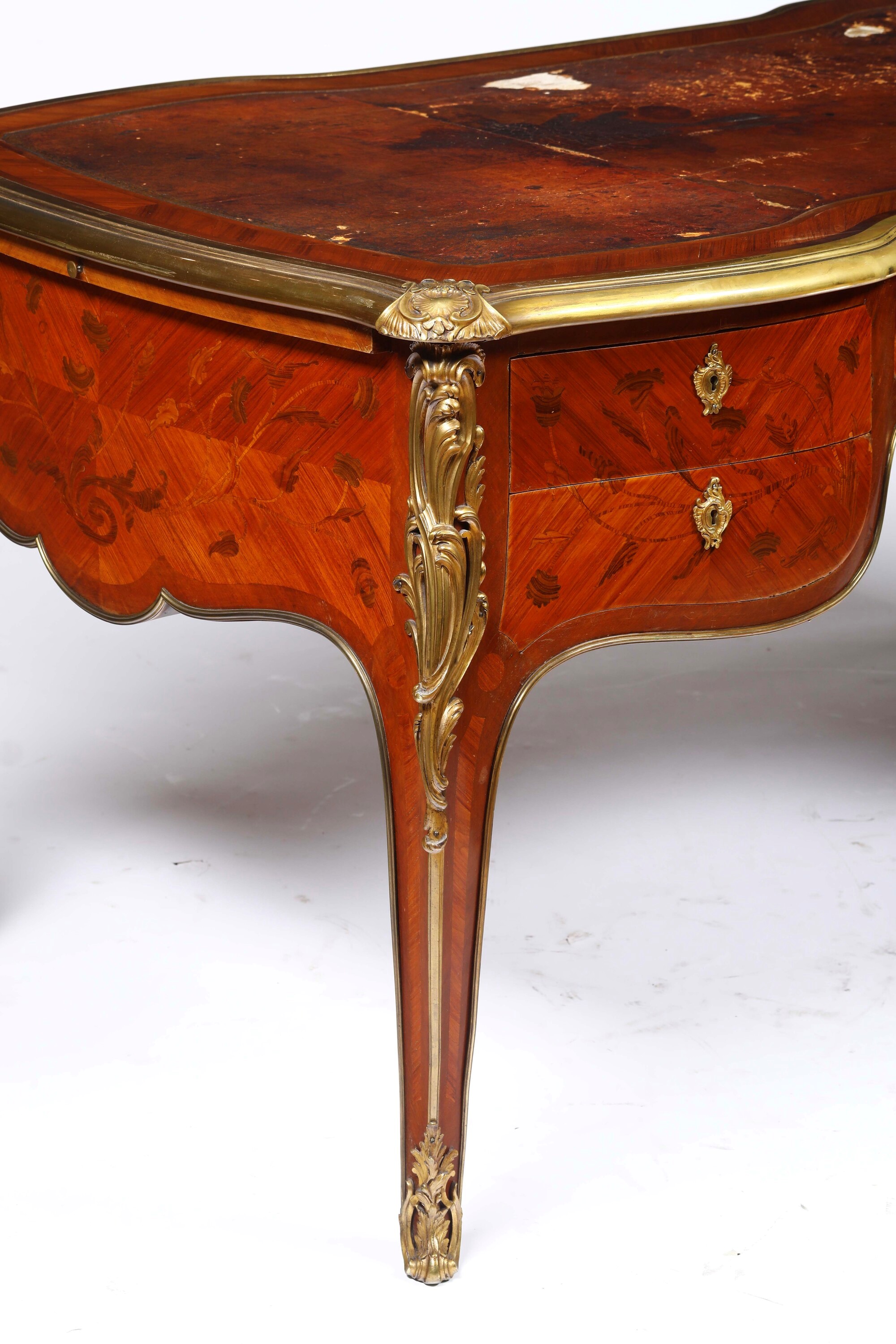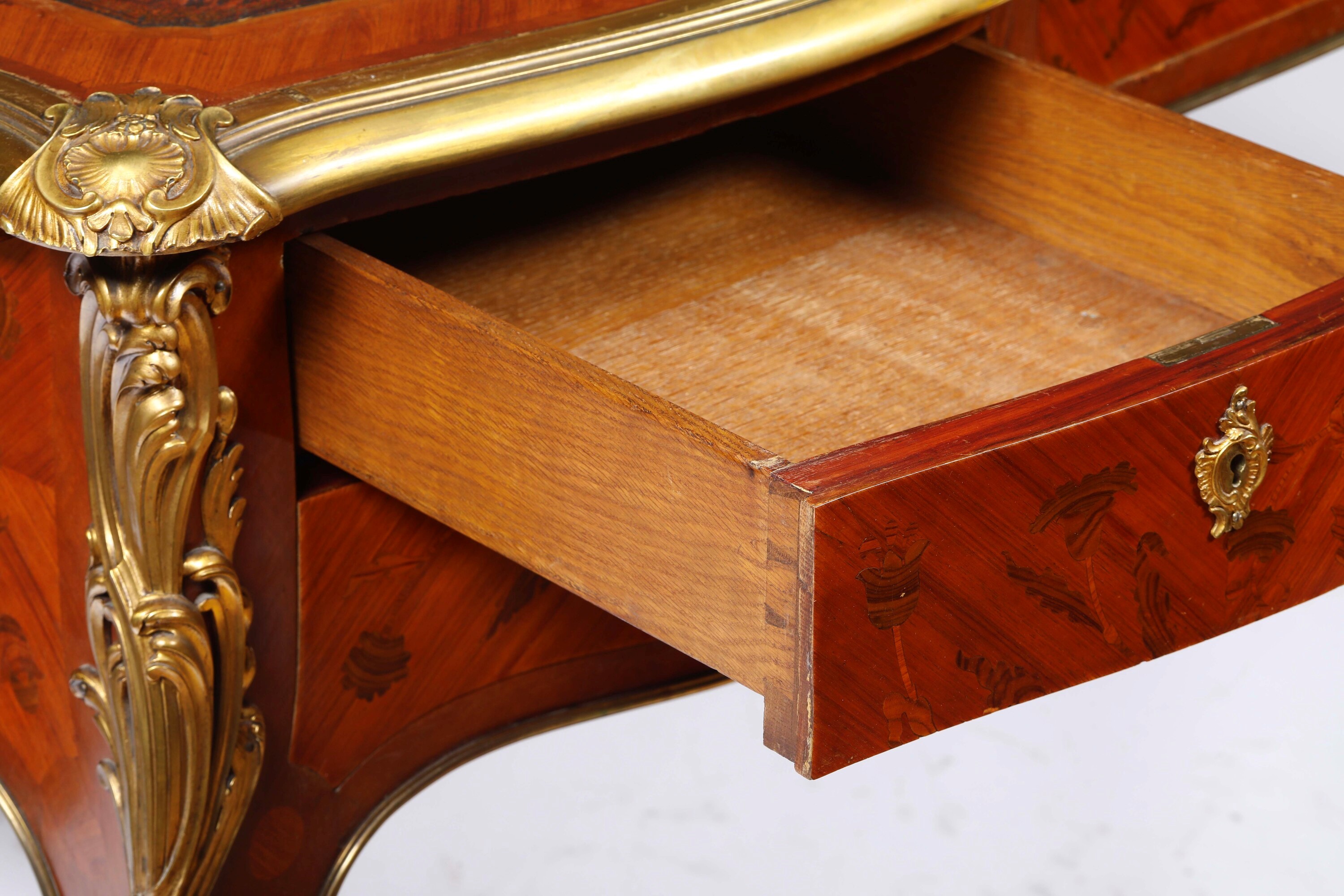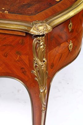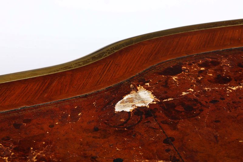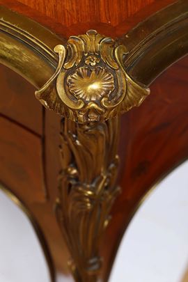 Fronte a un cassetto centrale e due cassettini per lato, piano sagomato e foderato in cuoio, profili e applicazioni decorative rocaille in bronzo dorato, gambe mosse