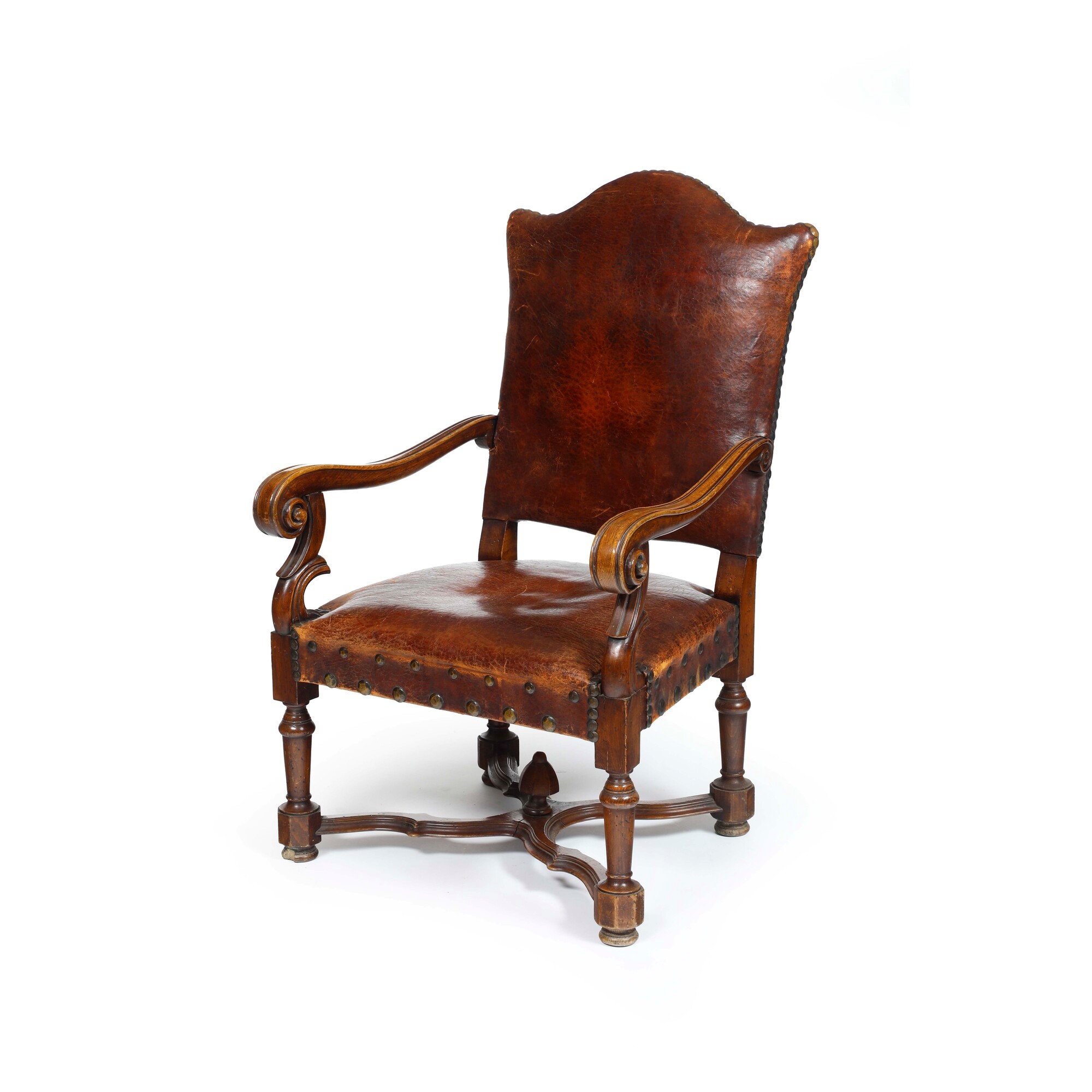 Imbottito e rivestito in pelle, schienale sagomato, braccioli a volute, gambe rastremate riunite da traverse mosse
