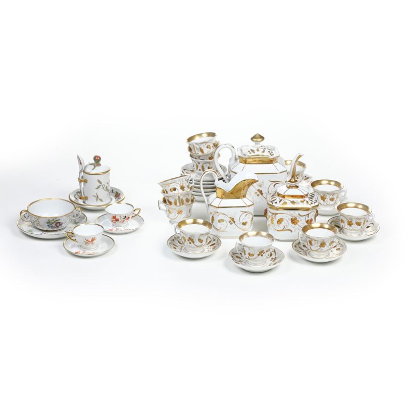 Porcellana. Marca: assente. Conservazione: buona; usure all’oro; manico di una tazza incollato.