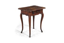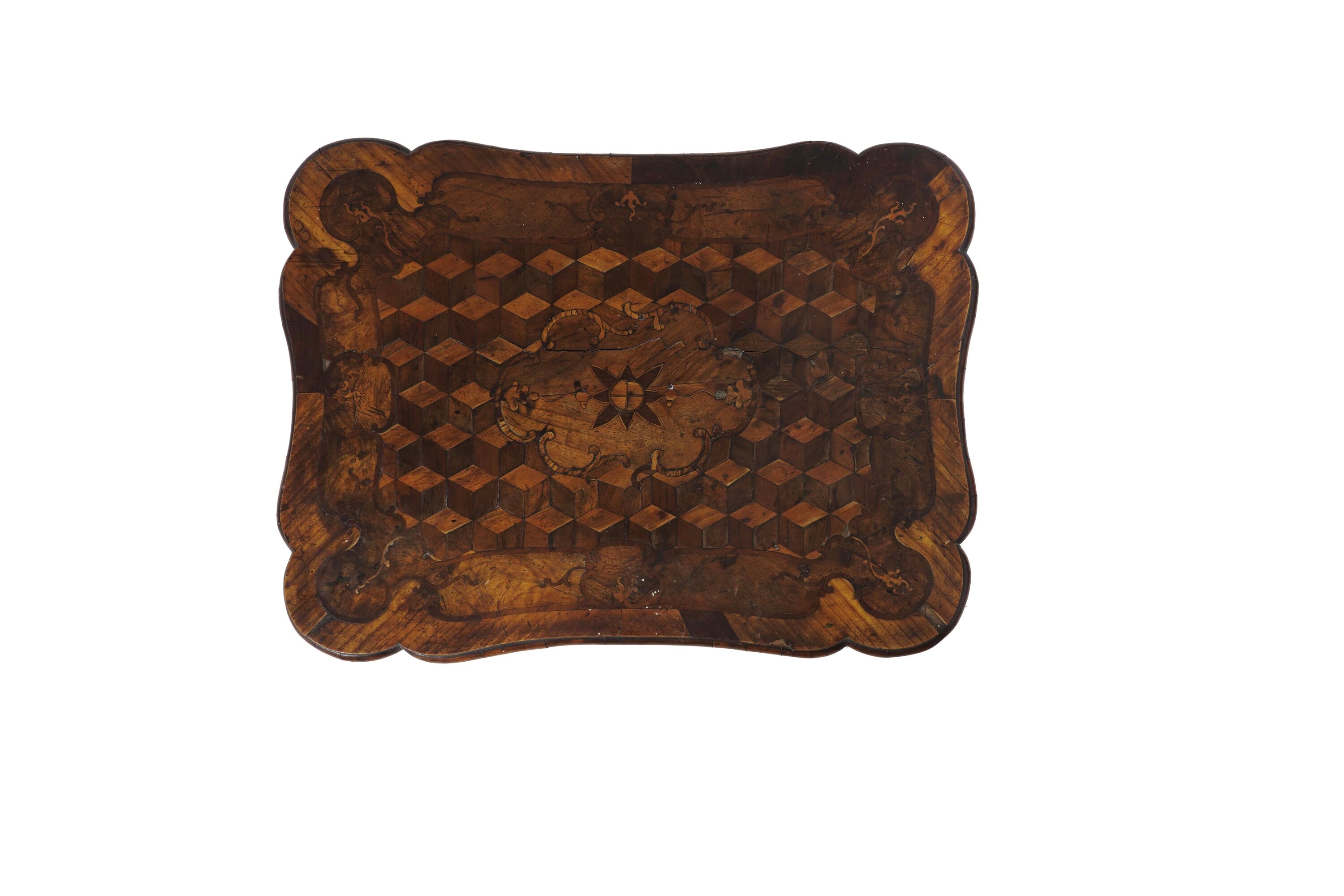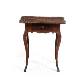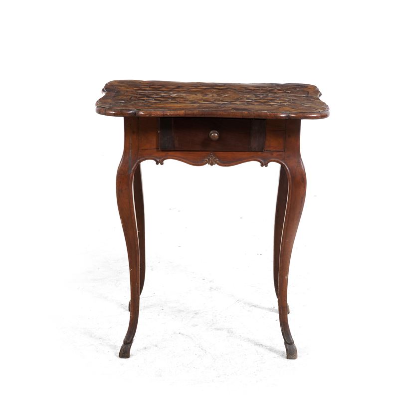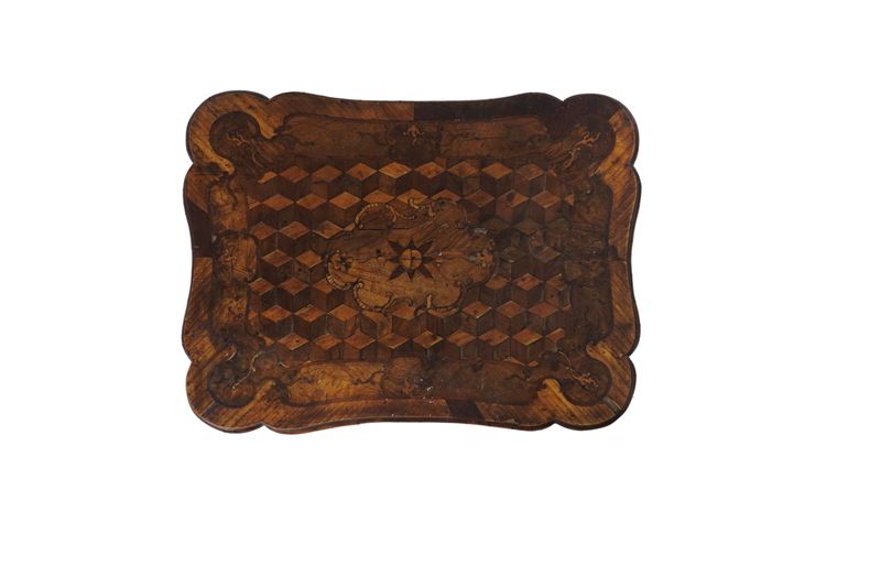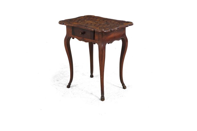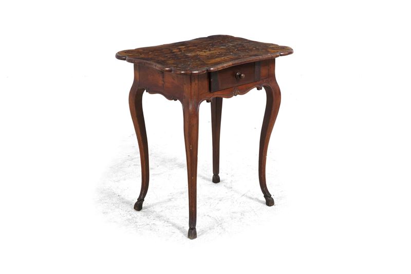 Piano sagomato a forma mistilinea e intarsiato con marqueterie geometrica centrata da fiore stilizzato, cassetto sottopiano, alte gambe mosse