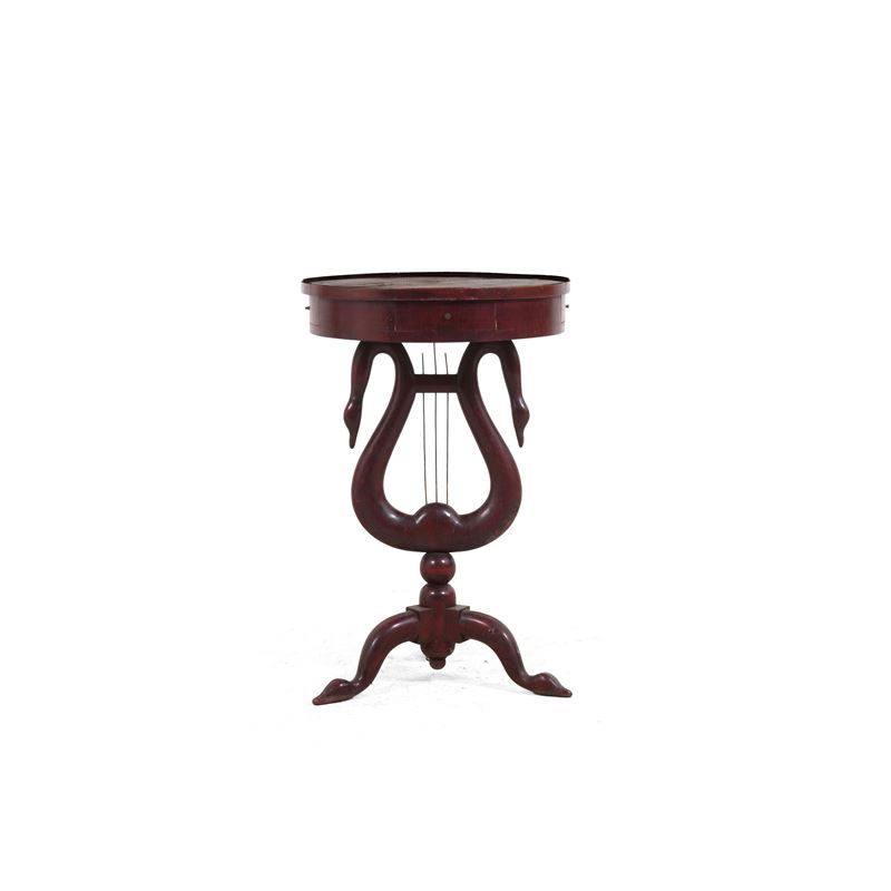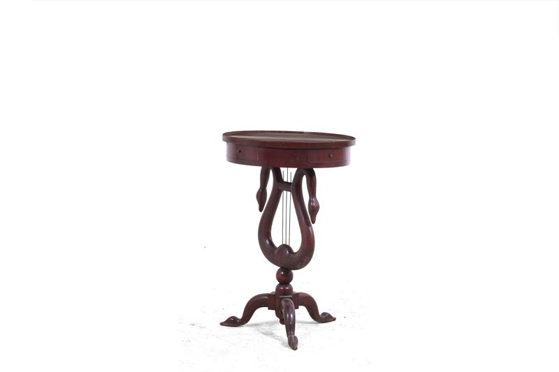 Fusto a lira con terminali a cigno, tripode con piedi a testa di cigno, un cassetto nella fascia