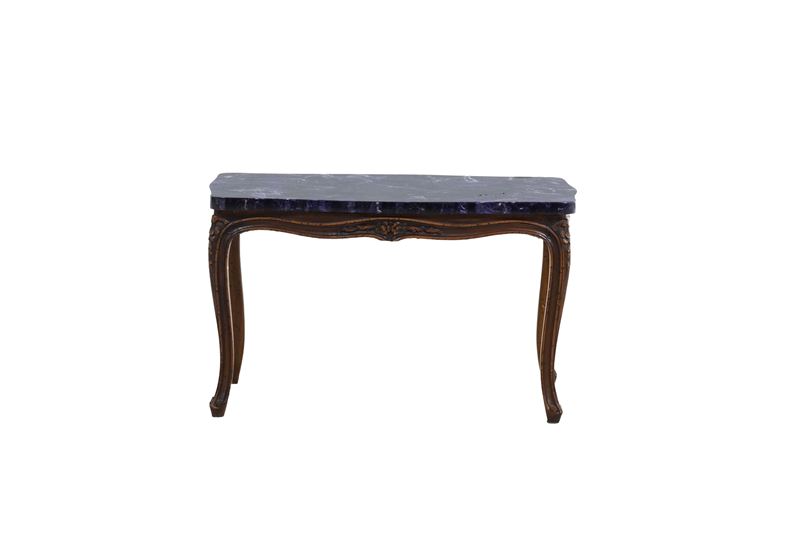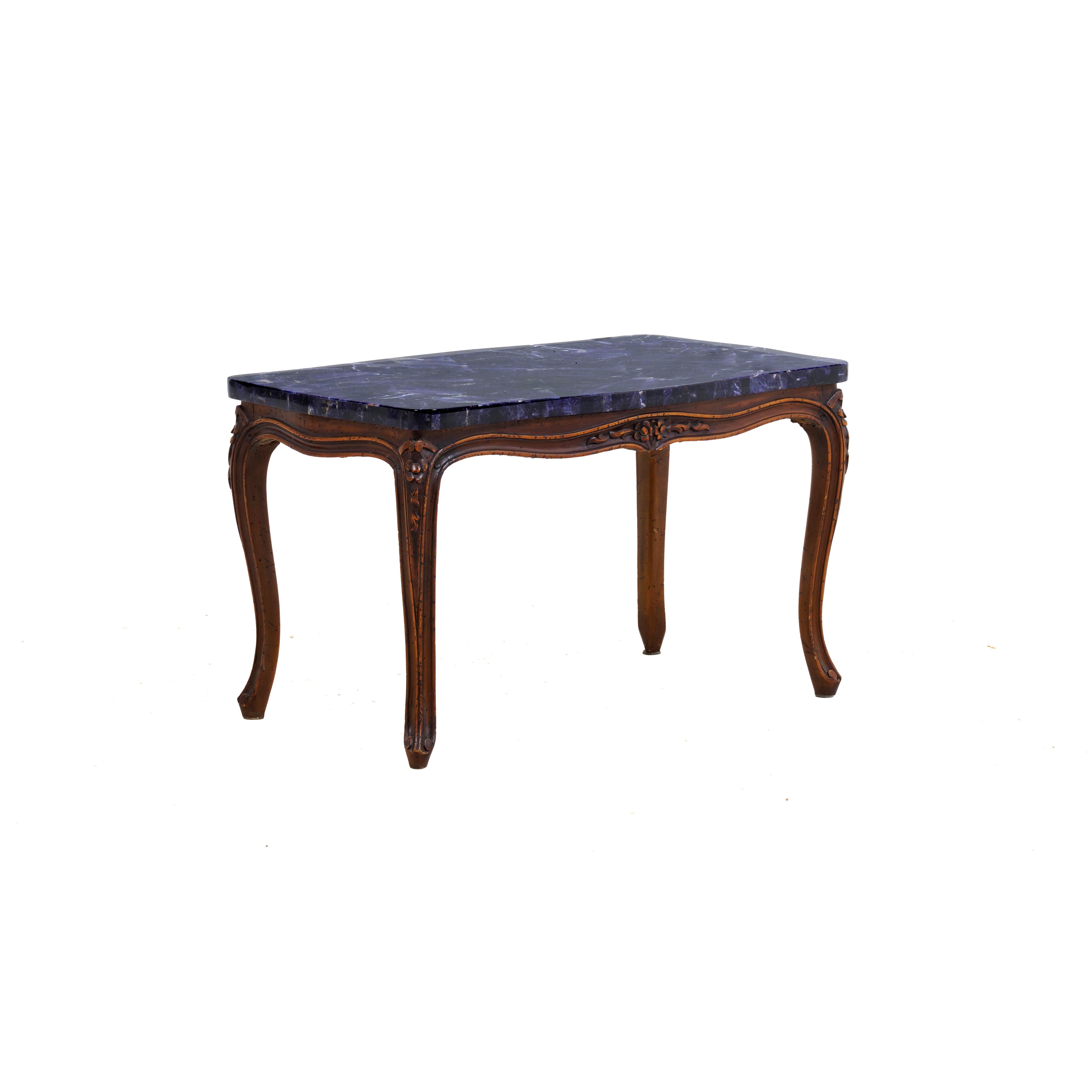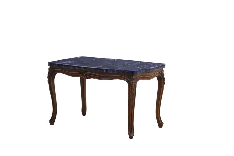 Tavolo basso in legno con piano lastronato in marmo. XX secolo