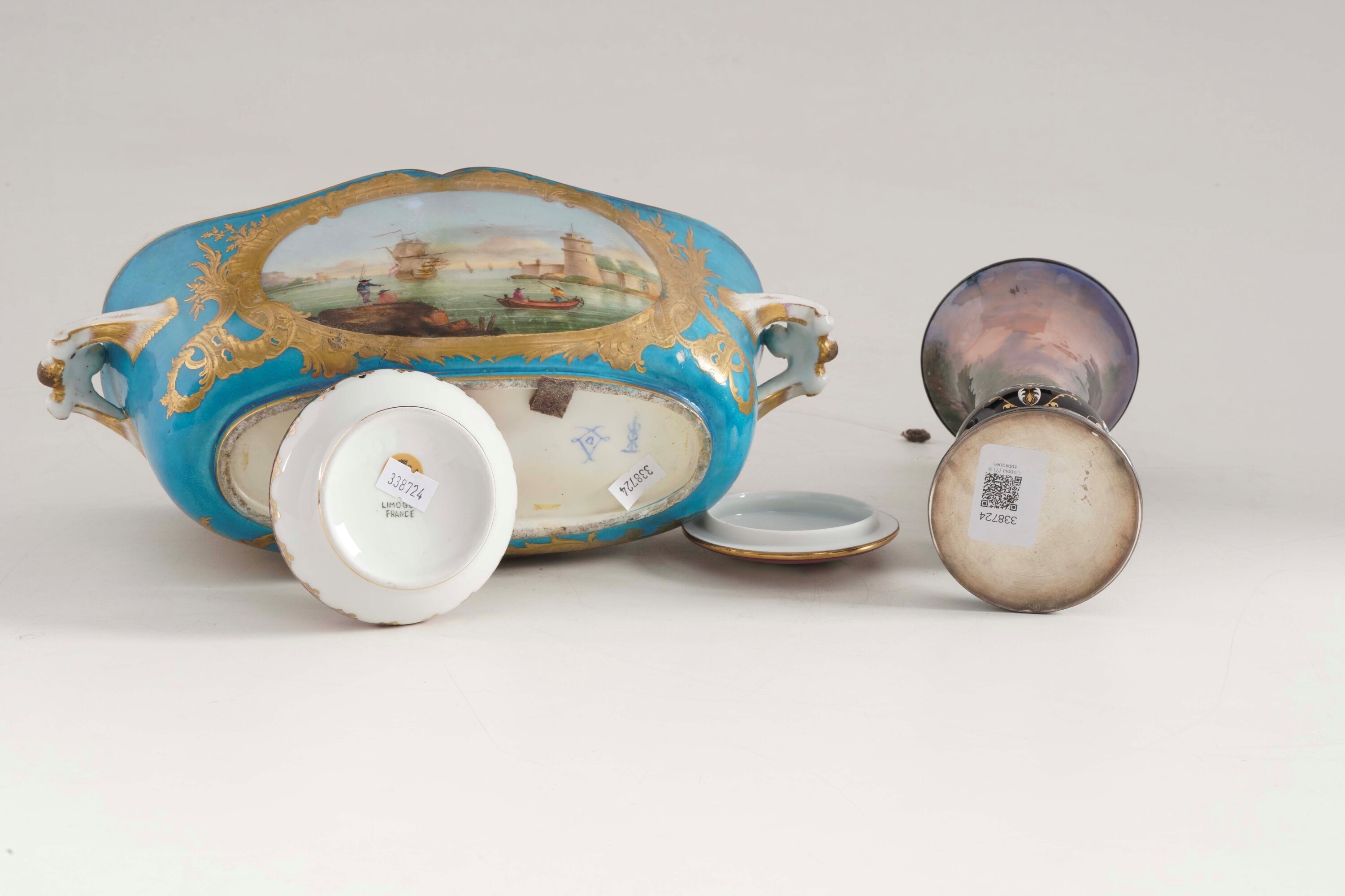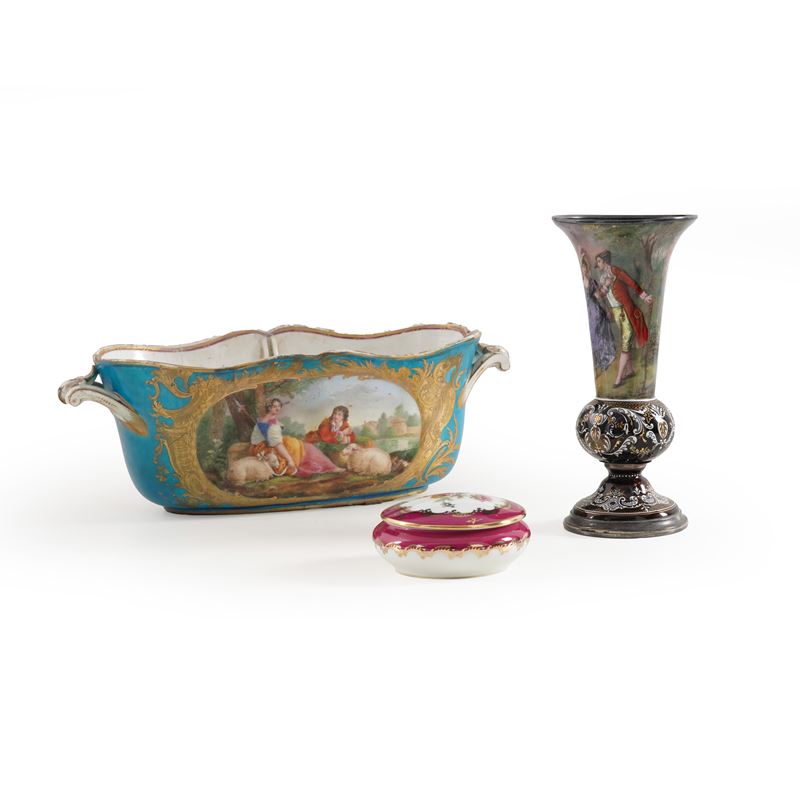 Tre oggetti diversi in porcellana e smalti: un vaso, un bicchiere e una scatola
