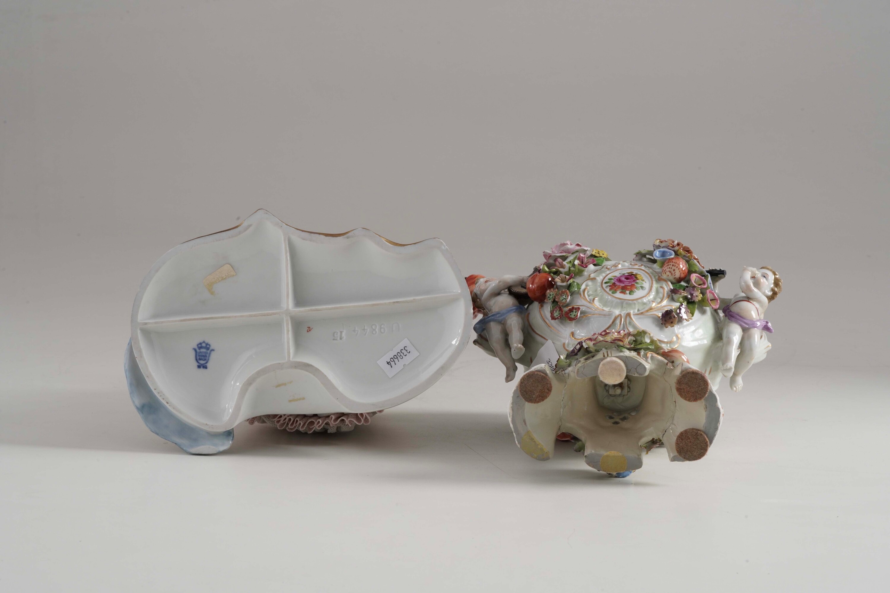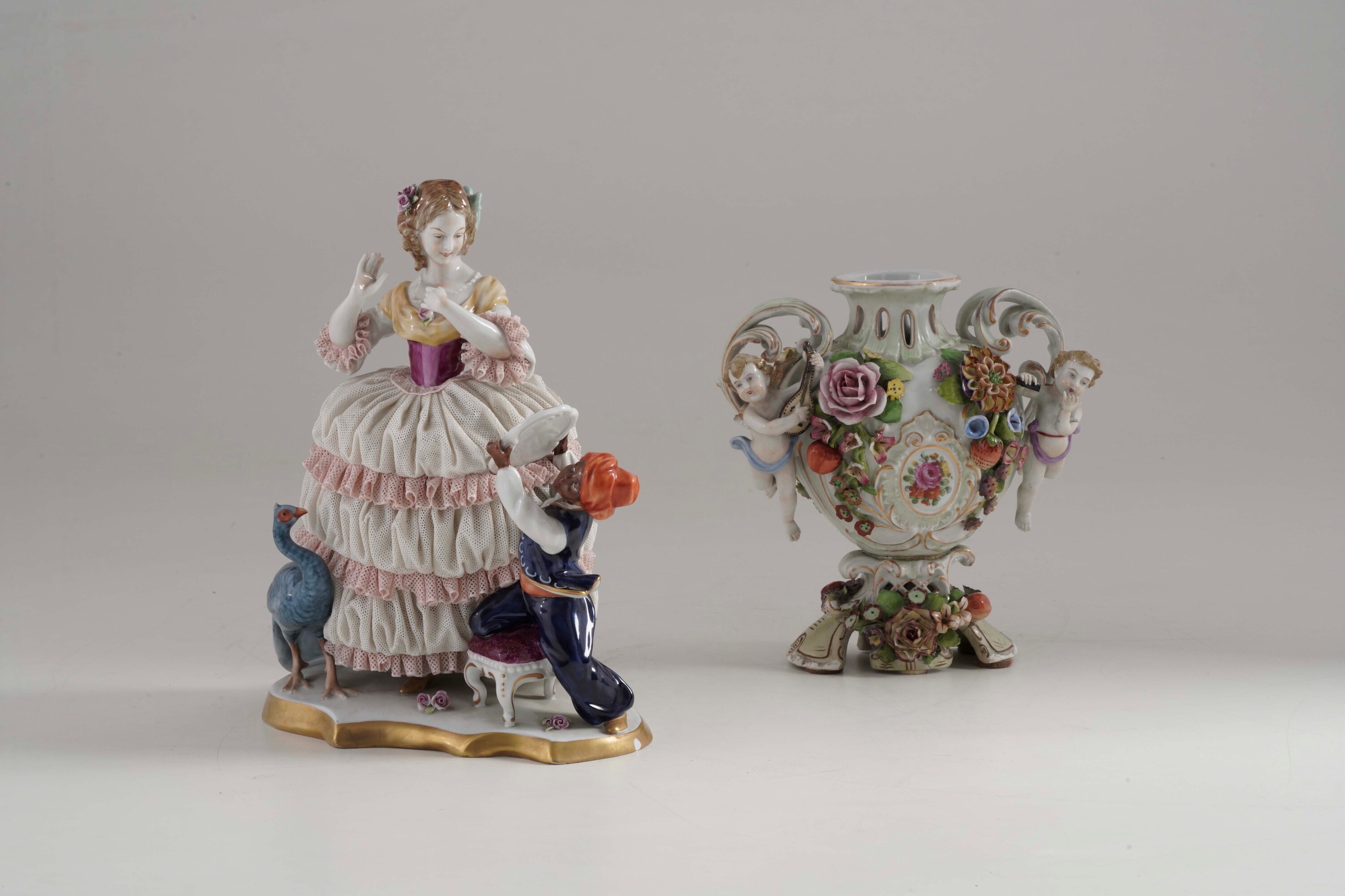 Porcellana. Marca: sotto al gruppo simbolo grafico con Unterweissbach; vaso privo di marca. Altezza massima cm 24. Conservazione: gruppo con mancanze minori, in particolare al tulle e alla cresta del pavone; vaso con parte del piede ricomposto e integrato, mancanza di due ali dei putti, mancanze minori.