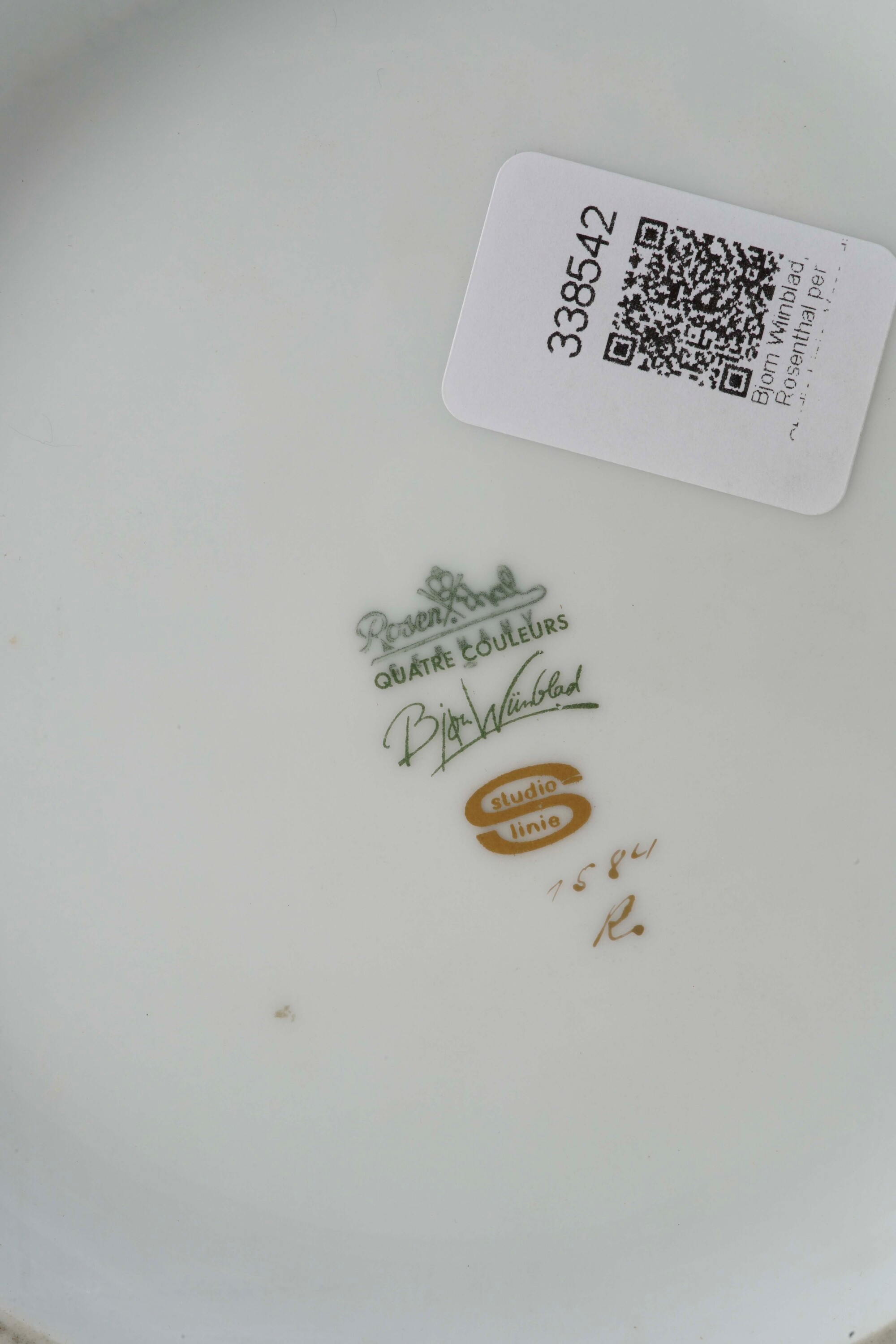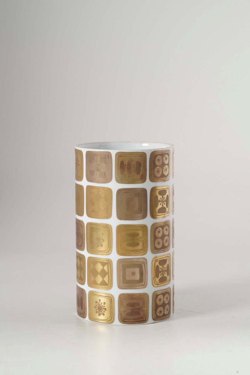 Porcellana dorata. Marca: simbolo grafico di Rosenthal con “Bjørn” in verde; “S” e “Studio Linie” in oro. Dimensioni: altezza cm 28,5; diametro cm 16,5. Conservazione: ottima; qualche striatura all’oro.