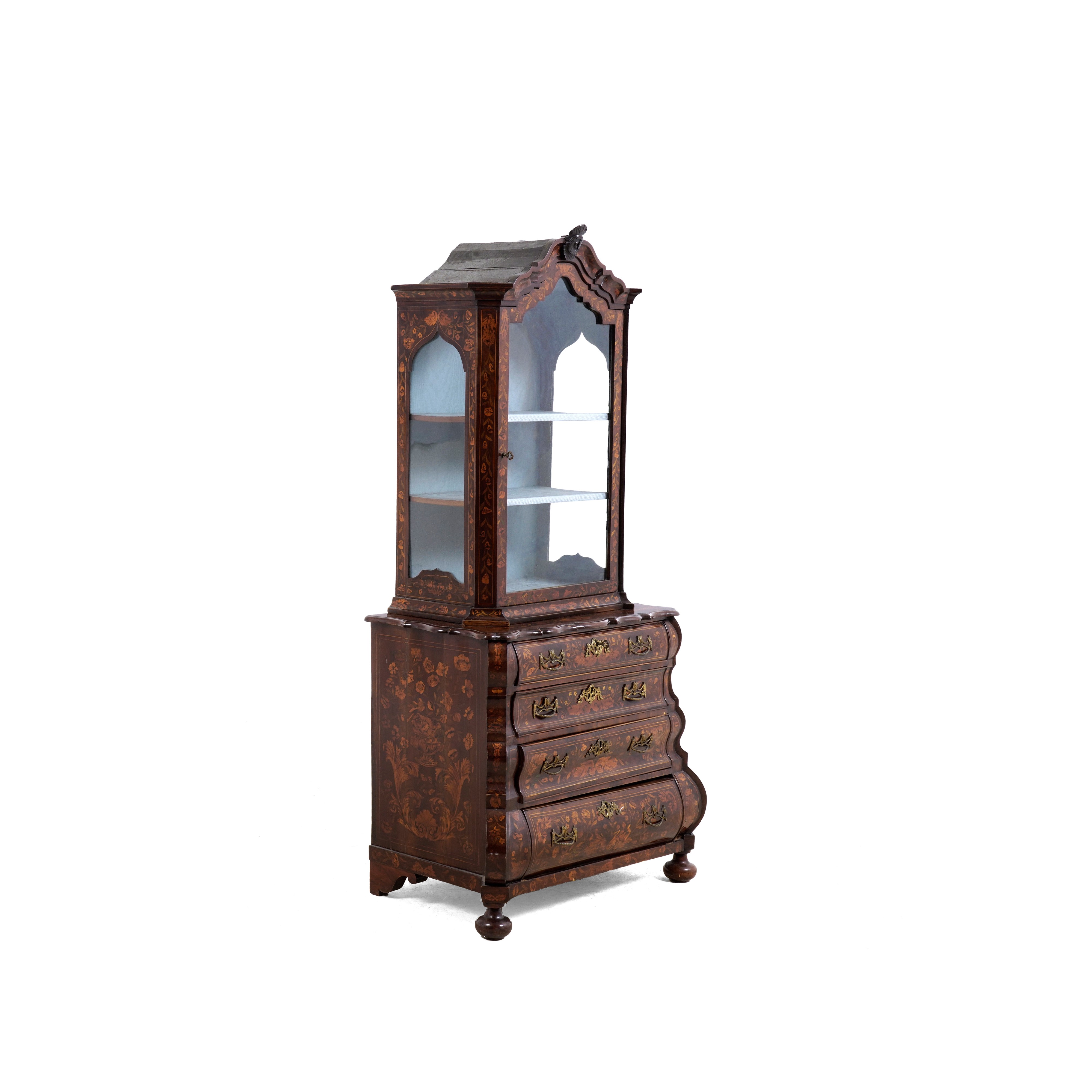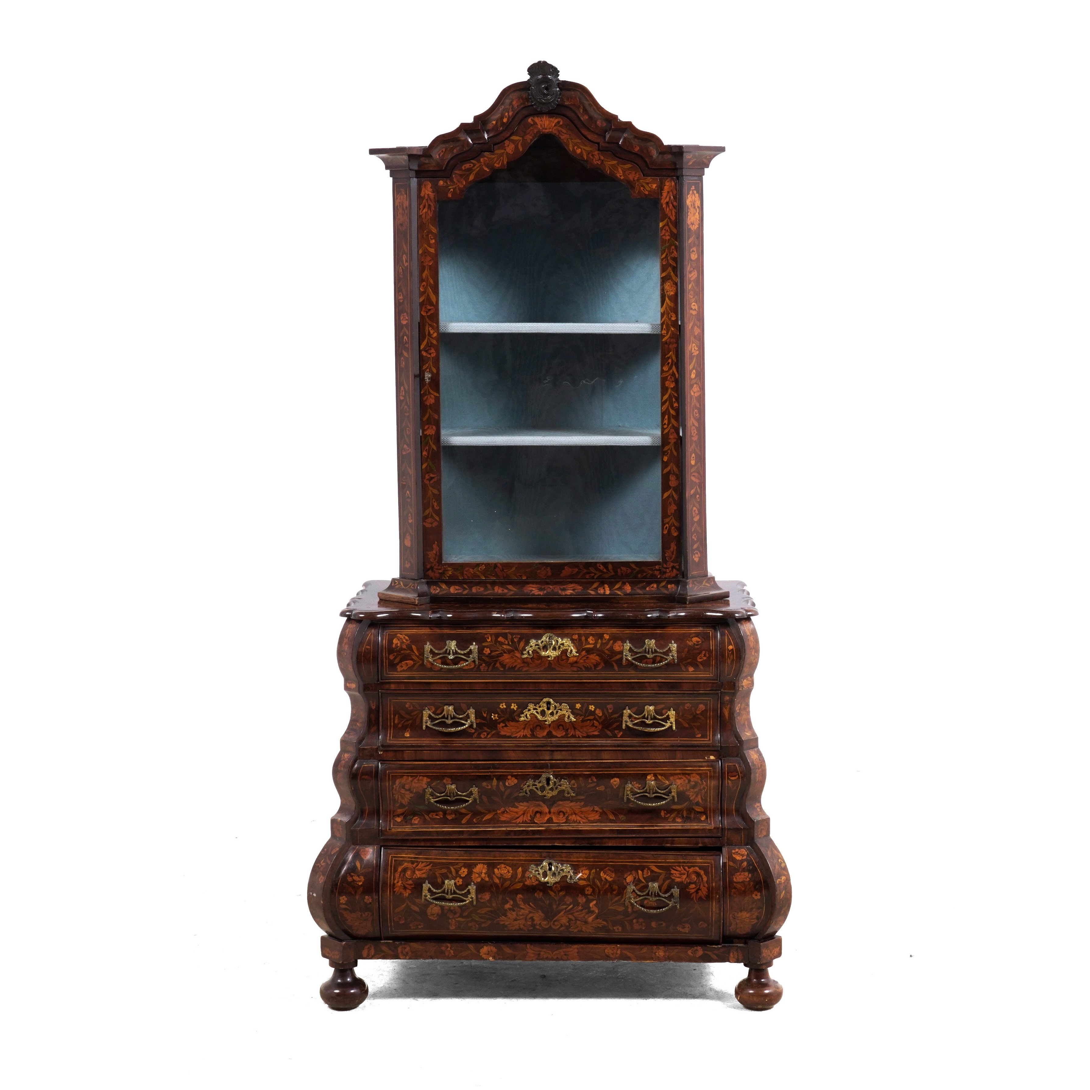 Cassettone con alzata a vetrina, riccamente intarsiato