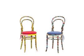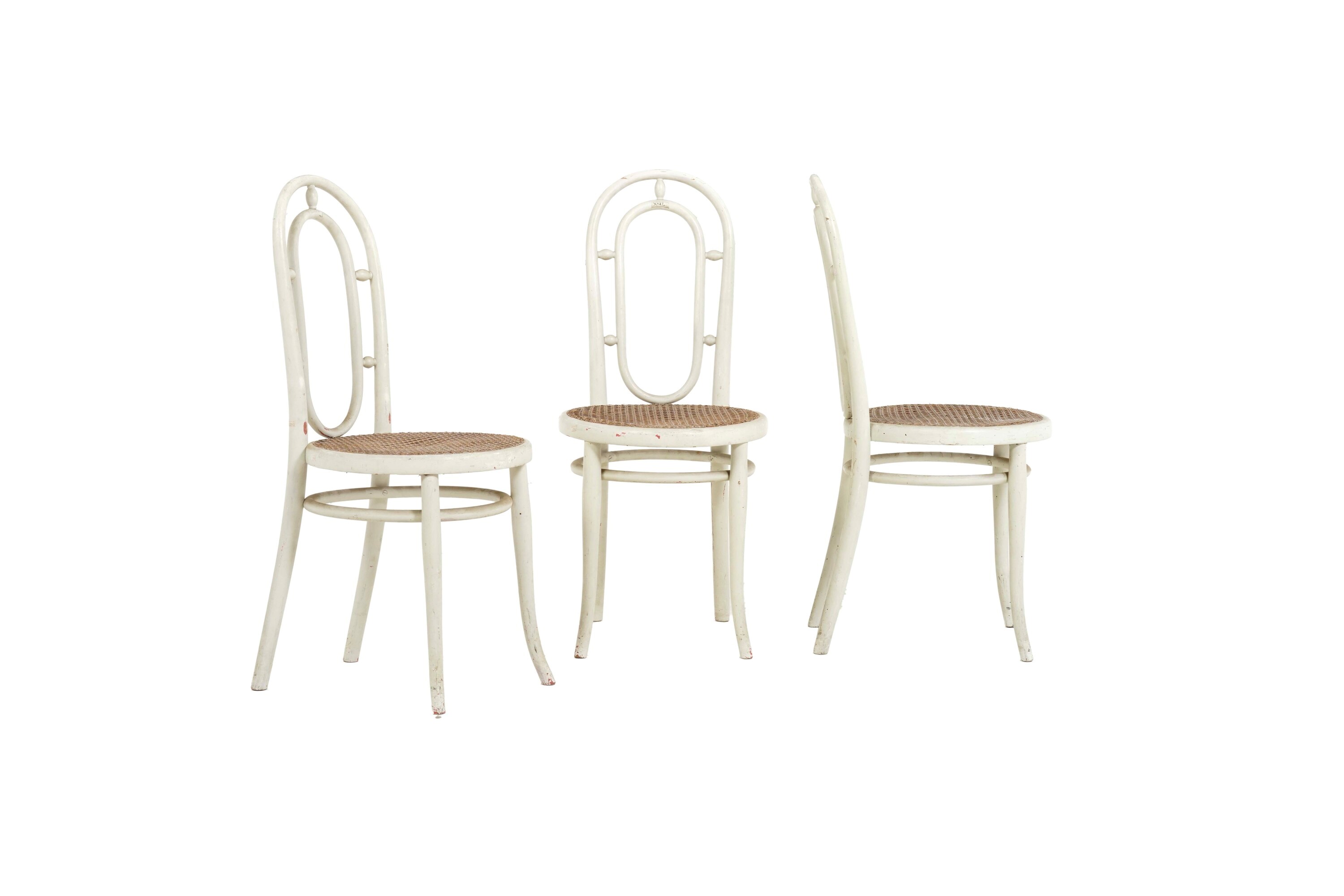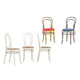 Tre laccate con seduta impagliata e due rivestite in decoupage, pure con seduta impagliata