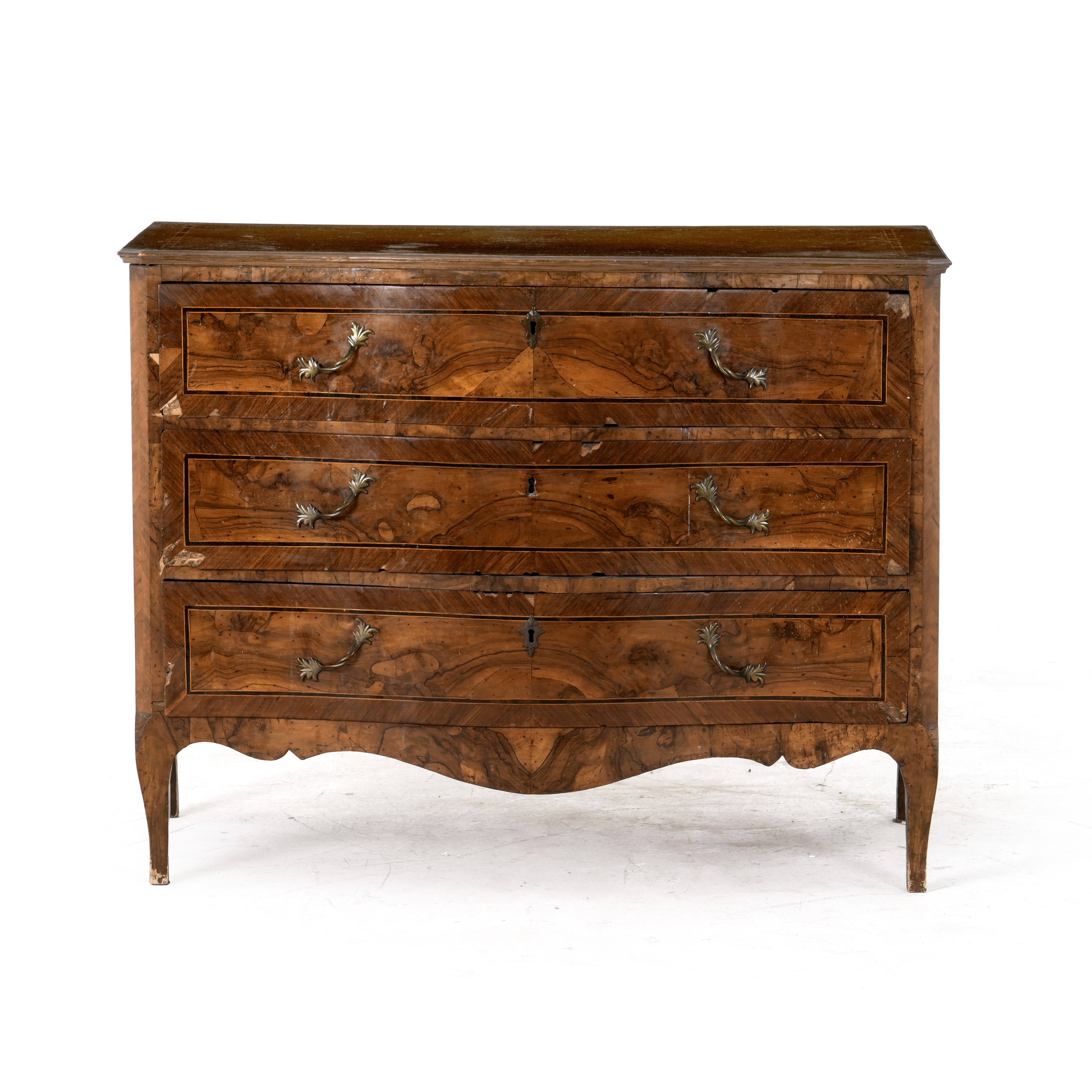 Comò lastronato in radica a 3 cassetti. XVIII-XIX secolo