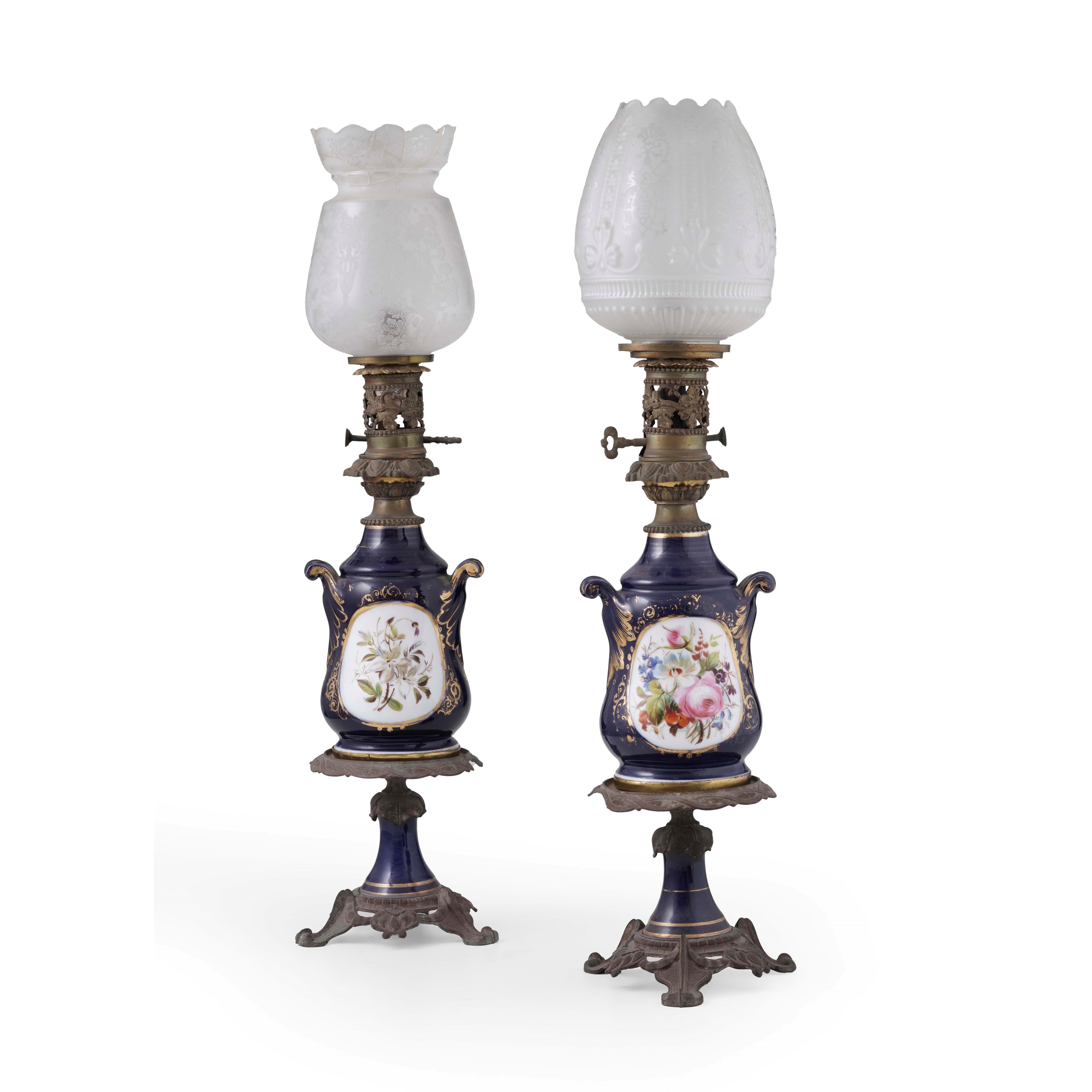 Coppia di lumi a gas in porcellana, vetro e metallo, XIX secolo