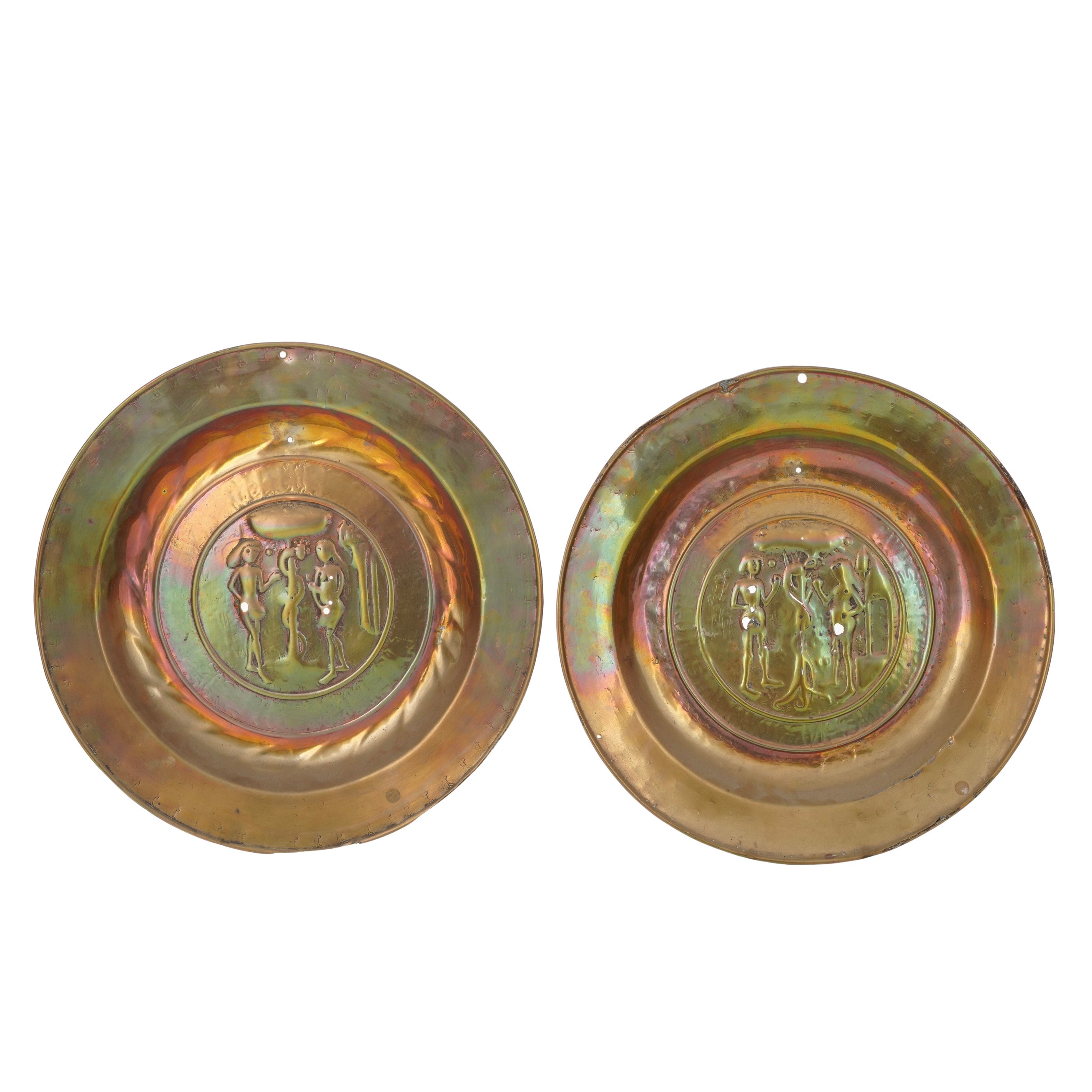 Coppia di piatti elemosinieri in ottone raffiguranti Adamo ed Eva. Europa centrosettentrionale, XVI secolo
