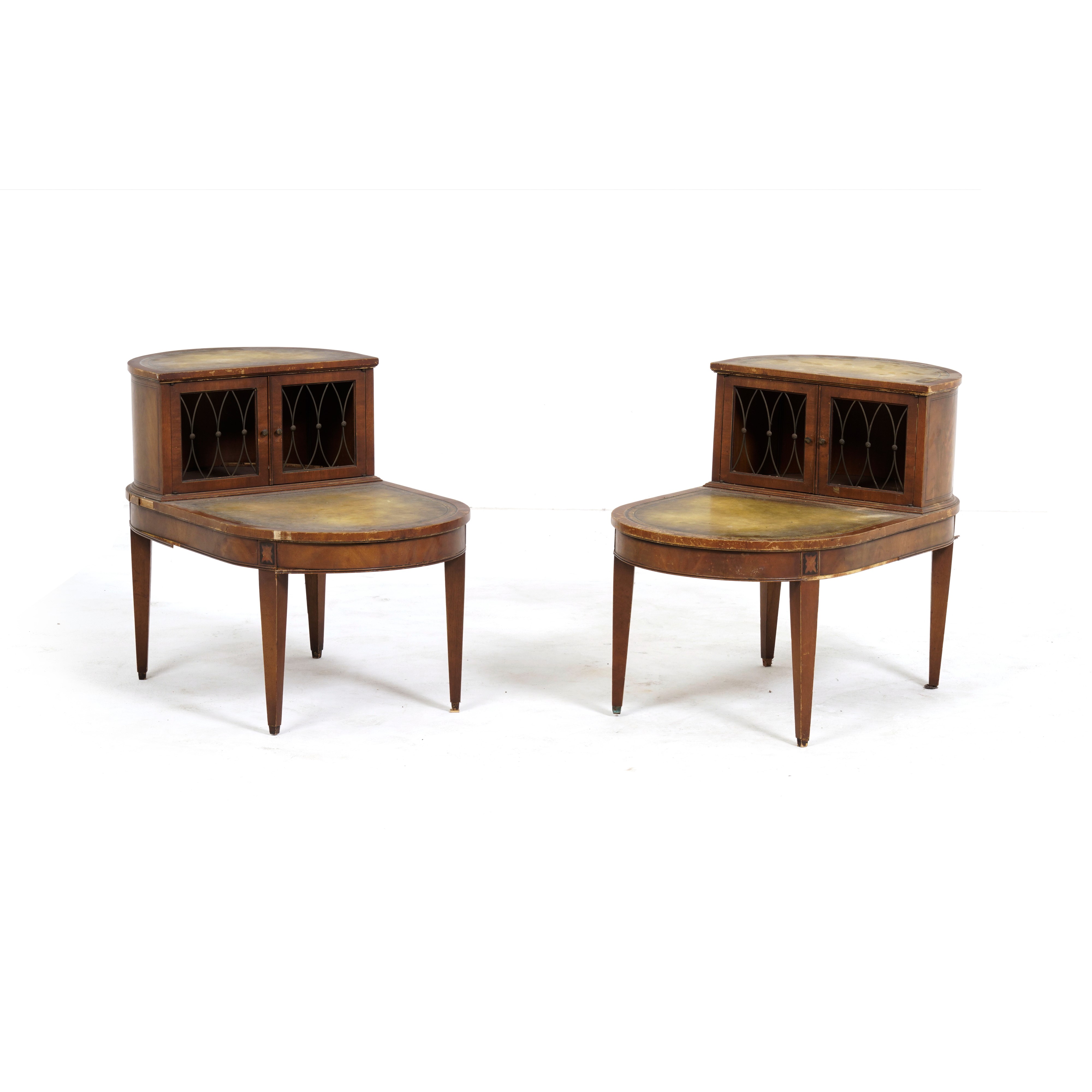 Ovali, con piani foderati in pelle, alzate con piccole librerie con ante a vetri, gambe rastremate