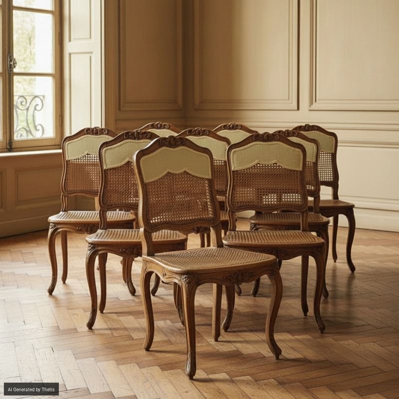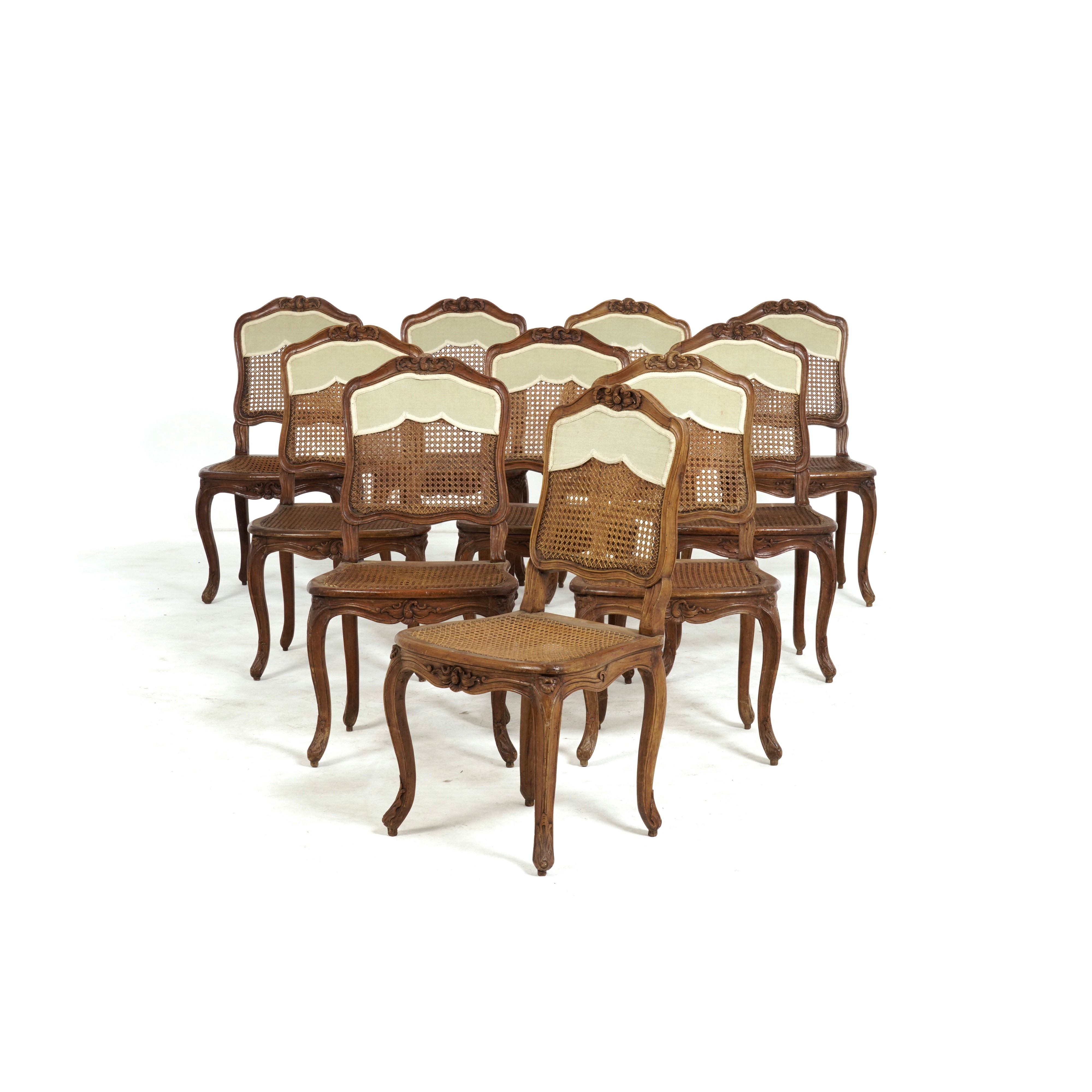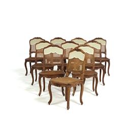 Gruppo di dieci sedie in legno intagliato. Francia, XVIII secolo