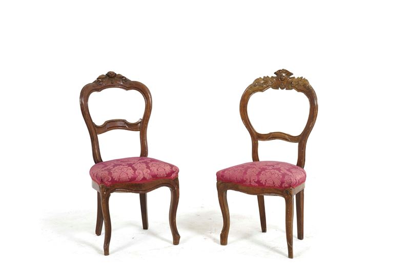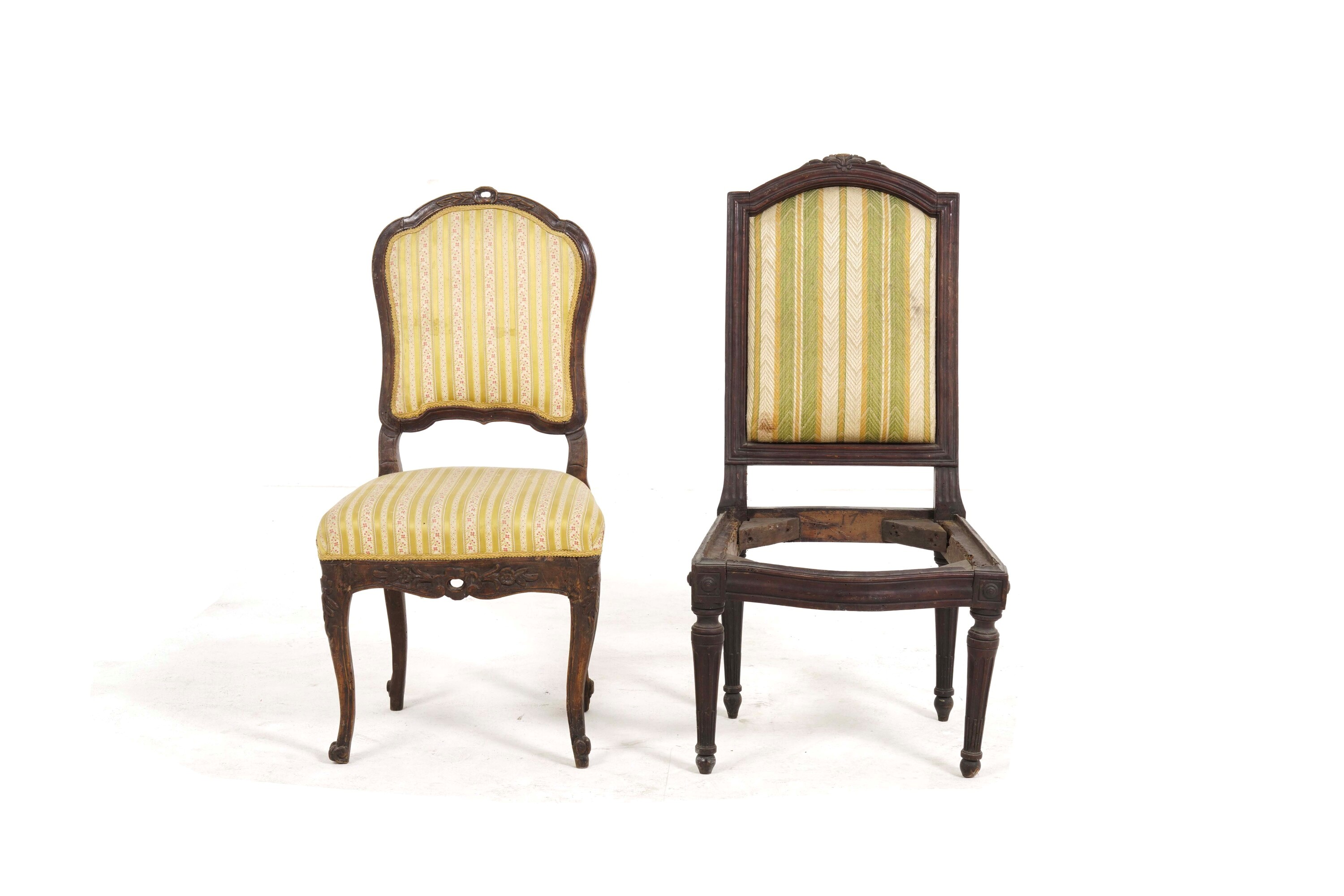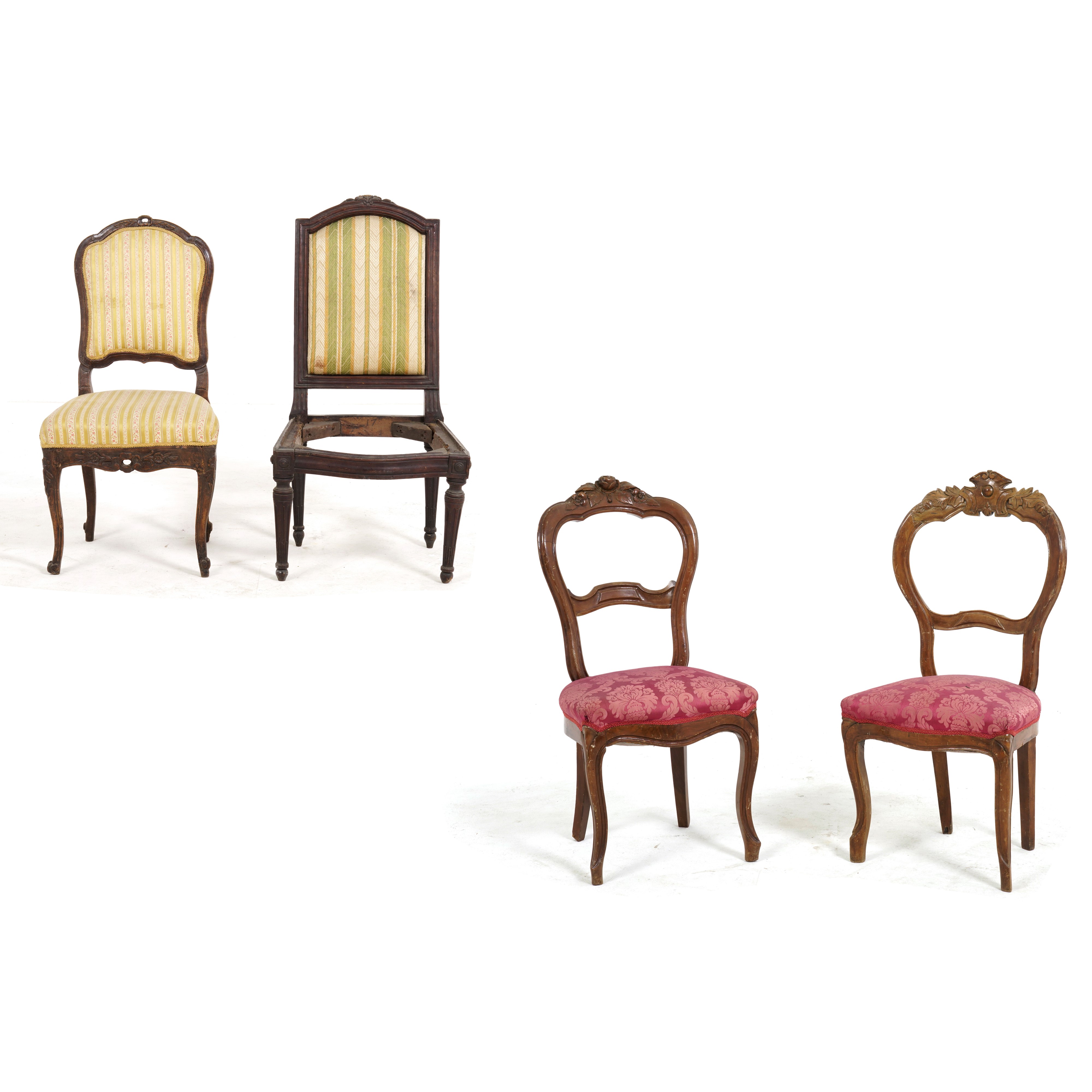 Una sedie imbottita Luigi XV con gambe mosse e schienale mosso, una Luigi XVI con gambe troncoconiche scanalate e schienale sagomato (priva di seduta), una coppia di sedie con gambe mosse, seduta imbottita e schienale a giorno