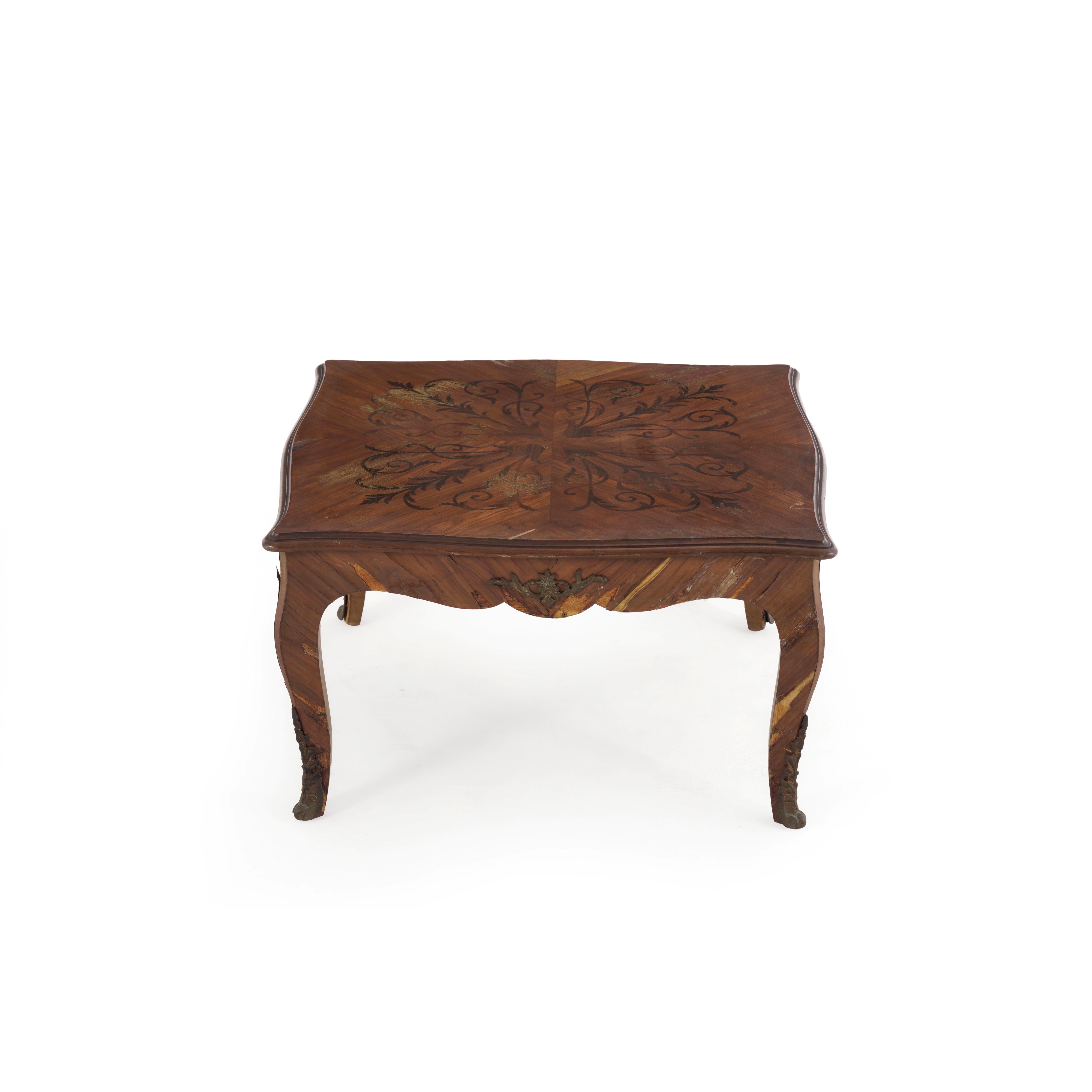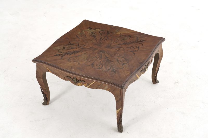 Tavolino da salotto lastronato e intarsiato. XX secolo