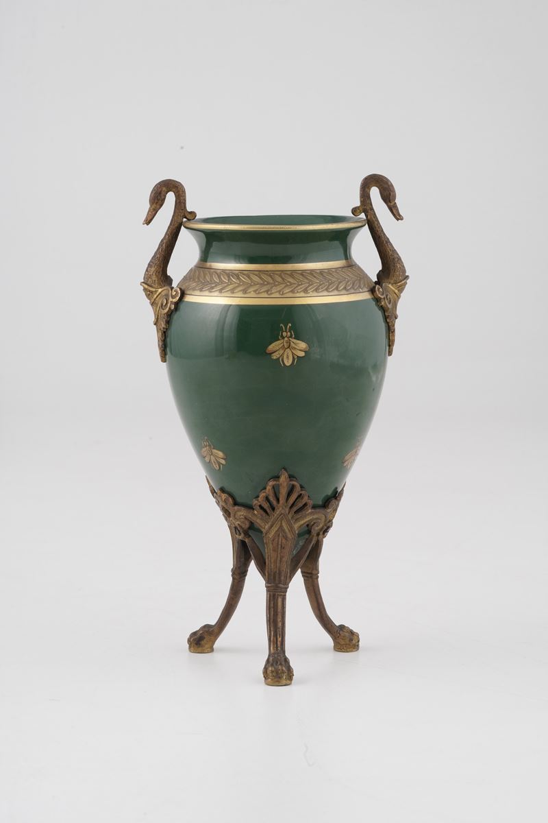 anse a cigno e base tripode in bronzo dorato e cesellato