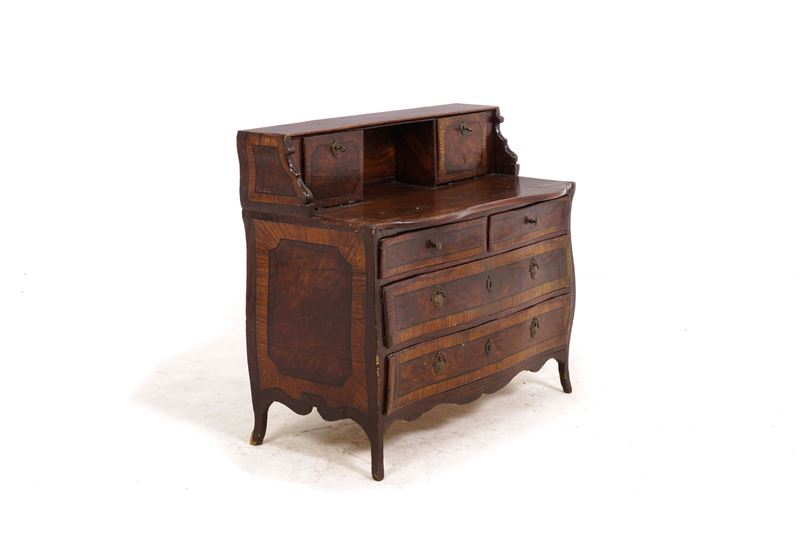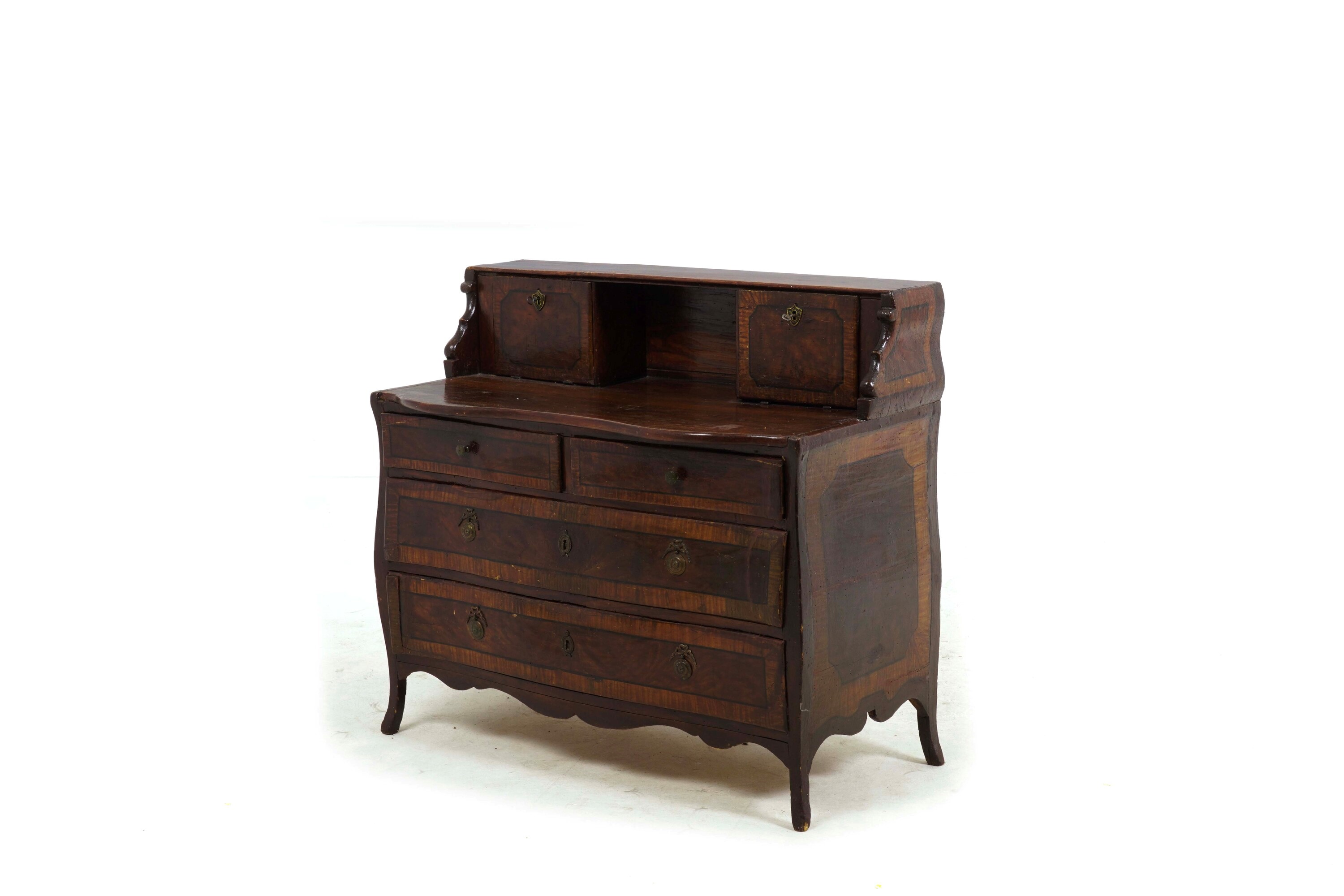 fronte mosso a due cassetti grandi e due piccoli affiancati; alzata con vano a giorno e due piccole ante