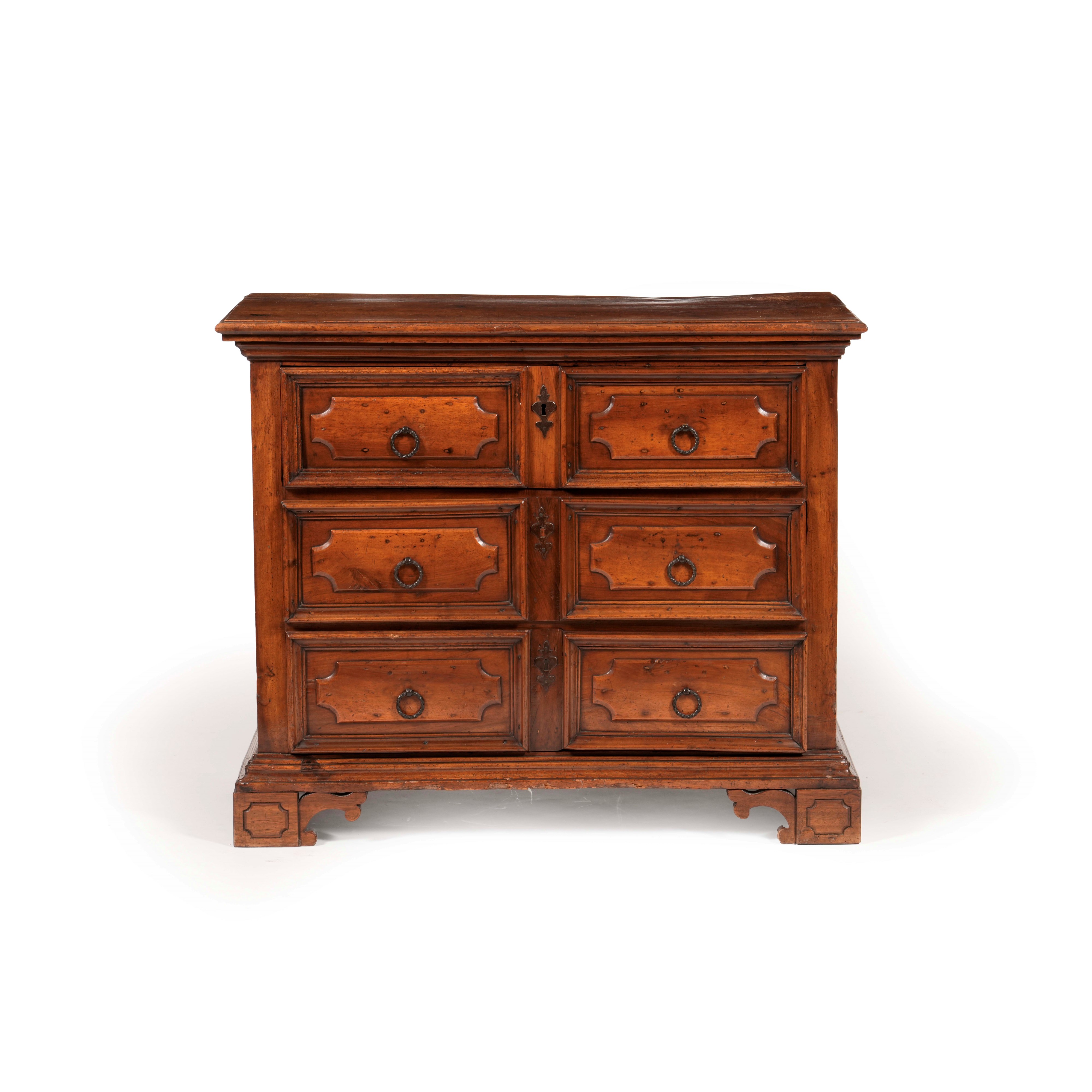 Tre cassetti sul fronte decorati da formelle sagomate, piedi a mensola