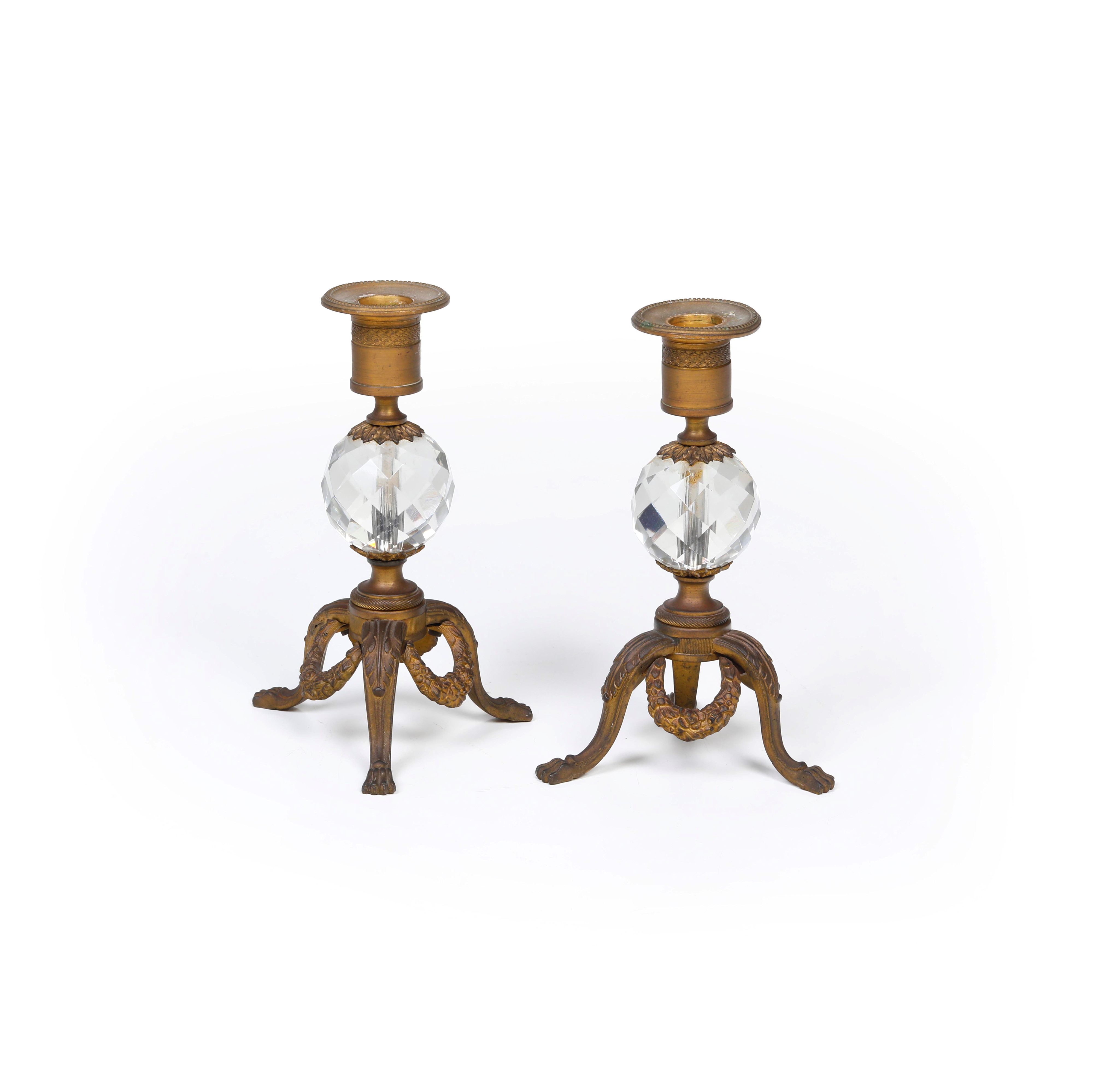 Coppia di candelieri in bronzo dorato e cristallo. XIX-XX secolo