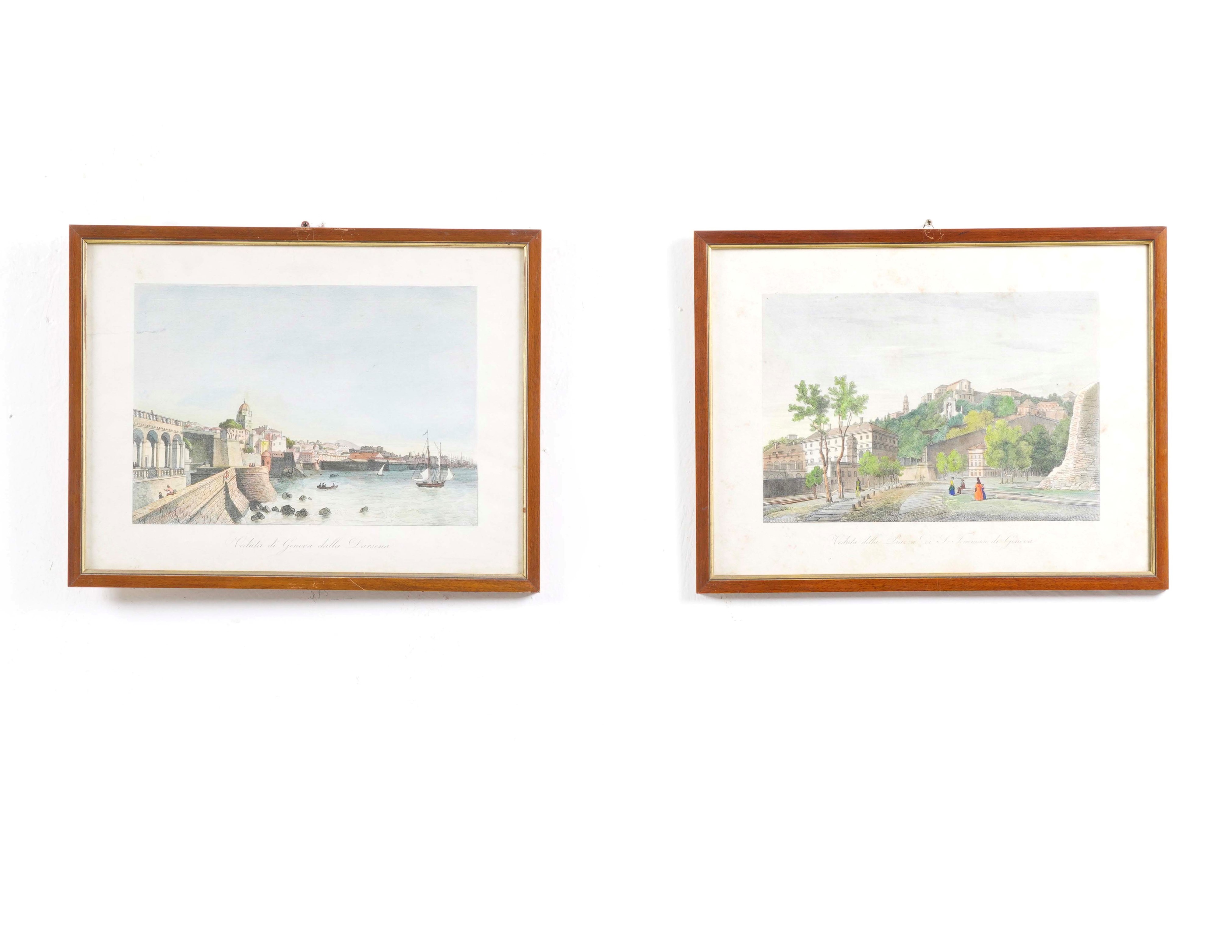 Coppia di incisioni colorate con vedute di Genova. Entro cornici