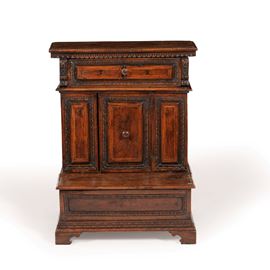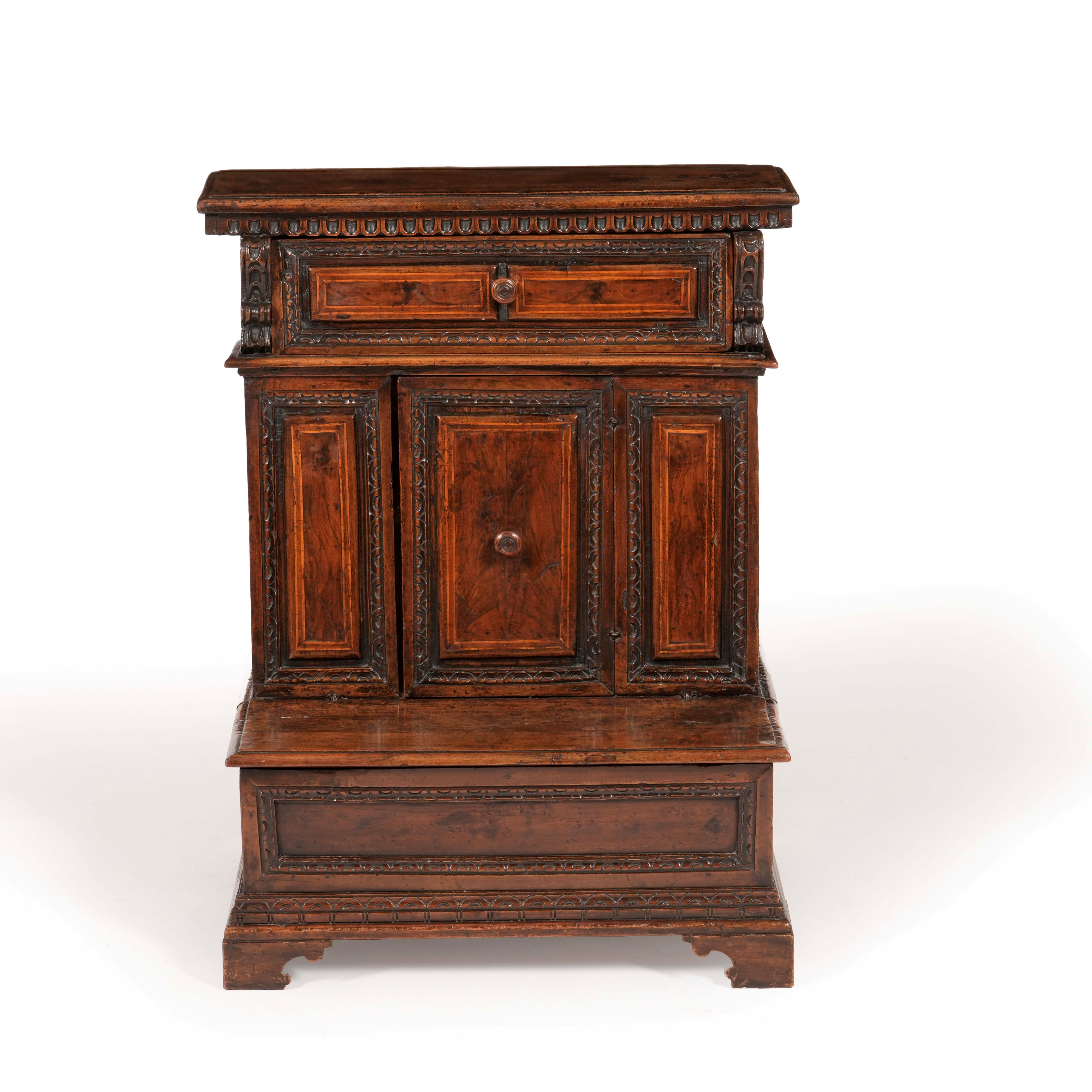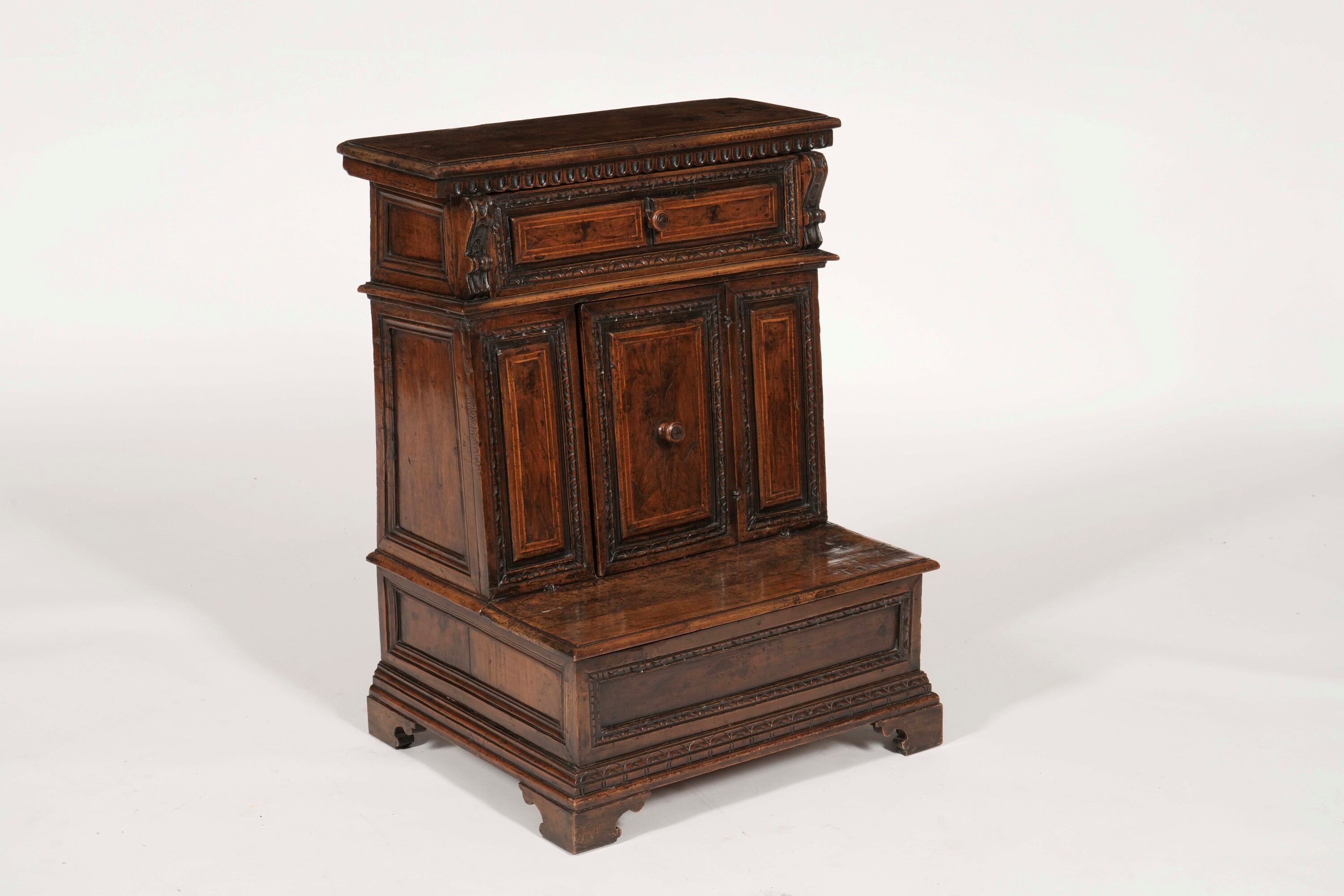 Noce intagliato. Fronte pannellato a un'anta sormontata da cassettino, piani modanati, piano inferiore apribile a ribalta