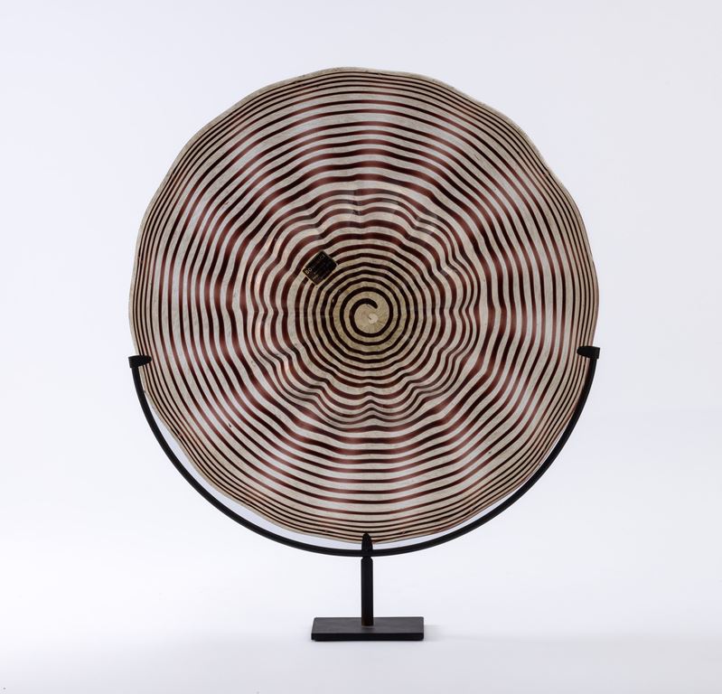 Piatto in vetro soffiato con decoro di spirale ametista e avventurina con centro baccellato.