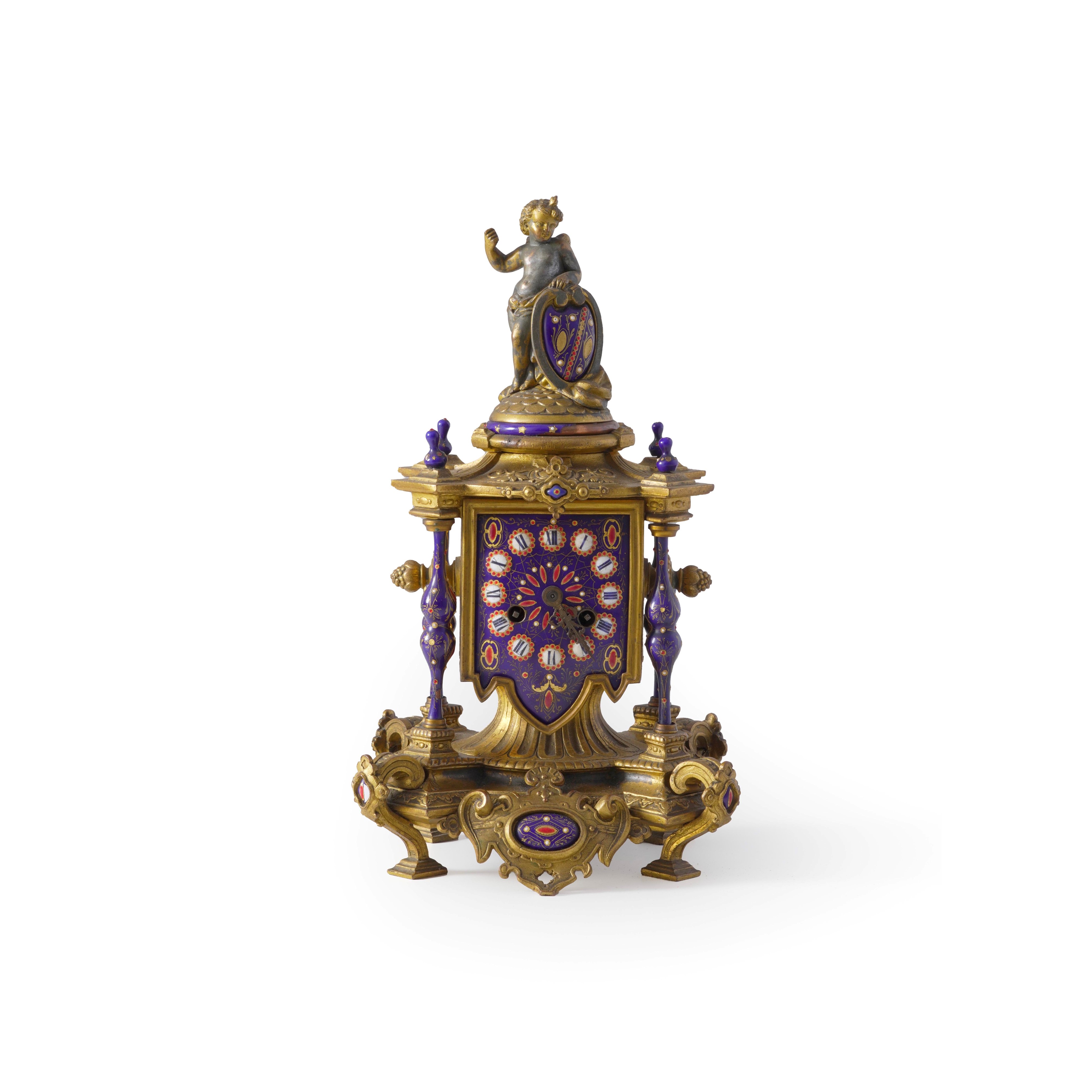 Orologio da tavolo in metallo dorato e smalti. XIX-XX secolo