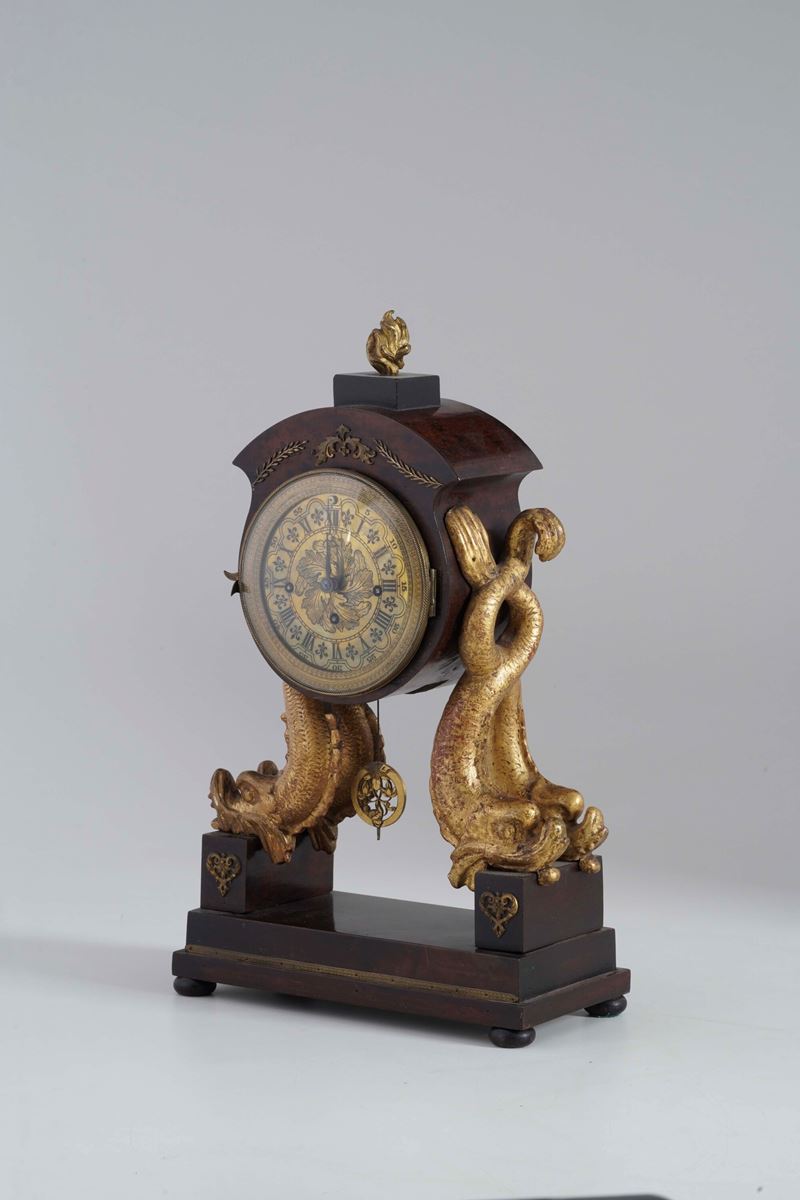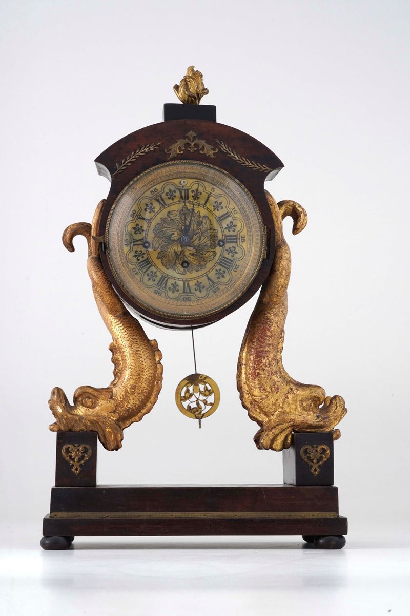 Cassa lastronata, montanti in legno intagliato e dorato a foggia di delfini, cimasa a fiamma, quadrante in ottone a numeri romani per le ore e arabi per i minuti