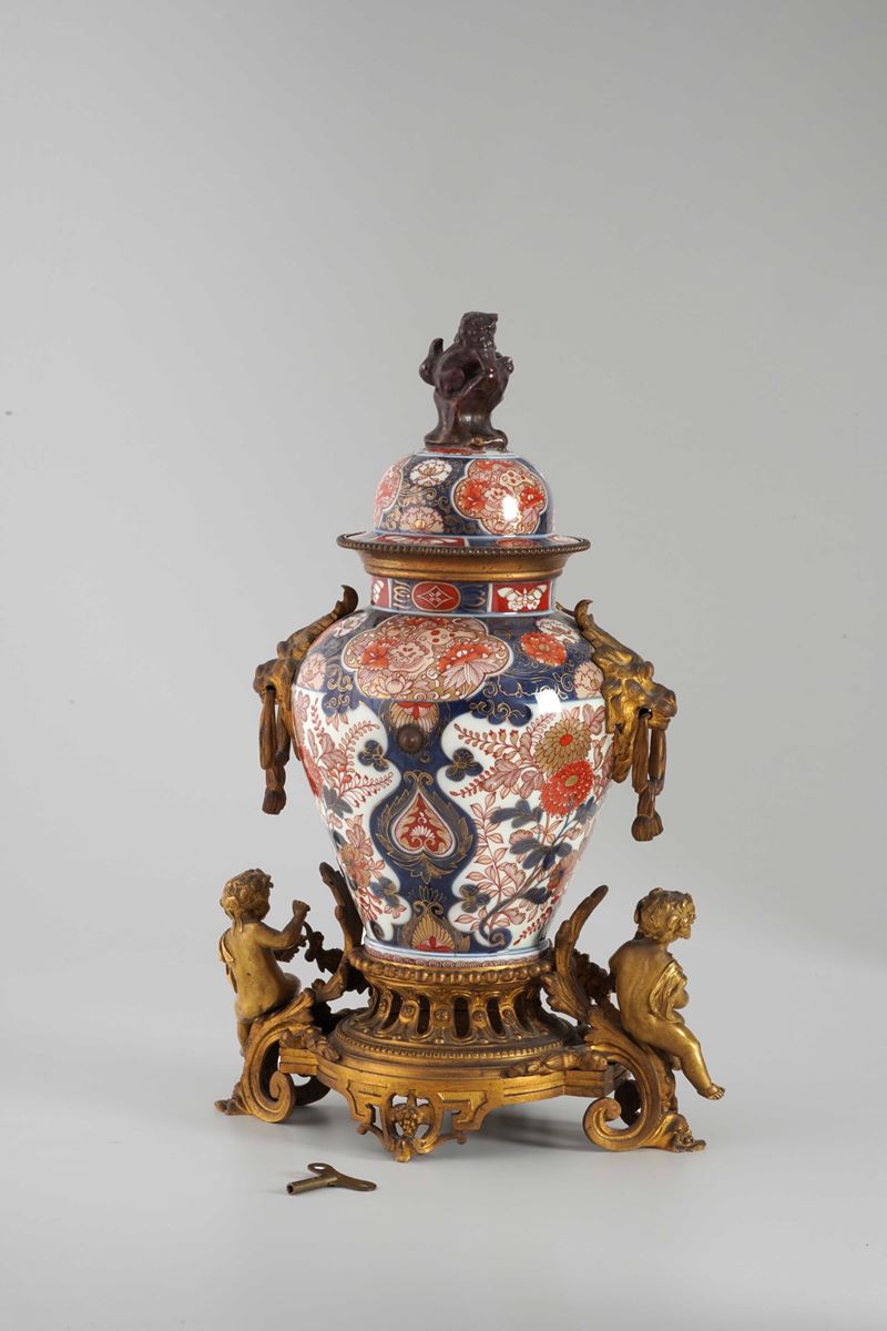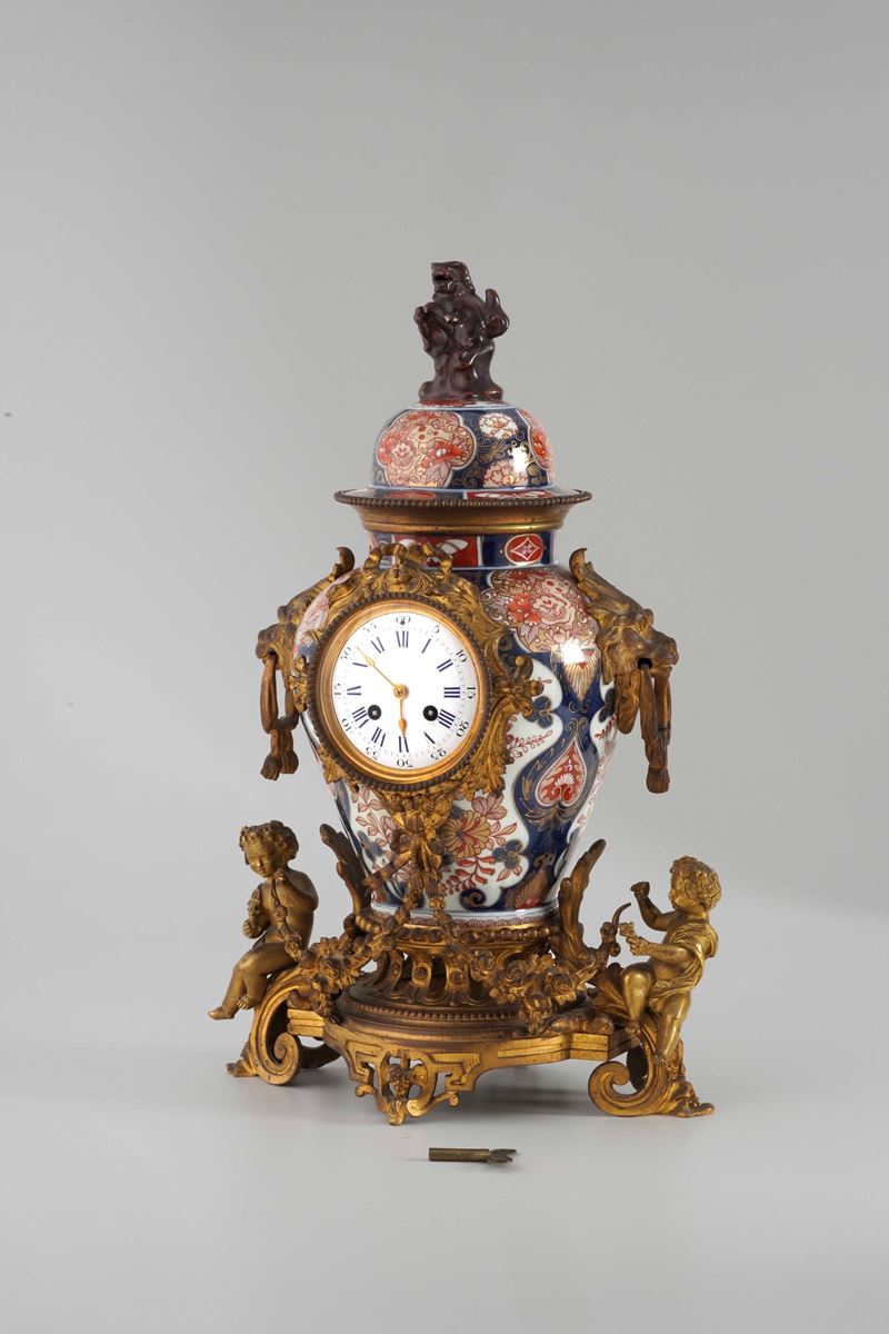 Pendola da camino in bronzo dorato e porcellana Imari. XIX secolo