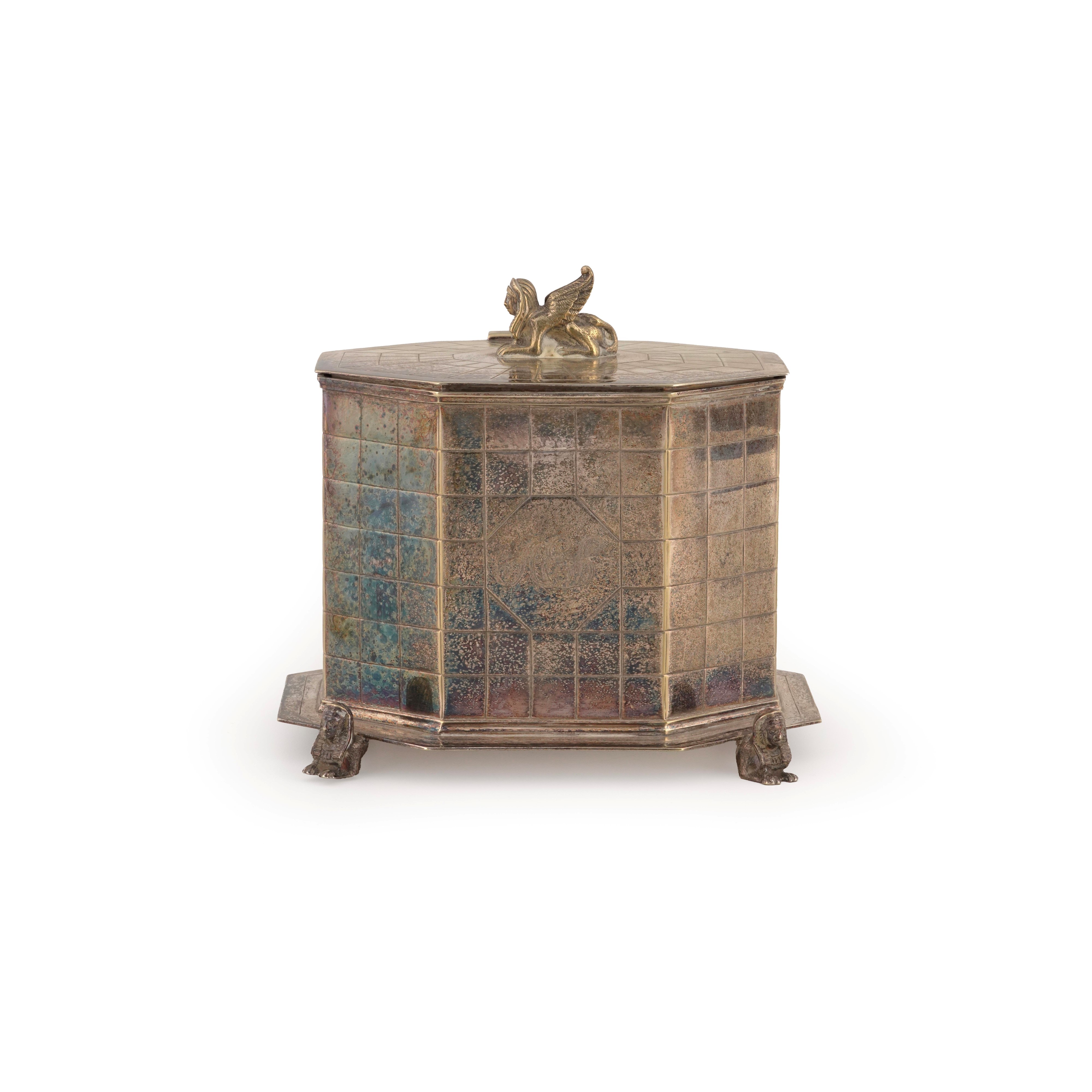 Scatola in metallo argentato di forma ottagonale con sfingi, XX secolo