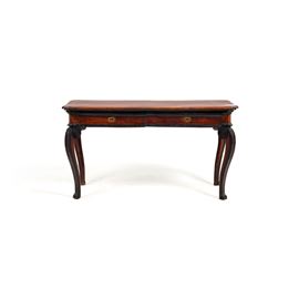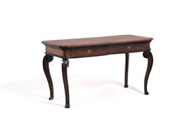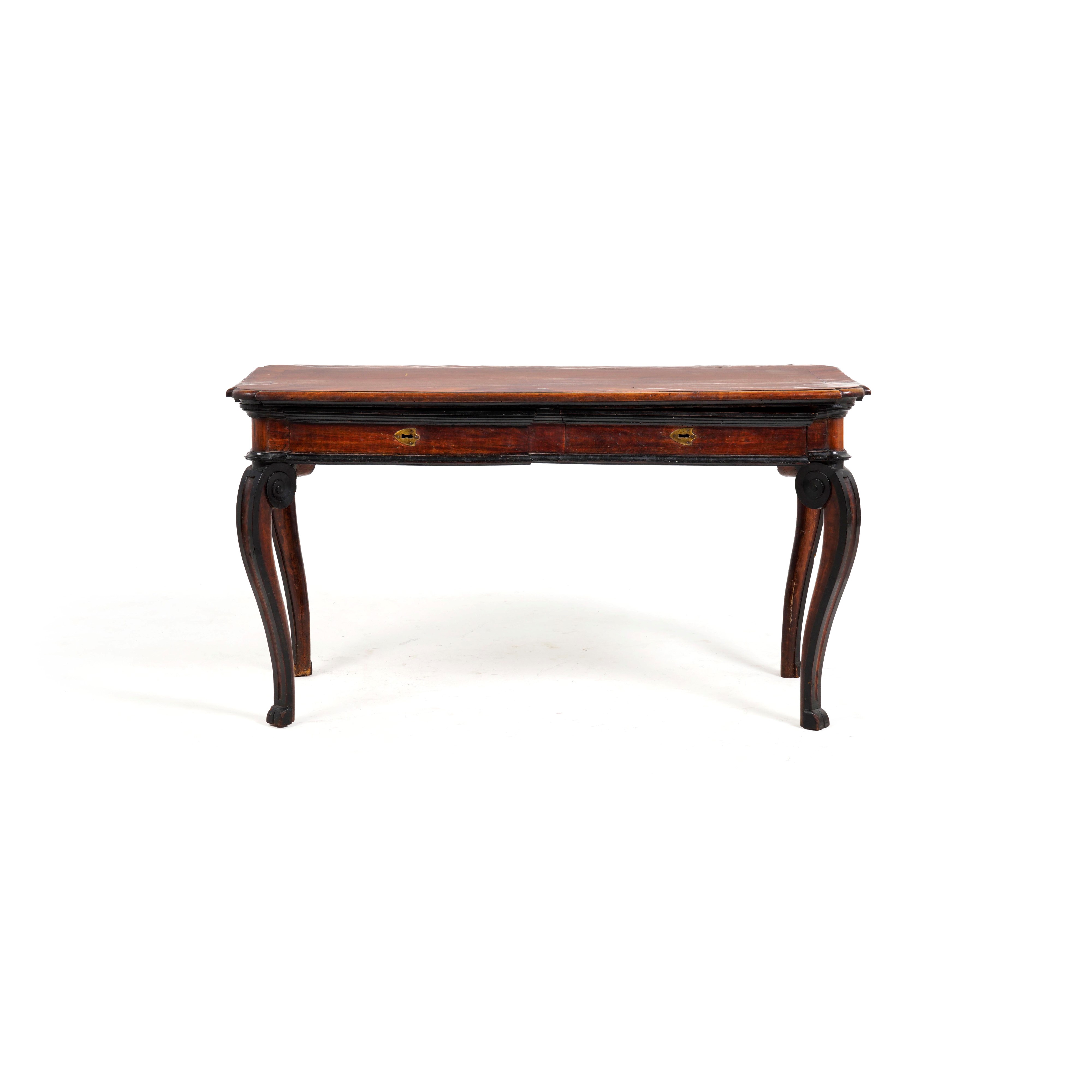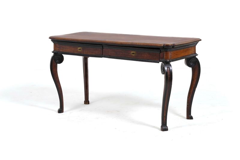 Piano con angoli smussati, due cassetti affiancati nella fascia, gambe mosse teminanti a volute, profili ebanizzati