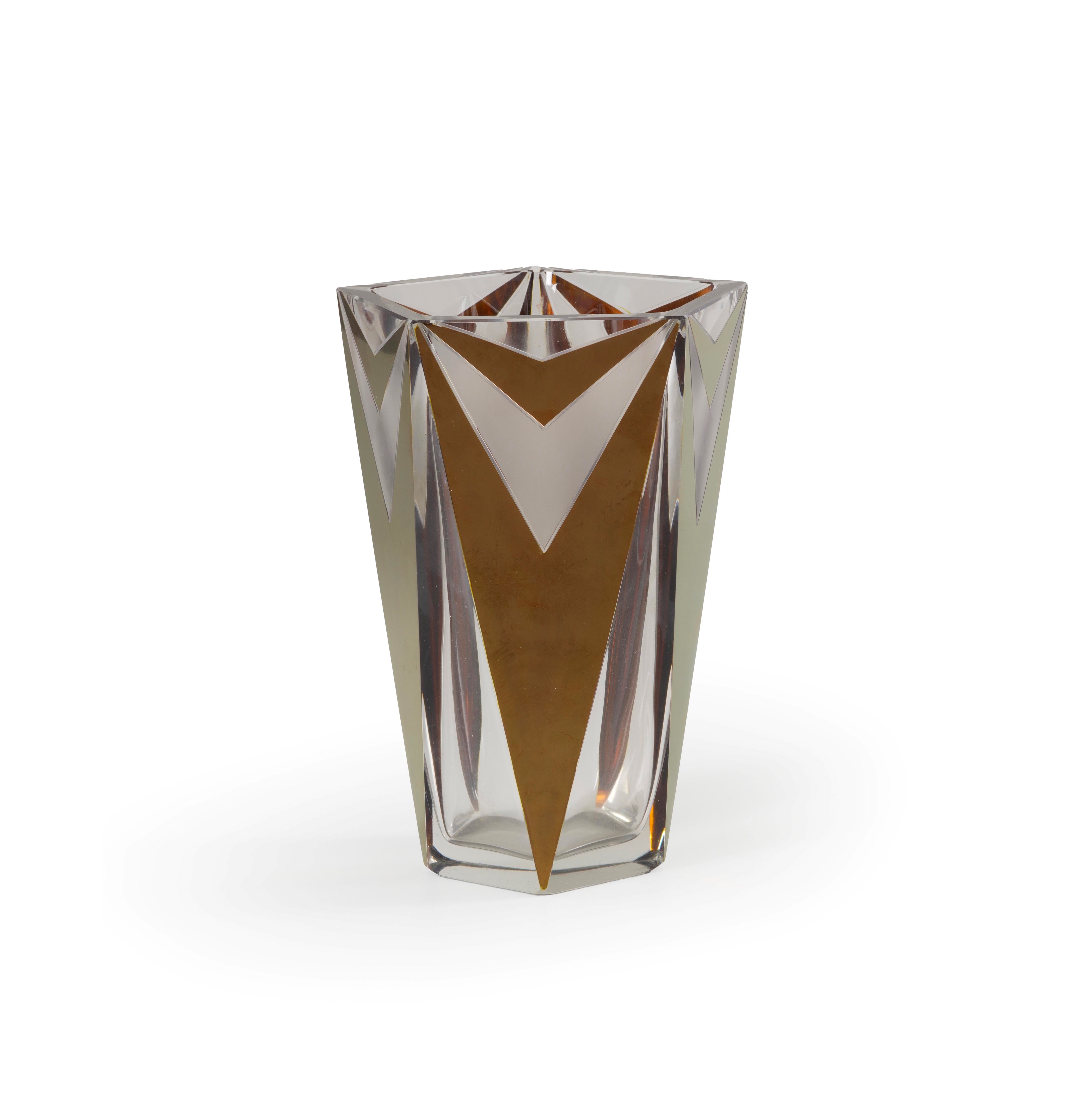 Vaso in vetro pesante a sezione pentagonale con applicazioni geometriche in ottone.